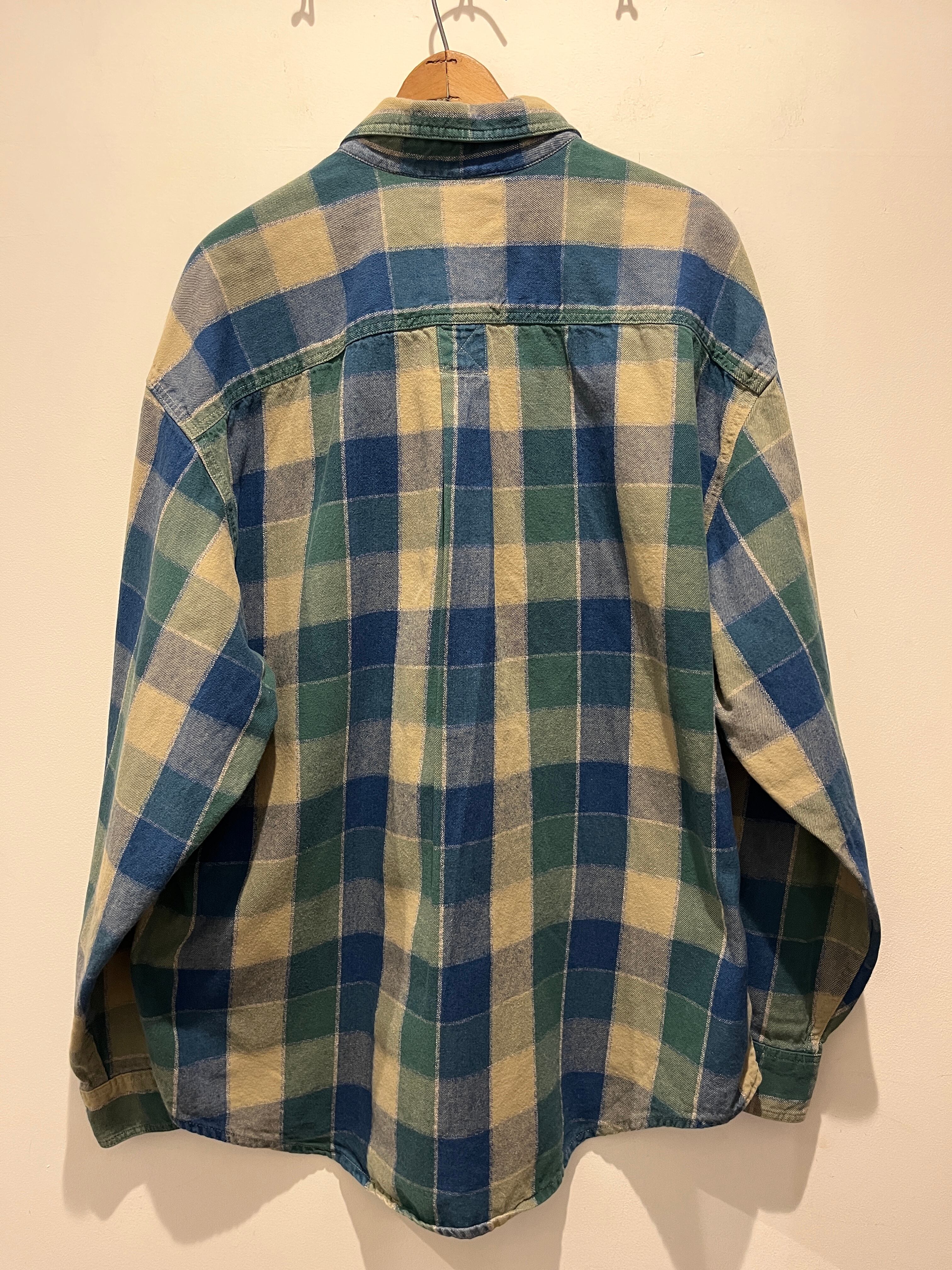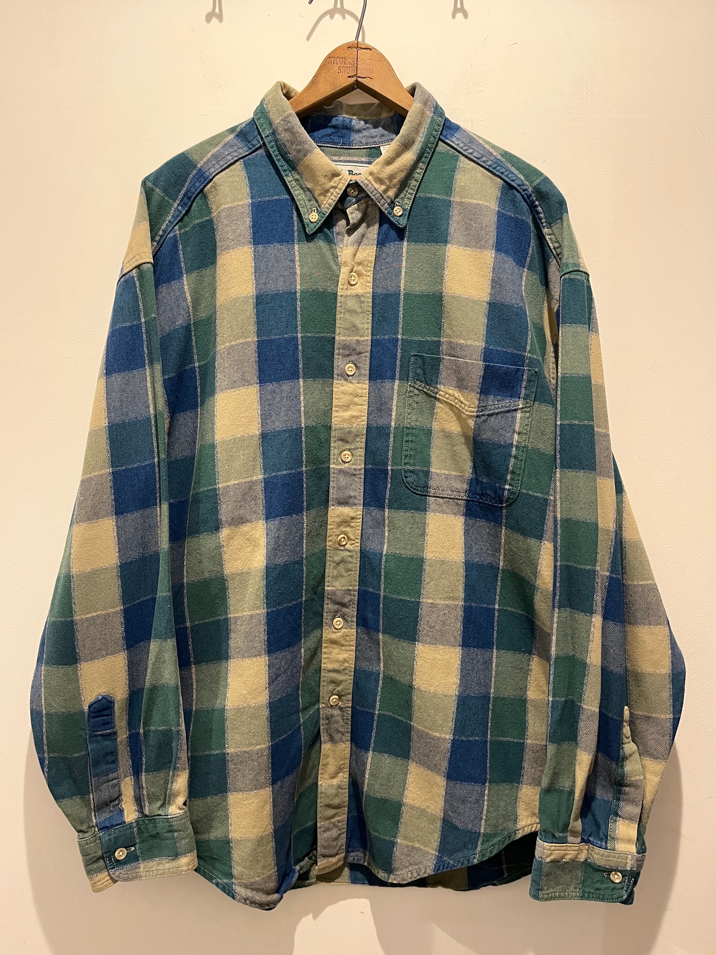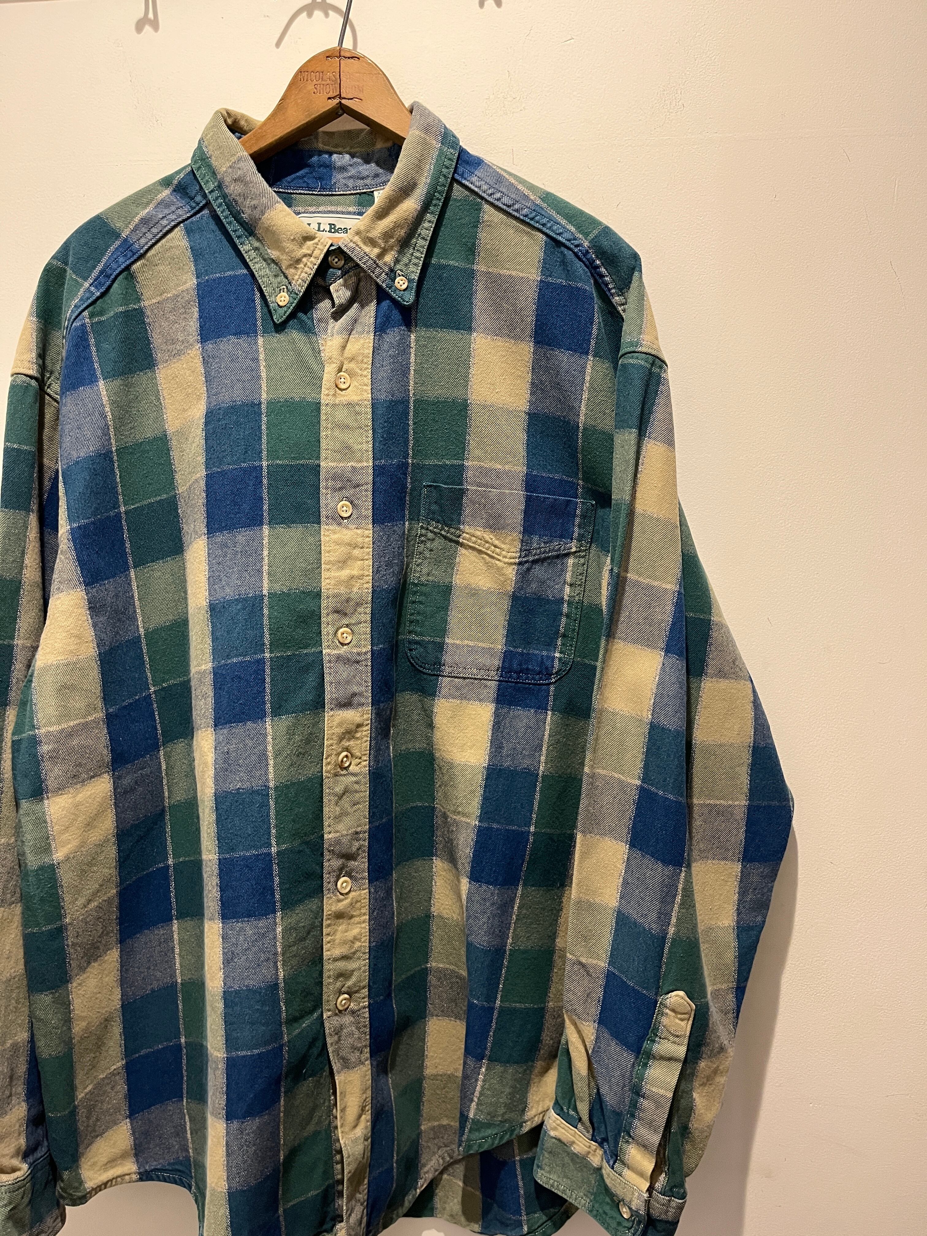 90年代アメリカ製L.L.ビーンのコットンシャツです。ブルー×グリーン×ベージュカラーと配色がとても良く、ボタンダウン仕様となります。またブルーのところはインディゴコットンを使っているのでデニム同様アタリが出て楽しめます。90年代らしく大きめな作りでコンディションも良くユニセックスでオススメです。
