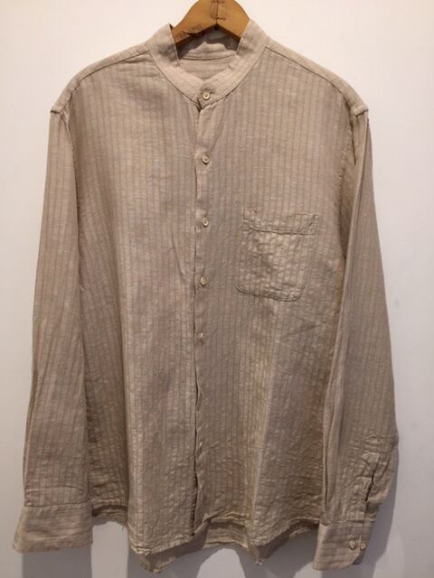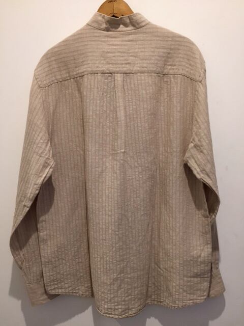 カラーは淡いベージュで良い色味です。リネン×コットンでガーゼの様な素材で良い生地感です。バンドカラーなので着た時にスッキリしていてオシャレのワンポイントにも良いですね。薄くストライプ柄なのでシルエットも綺麗です。