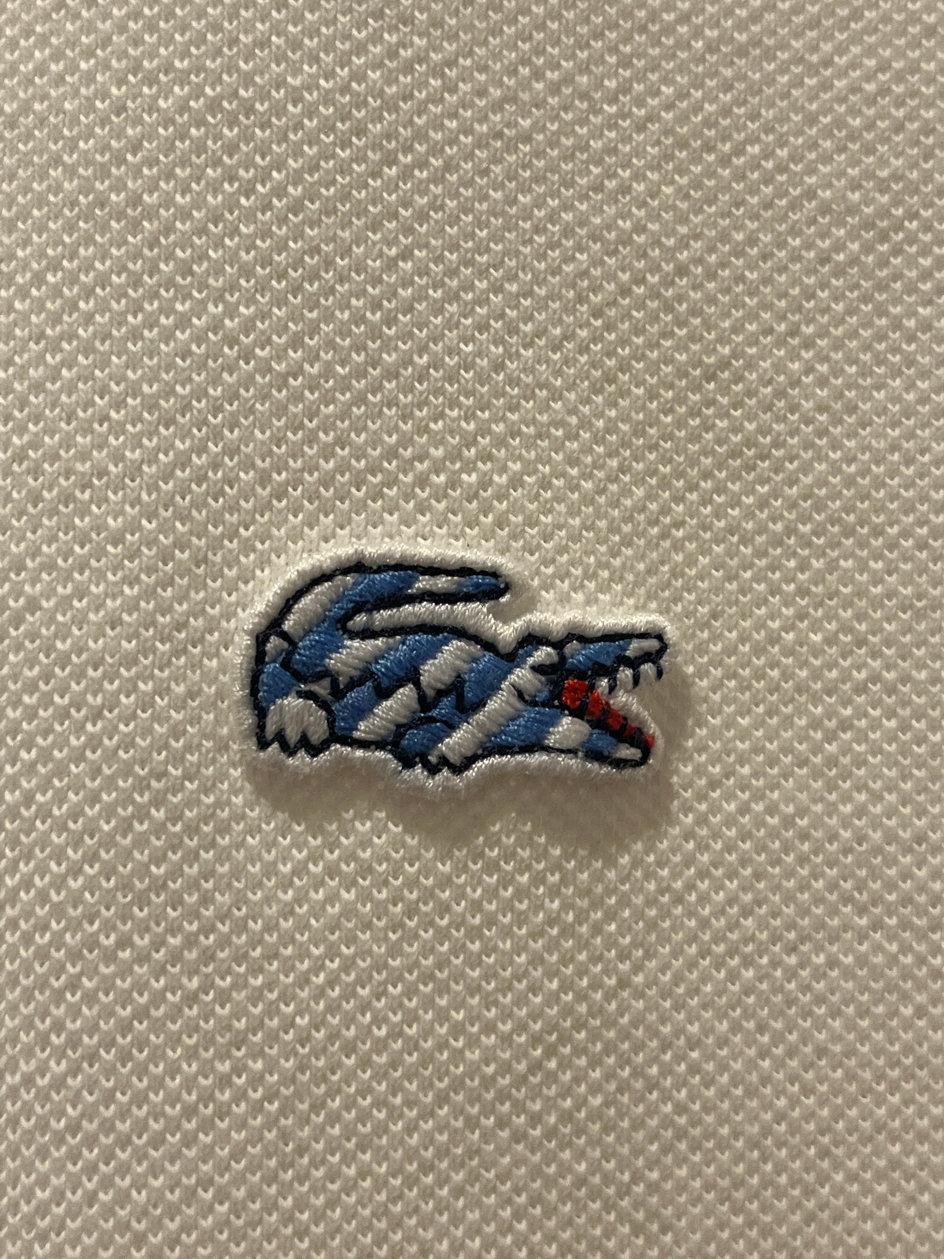 ラコステのデザインポロシャツです。サイズが小さめで恐らくレディース物となります。白の鹿の子ボディにサックスブルーのラインがアクセントになっていてお洒落な1着です。ワニのマークも縞模様になっているのがまた良いですね。Used商品で白物ですと綺麗な物がなかなか無い印象ですがこちらはコンディションも良くオススメな1点です。