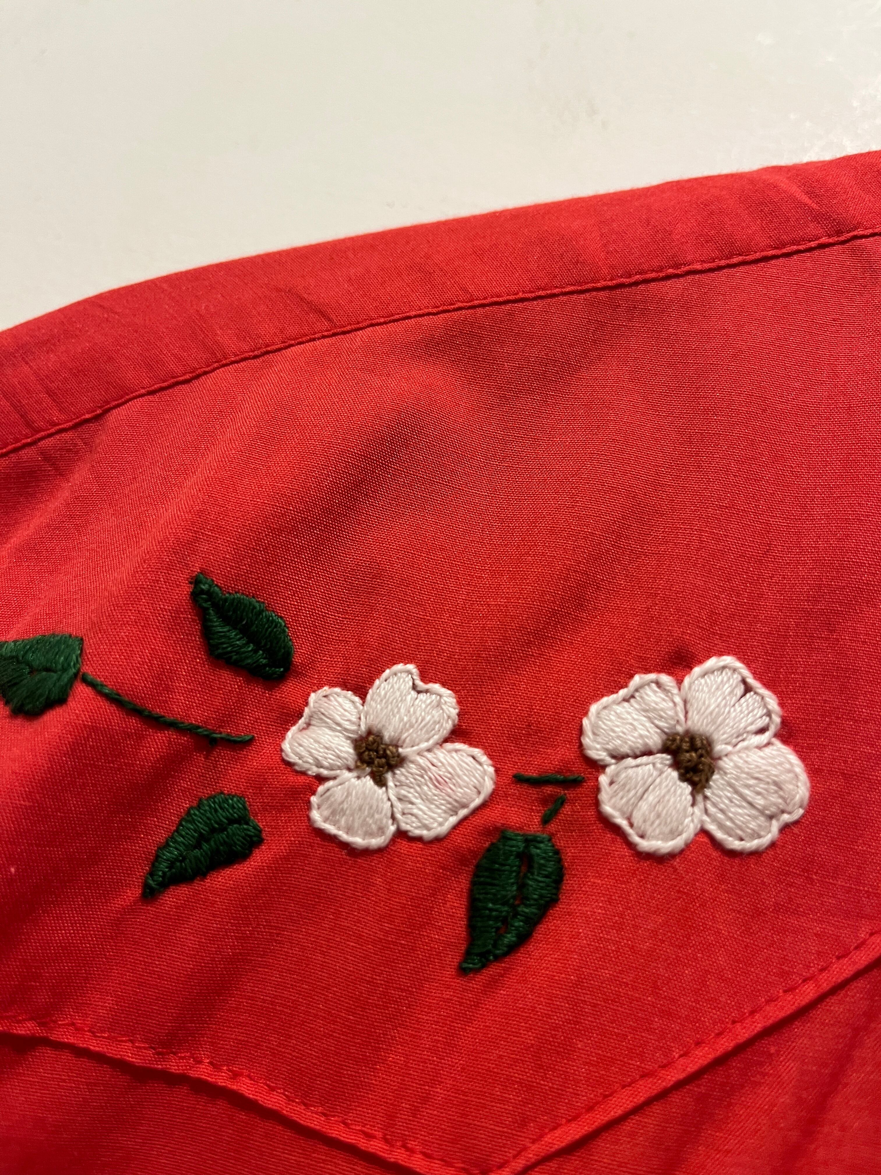 80年代アメリカ製ラングラーのウエスタンシャツです。赤ベースにさりげなく入る、花の刺繍がとても良いデザインです。スナップボタンも赤で統一されているのがまた良いですね。こちらは普通の襟の大きさで、70年代にある大きめな襟が苦手な方にもオススメなウエスタンシャツです。
