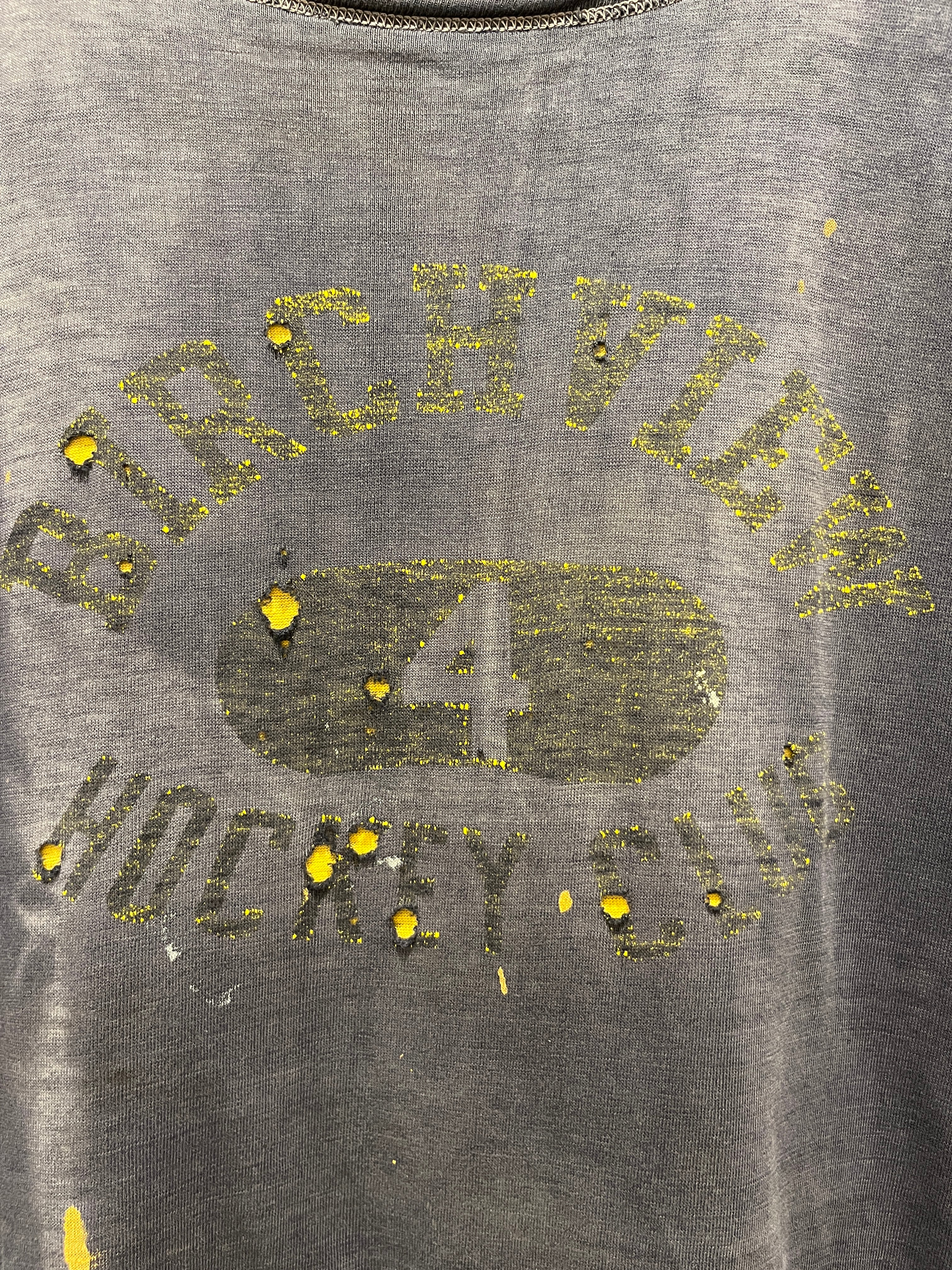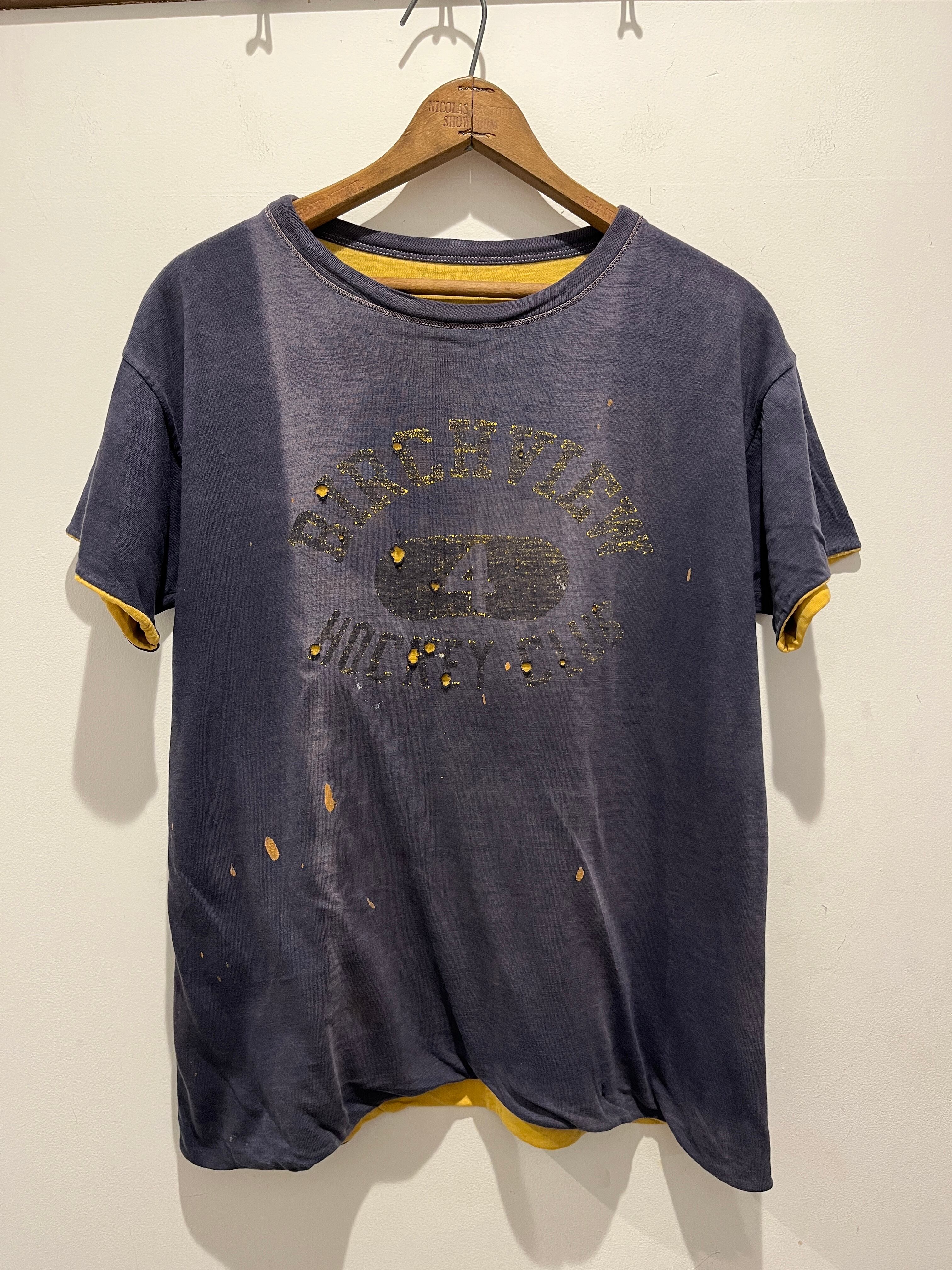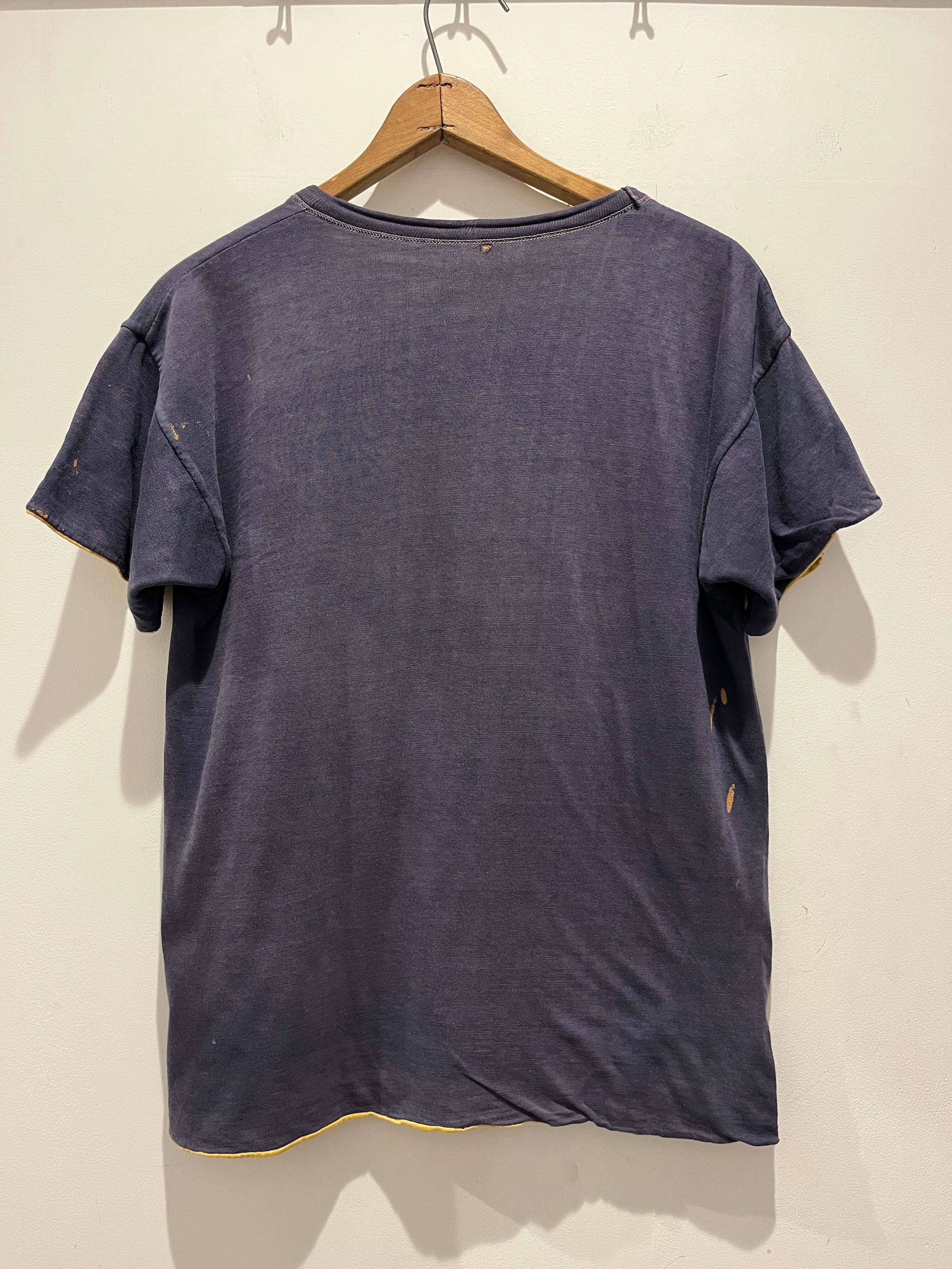 60年代〜70年代のダブルフェイスTシャツです。タグが欠損して不明ですがおそらくチャンピオン、ラッセル、ヘインズあたりの物では無いかと思われます。ネイビー×イエローのダブルフェイスとなっております。ネイビー側はラバープリントがスカスカになりブリーチとペンキ飛びに加え、フェードして茄子紺と小穴がとても雰囲気抜群な仕上がりとなっています。新品には出せないオーラでオススメな1着です。