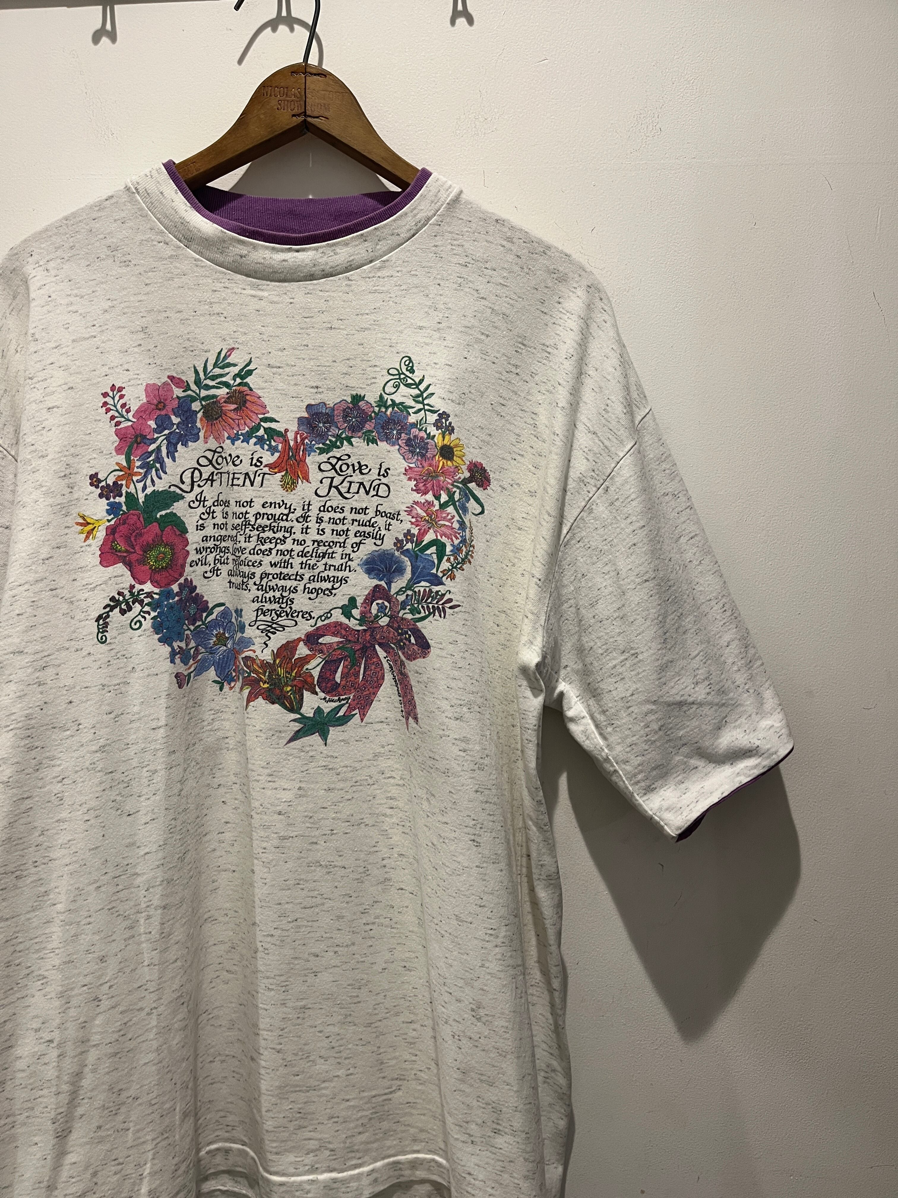90年代アメリカ製の花柄プリントTシャツです。ヘザーナチュラルカラーで襟と袖だけパープルのダブルフェイス仕様になっています。袖を少しまくってリンガーTのように着用してもありですね。デザインも花とメッセージの組み合わせがとても良く良いバランスです。生地感もしっかりしていてユニセックスでオススメです。