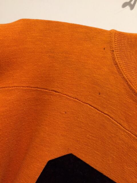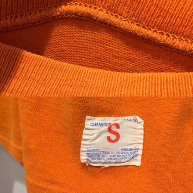カラーはフッドボールTシャツでもなかなか無いレアカラーのオレンジです。プリントがブラックというのもかっこいいですね。首元のタグは欠損してしまっていますが裾のタグは残っています。おそらくですが70年代のアメリカ製チャンピオンと思われます。サイズは希少なSサイズで女性が大きめに着ても良いサイズ感です。コットン100%のしっかりした生地感がとても良いですね。