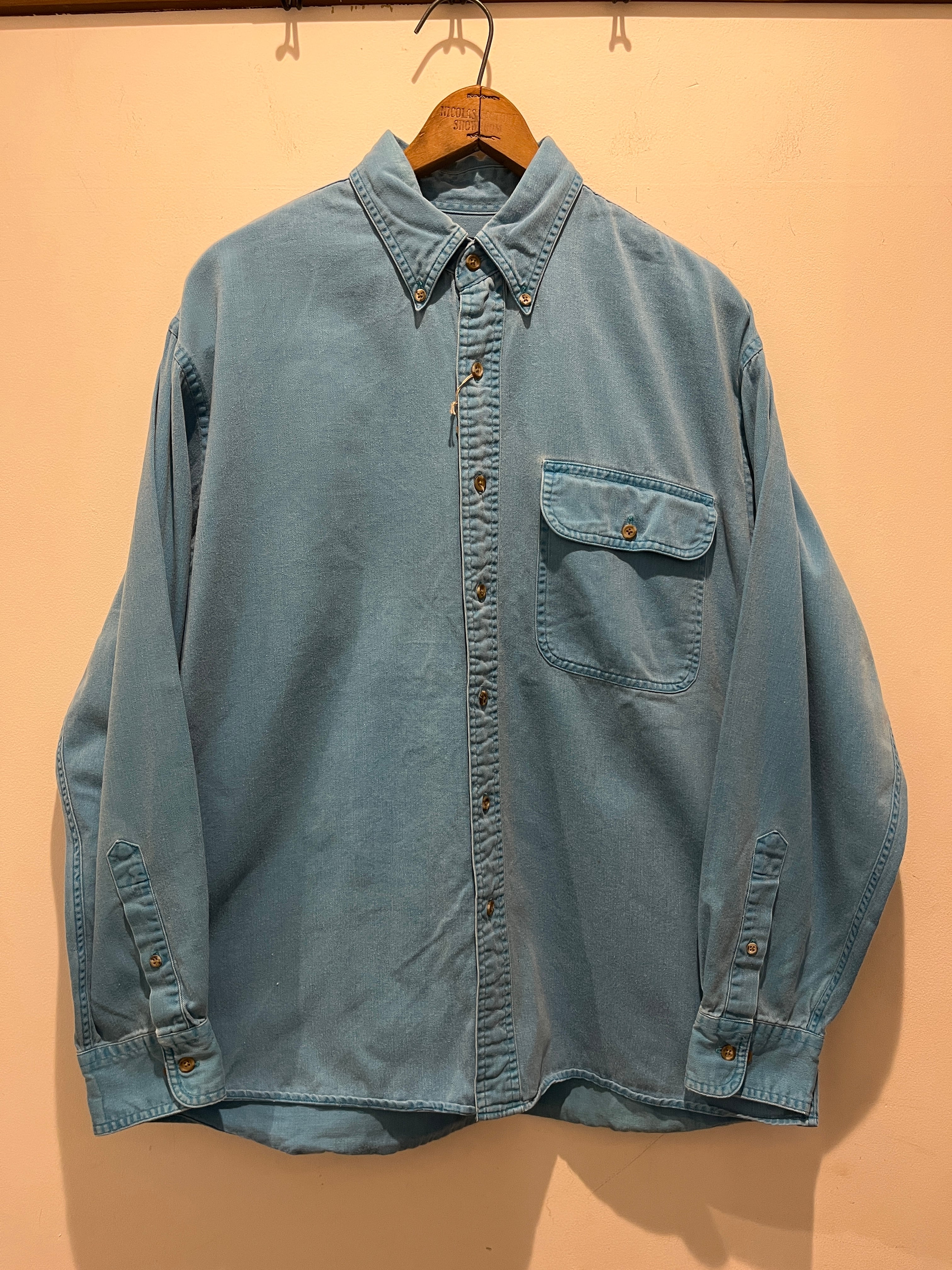 1990年代ランズエンドのコットンシャツです。綺麗なターコイズブルーカラーの100%コットン素材となります。フラップ付き片ポケットのデザインと身幅たっぷり目なシルエットに着丈が長すぎないのも最高ですね。ランズエンドは気の利いた面白いアイテムが多くこちらもその1つでオススメです。