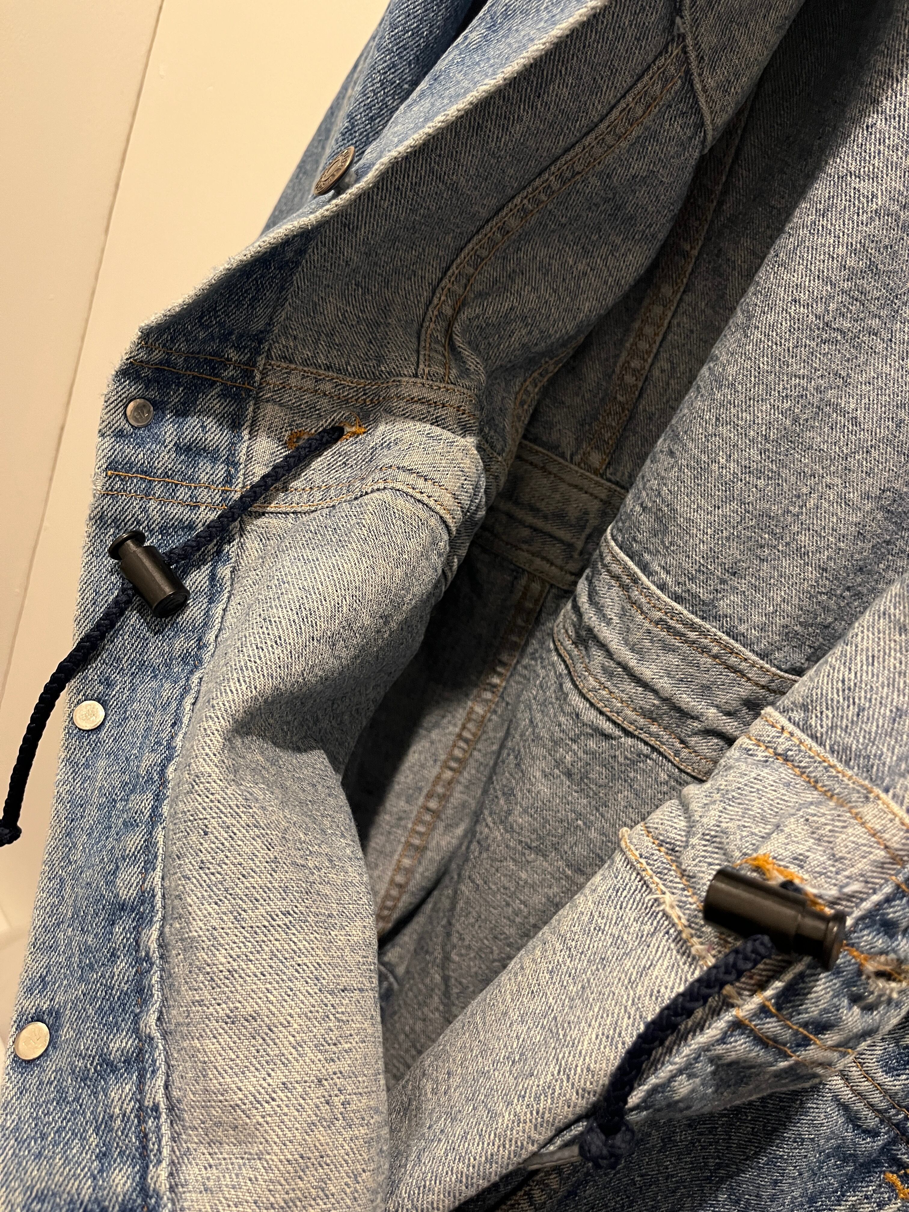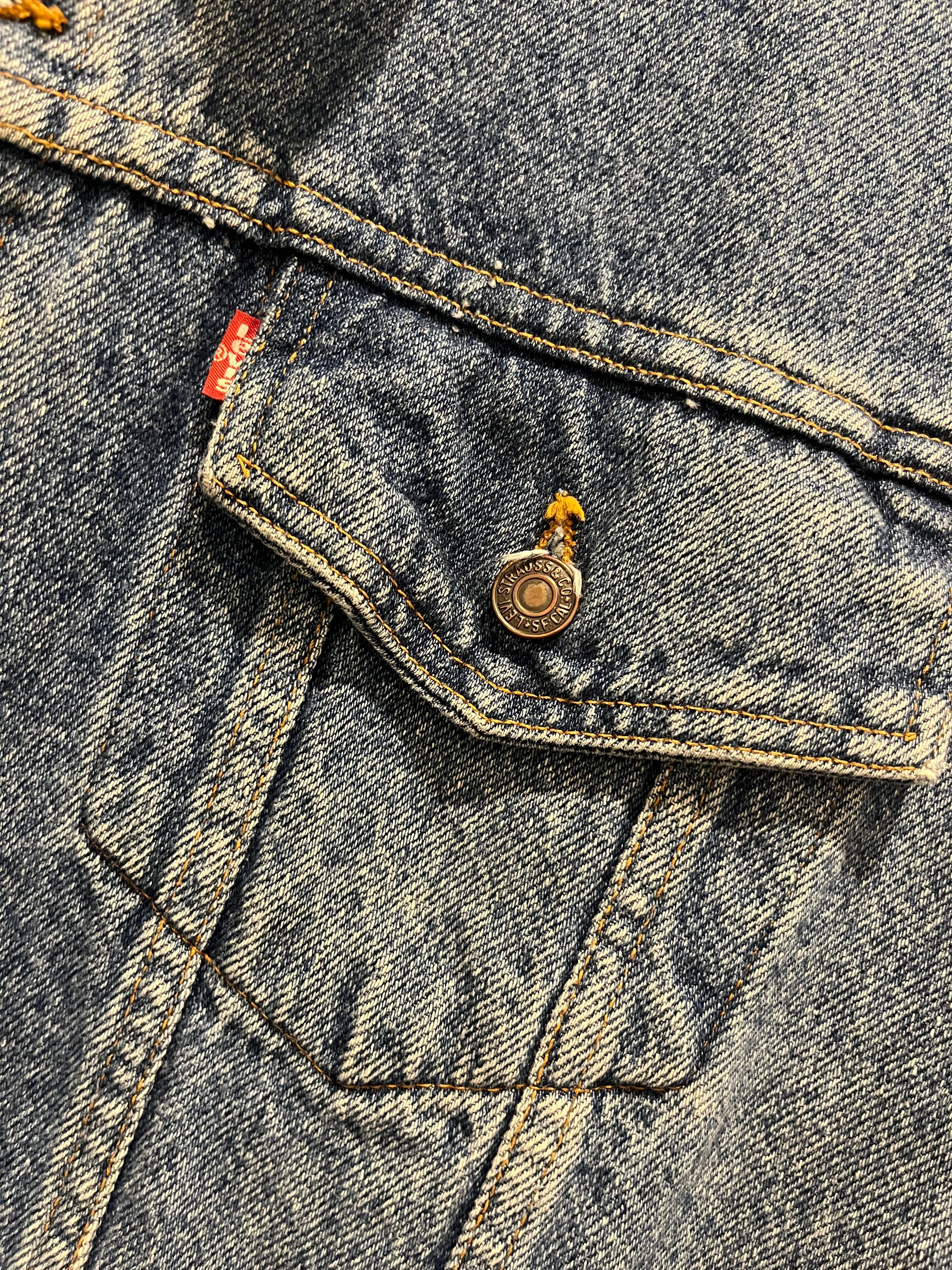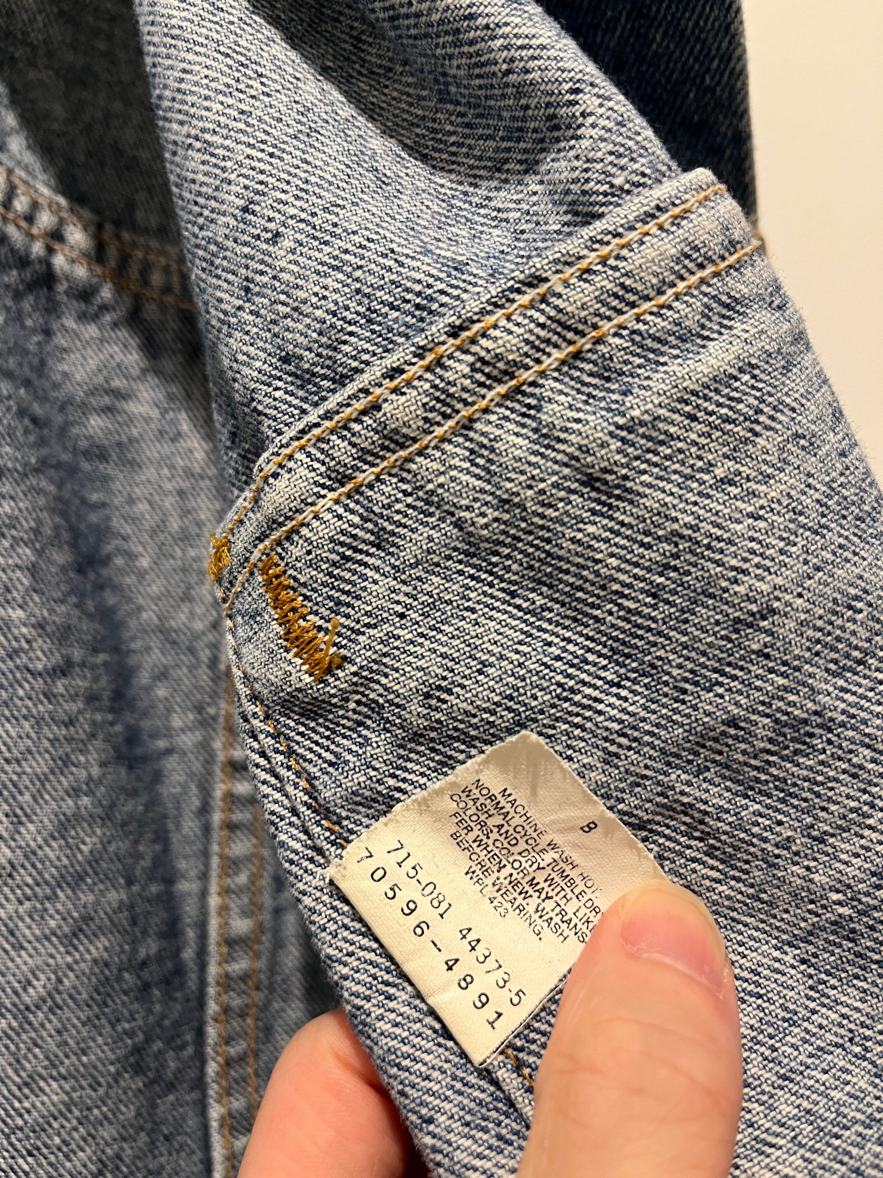 2000年代アメリカ製リーバイス70596のデニムジャケットです。2001年8月製造されたアメリカ製のデニムジャケットです。Gジャンを長くしたデザインでデカパッチ付きの珍品リーバイスとなります。小ぶりな襟なので立てて着用するとMー65フィッシュテールパーカーのような雰囲気もありかっこいい1着です。デニムパンツ同様アメリカ製リーバイスは少なくなってきていて希少となってきましたね。大きめな作りでバサッと着用でき人と被りにくいアイテムとオススメです。
