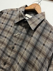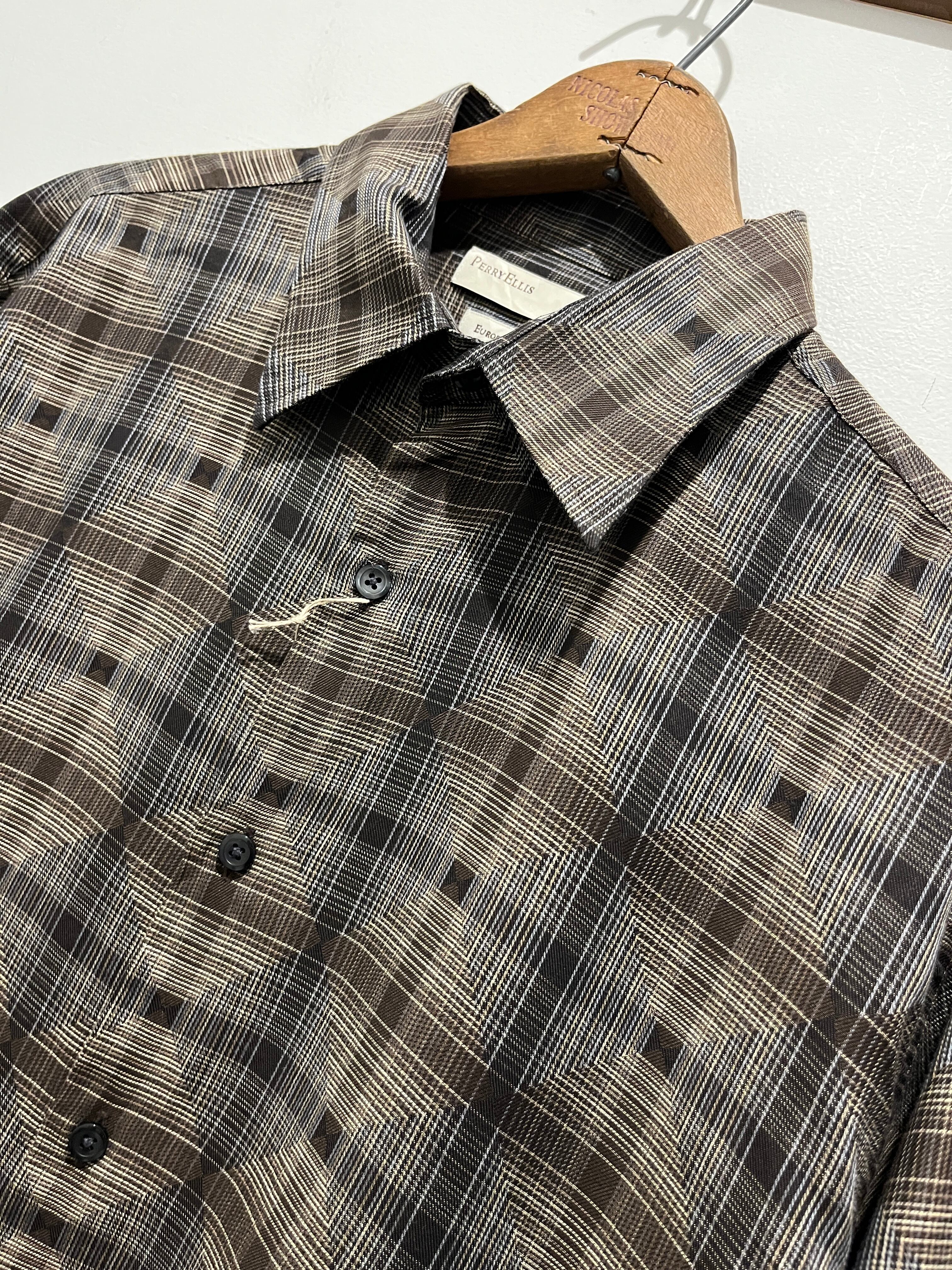 ペリーエリスのデザインシャツです。ニット、シャツ、パンツなどデザインや質の良いものが多いペリーエリス。こちらはブラウンベースでヨーロッパ生地の1着です。□と♢がだまし絵のように見えるデザインがとてもお洒落ですね。メインでもインナーとしても使えてコンディションも良くユニセックスでオススメです。