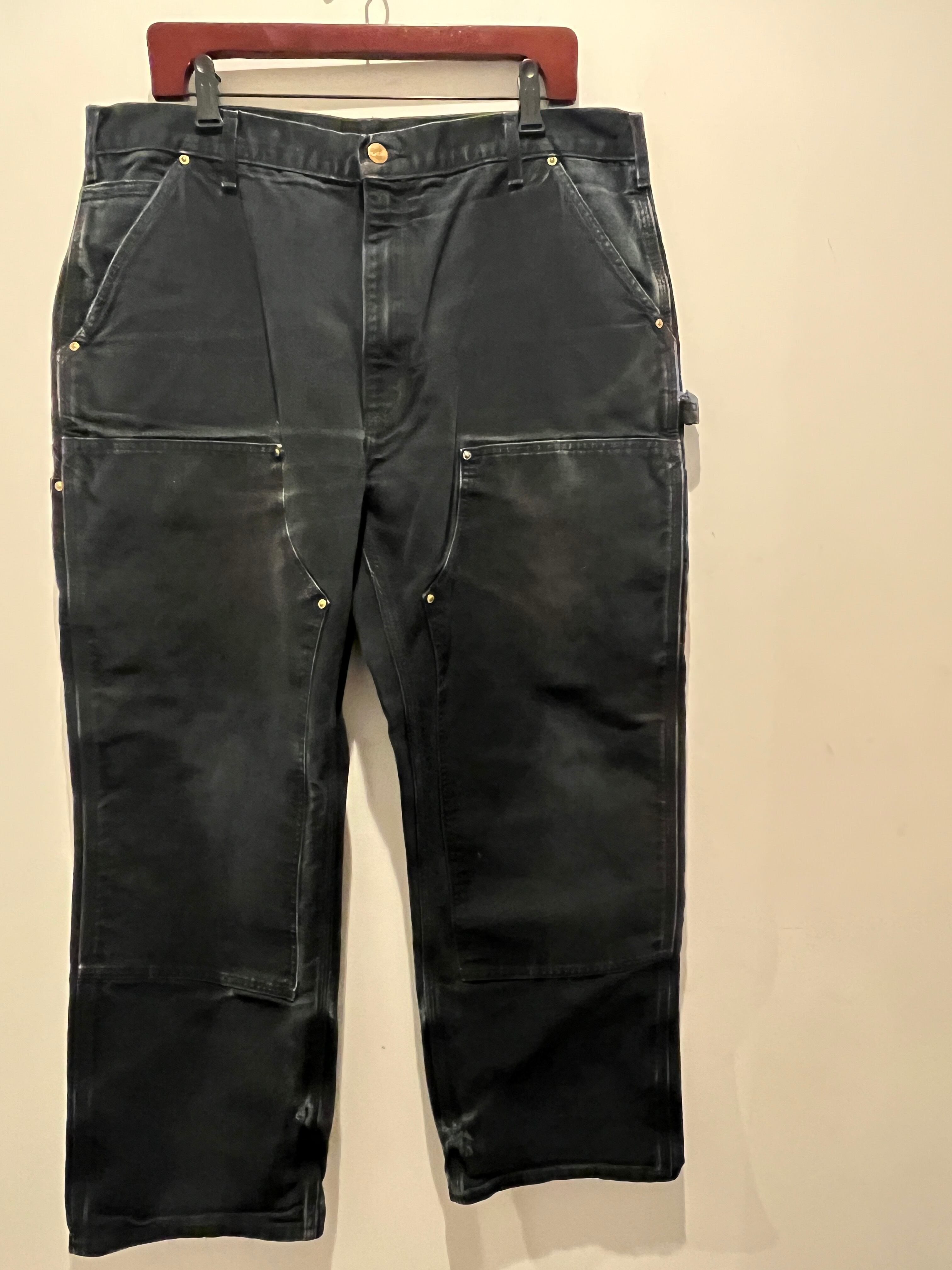 アメリカ製カーハートのダブルニーペインターパンツです。カラーはブラックでジッパーはYKKを使用しています。ダック地にダブルニーと無骨で、Usedアイテムなのでアタリなど雰囲気も抜群です。フェードしたブラックに擦れやペンキなどがとても良い雰囲気で新品には出せない物となっています。ウエスト少し大きめですがベルトで絞って履いていただくと太めのシルエットも演出できオススメです。