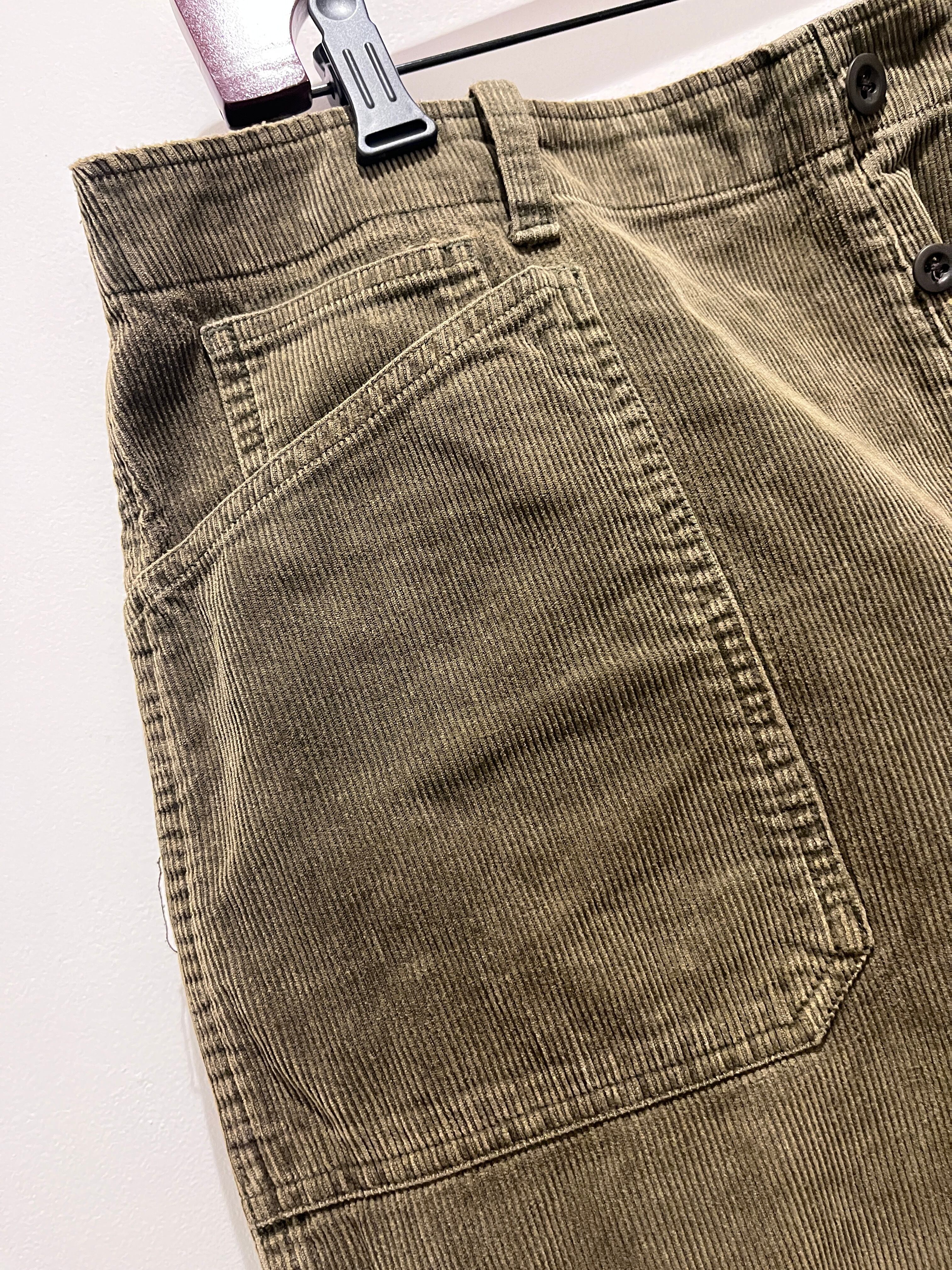 90年代ラルフローレンのパンツです。モスグリーンカラーのコーデュロイにワークとミリタリーテイストをサンプリングしたデザインがとても良い1本です。太めのシルエットにボタンフライ、後ろは針付きのシンチバッグと最高なディテールです。太めで無骨なパンツを探していた方にはオススメなパンツです。