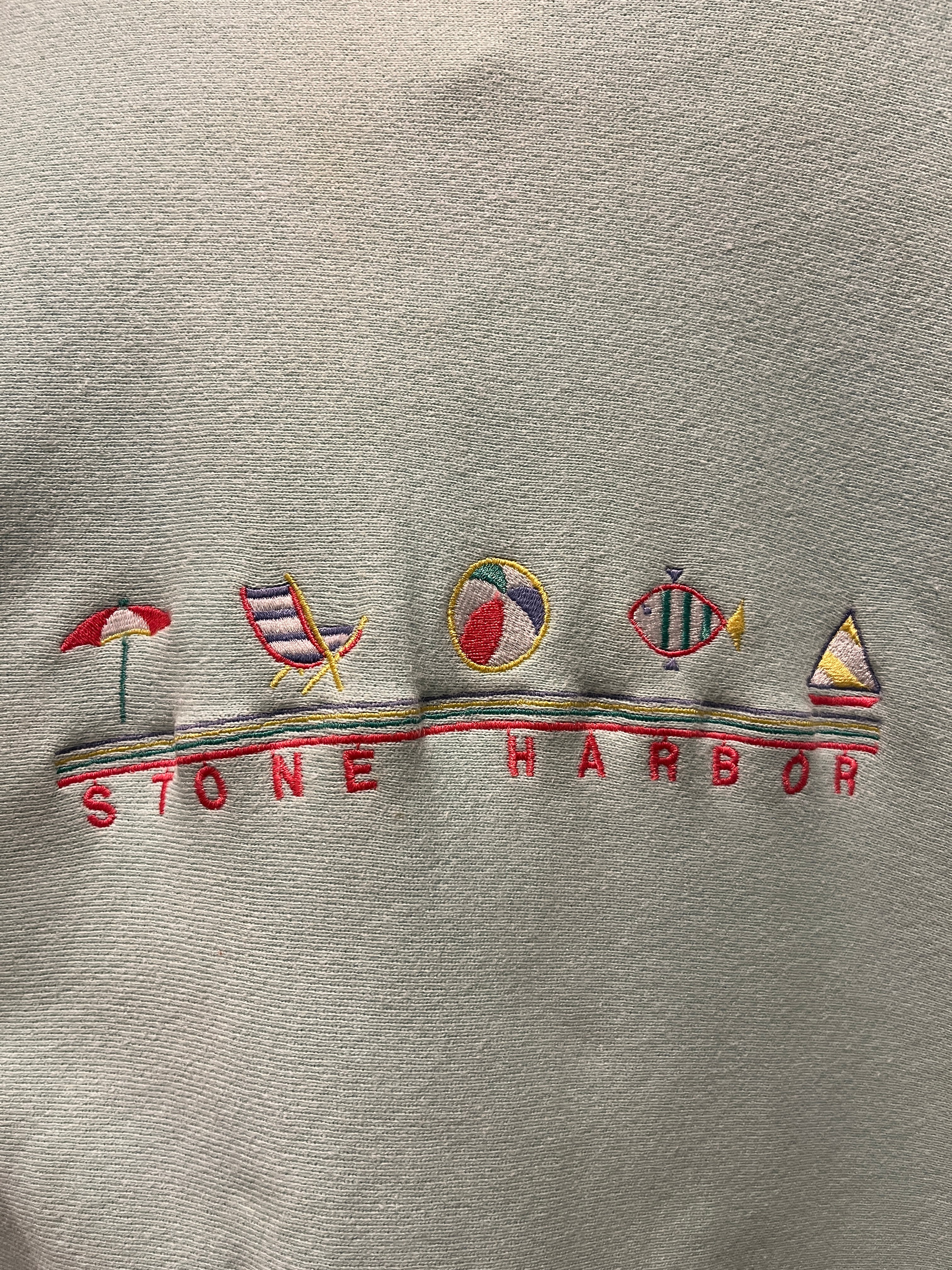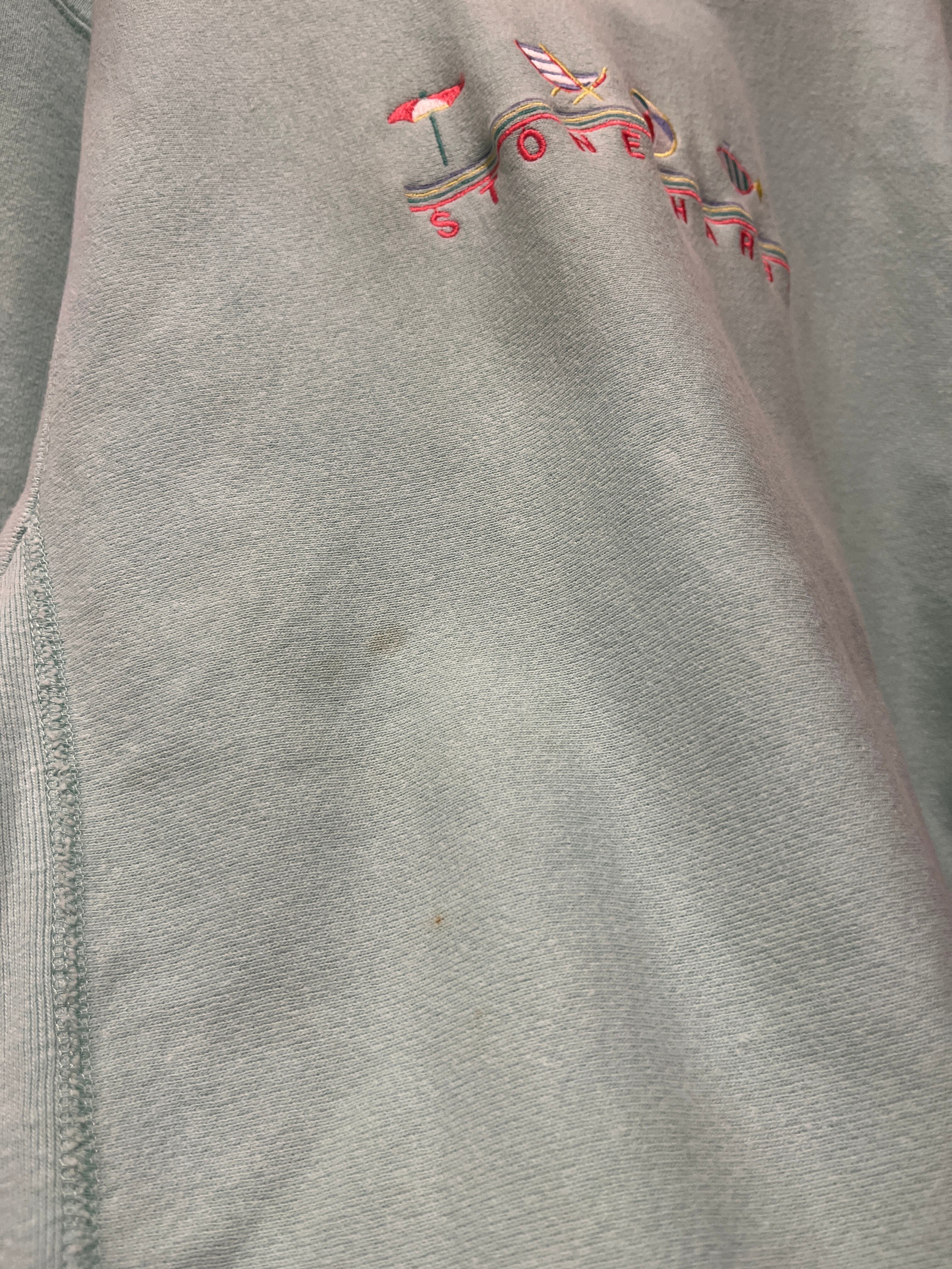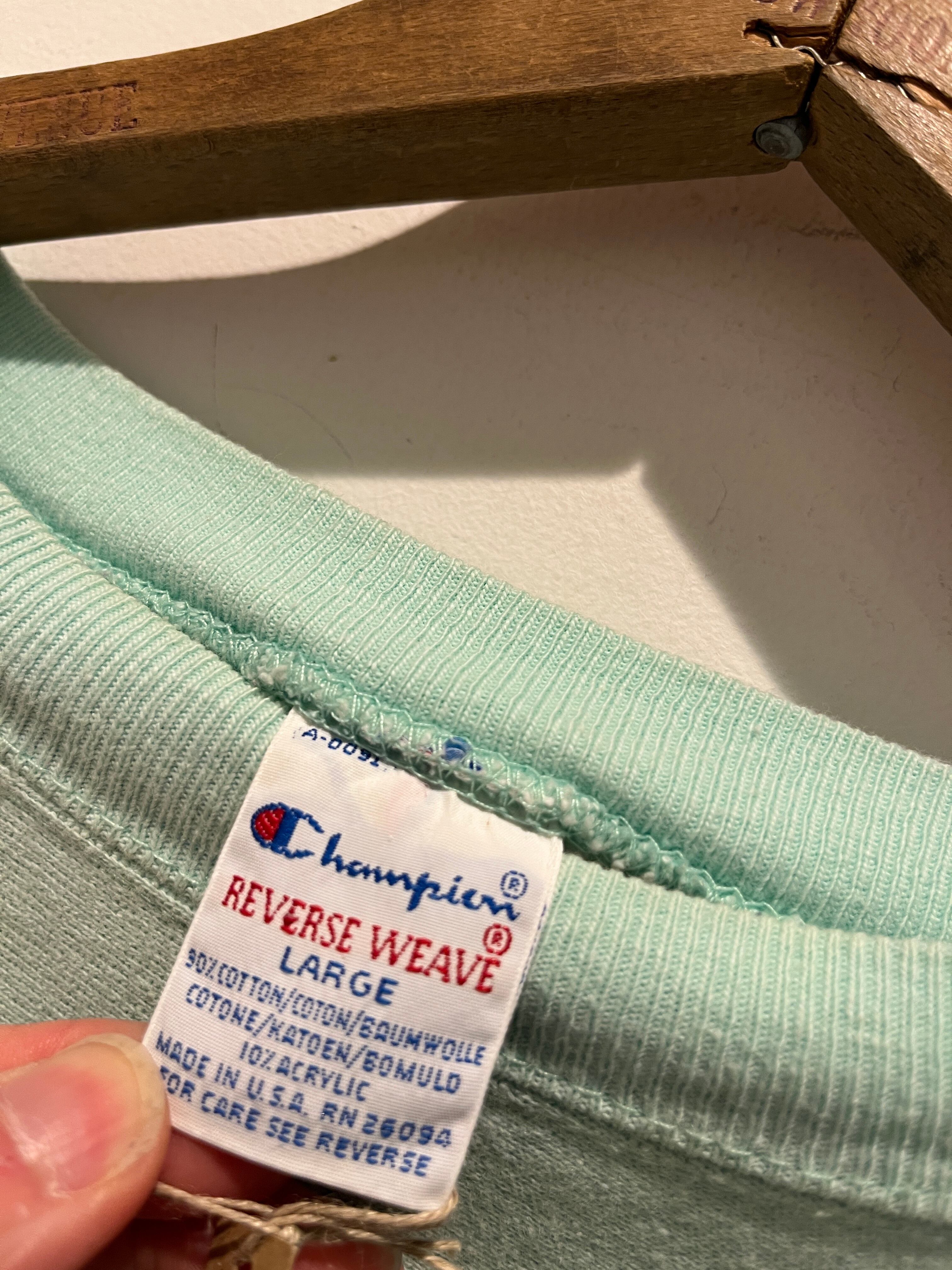 90年代アメリカ製チャンピオンのリバースウィーブです。刺繍タグが付く90年代前半の物でしっかりアメリカ製のリバースとなります。ティファニーブルーベースの色味に刺繍が珍しい1着です。カレッジ物が多いなか、カラーリング×刺繍デザインが中々無いですね。リブのコンディションも良くオススメなアイテムです。