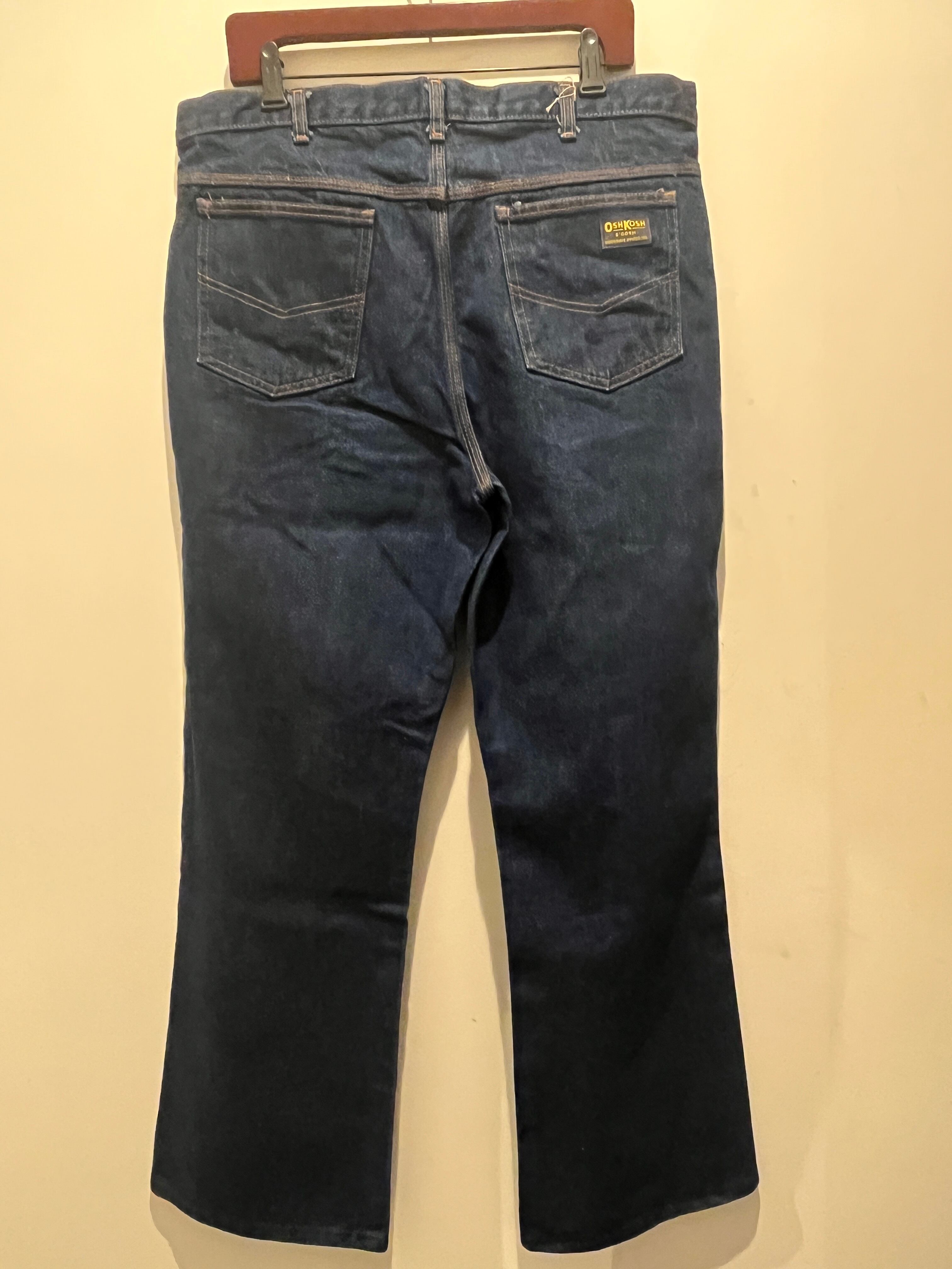 60年代オシュコシュのデニムパンツです。タグにUNION MADE SANFORIZED表記が入る60年代のデニムで色も濃く状態の良い1本です。ジッパーは42TALONでバッグにトリプルステッチが見られ、ワーク感があるのもとても良いですね。ウエストをベルトで絞って履いていただくと太めのシルエットとしても履けてオススメなデニムパンツです。