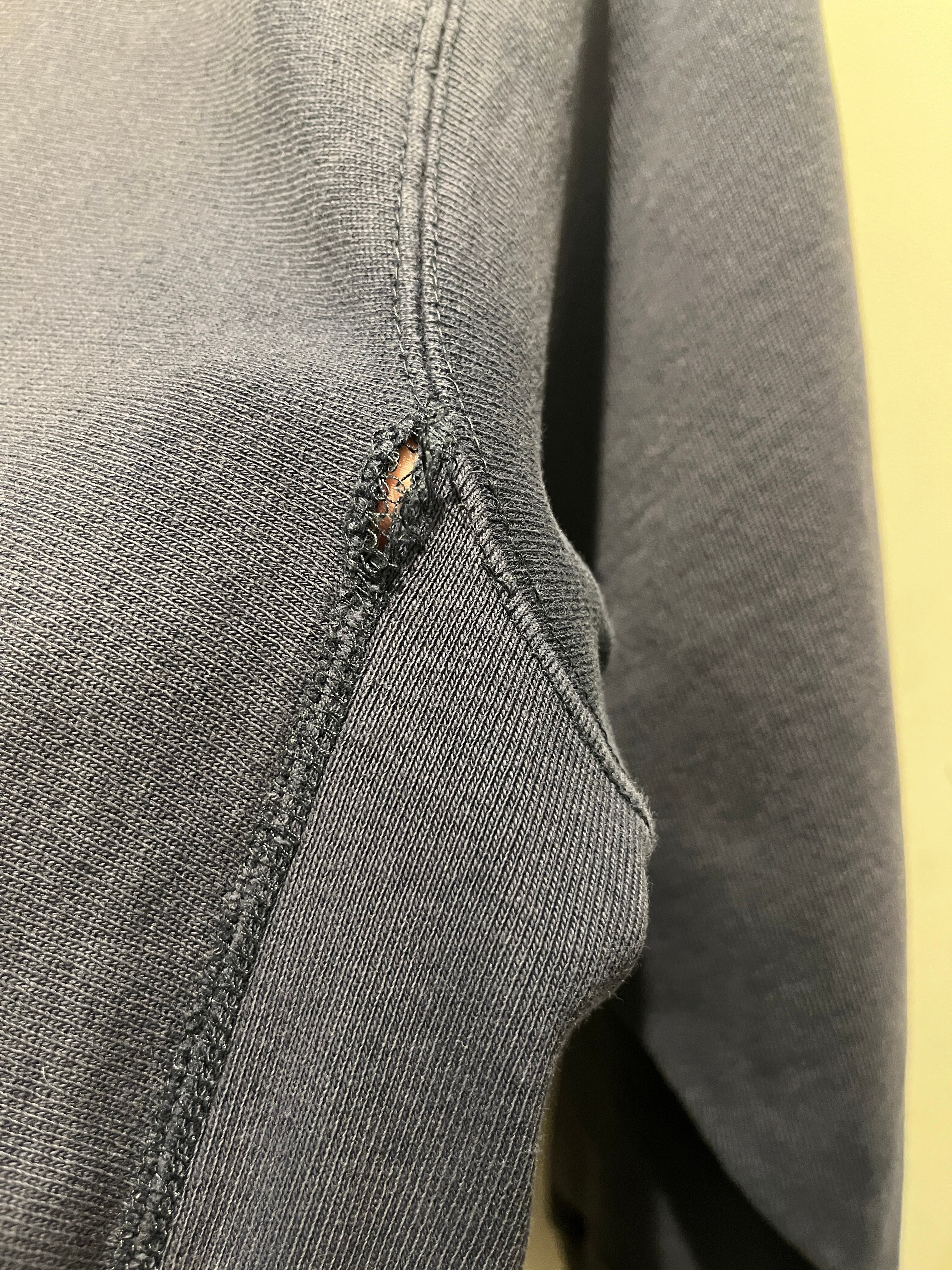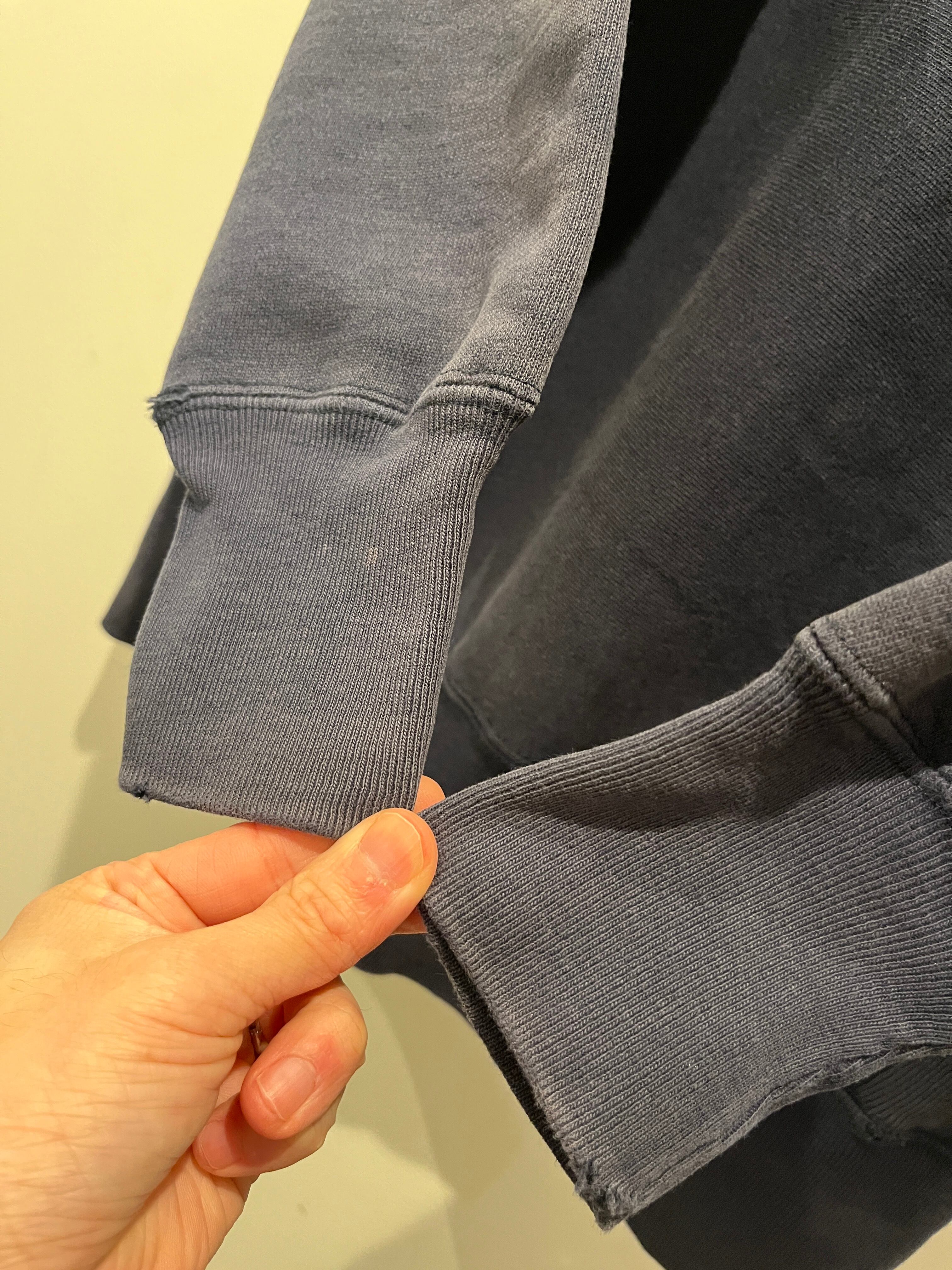 90年代アメリカ製チャンピオンのリバースウィーブです。ネイビーボディに目付きのワンポイントで袖には目が付かないタイプとなります。擦れとフェードしたネイビーボディが雰囲気たっぷりでヴィンテージ感があるのも最高ですね。数少ないSサイズで女性の方か小柄な男性にオススメなサイズ感です。