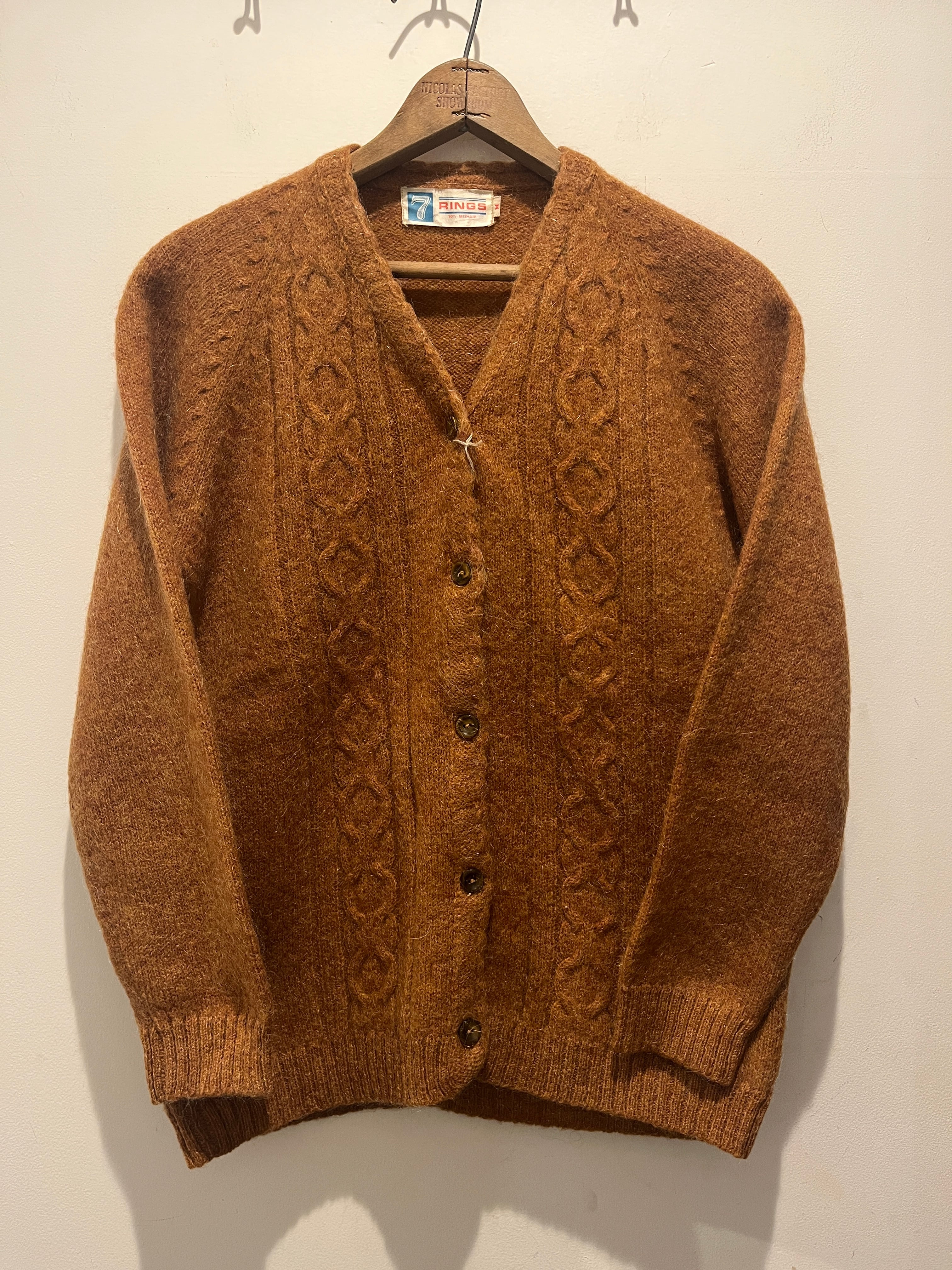 70年代レディースのモヘアカーディガンです。落ち着いた色味のオレンジカラーにフロントのケーブル編みとデザインもとても良い1着です。ラグランスリーブで肩の落ち感があるのとマーブルボタンがアクセントになっているのもポイントです。モヘア70%と豪華でメンズサイズだとプライスが一気に上がるアイテムですね。コンディションも良くサイズの合う方にはオススメです。