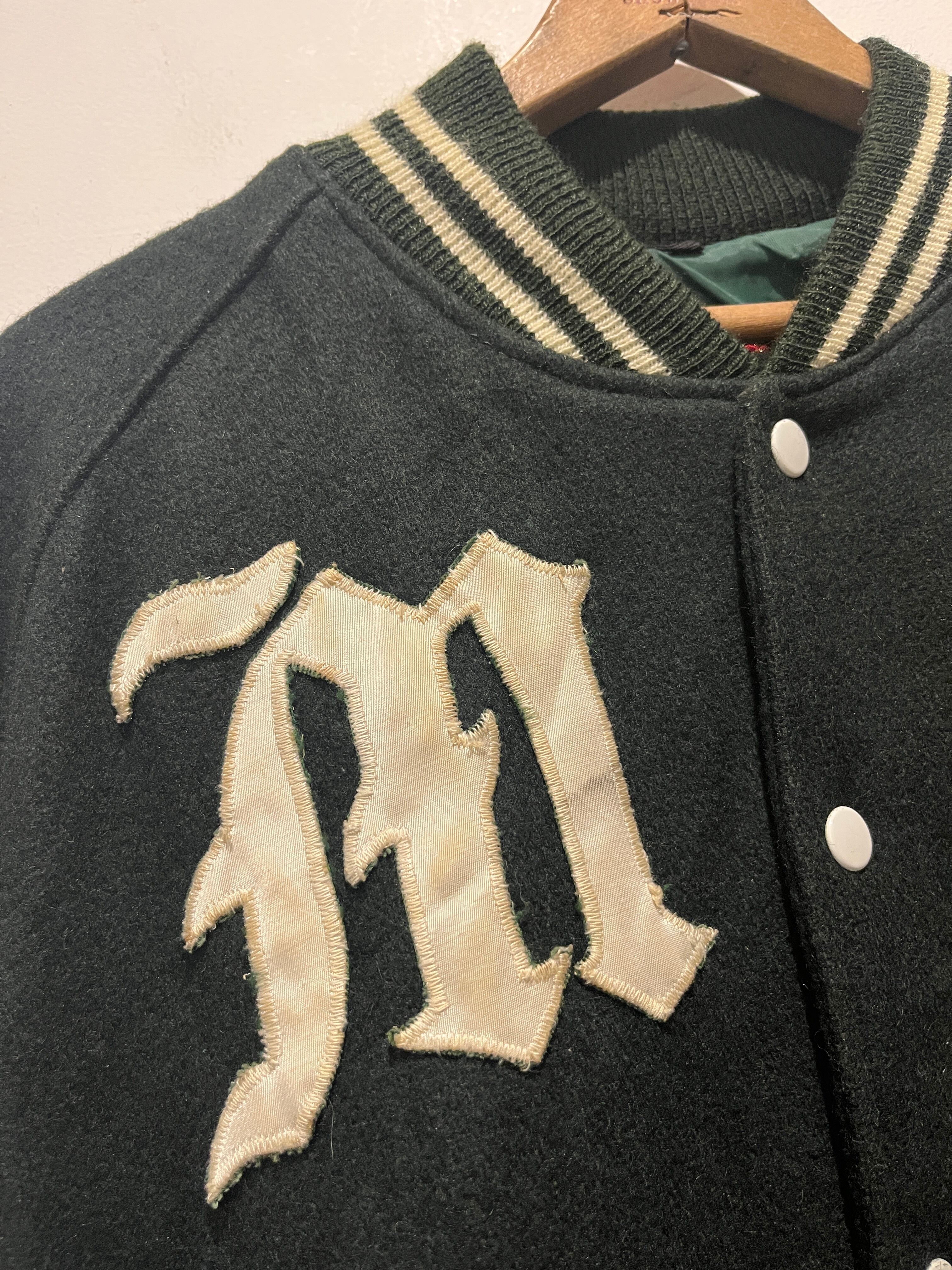 70年代アメリカ製のスタジャンです。ダートマスグリーンにフロントはオールドイングリッシュのワッペン&刺繍、バッグはワッペン&チェーンステッチと豪華でとてもカッコイイ1着です。ダートマスグリーン×ホワイトのコントラストもとても良いですね。サイズ表記42(XL)ですが70年代でそこまで大きくないサイズ感も魅力的ですね。ラグランスリーブで裏地もあるので着用しやすくオススメなスタジャンです。