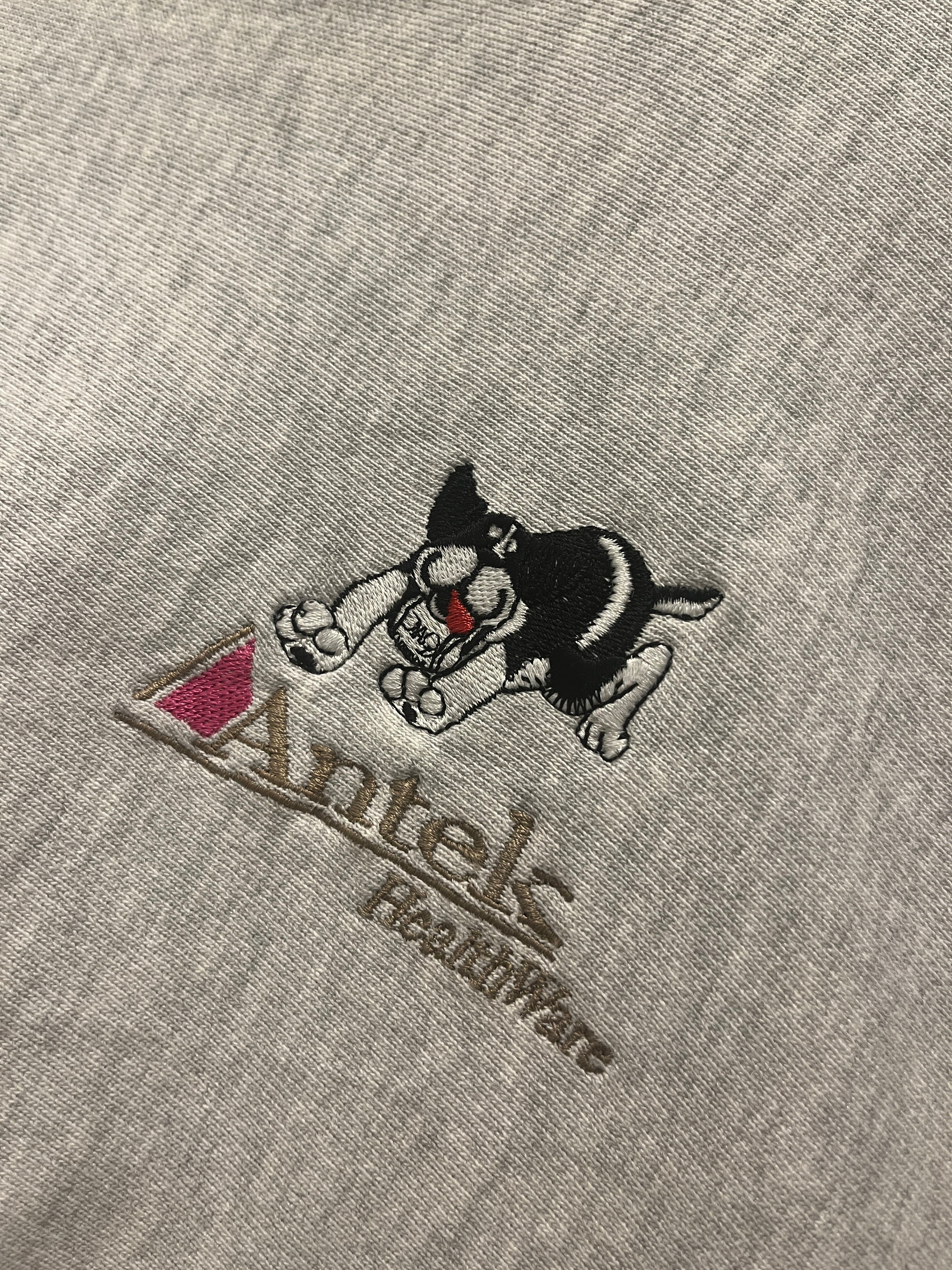 チャンピオンのプレミアムリバースウィーブスウェットです。2000年以降の物で上質な生地のプレミアムリバースウィーブ。こちらはグレーボディで胸に犬の刺繍がとても良いデザインです。サイズ表記が消えてしまっていますがXL〜2XL位のゆったりめなサイズ感となります。古い年代の物ではありませんが袖の感じの雰囲気も良くユニセックスでオススメです。