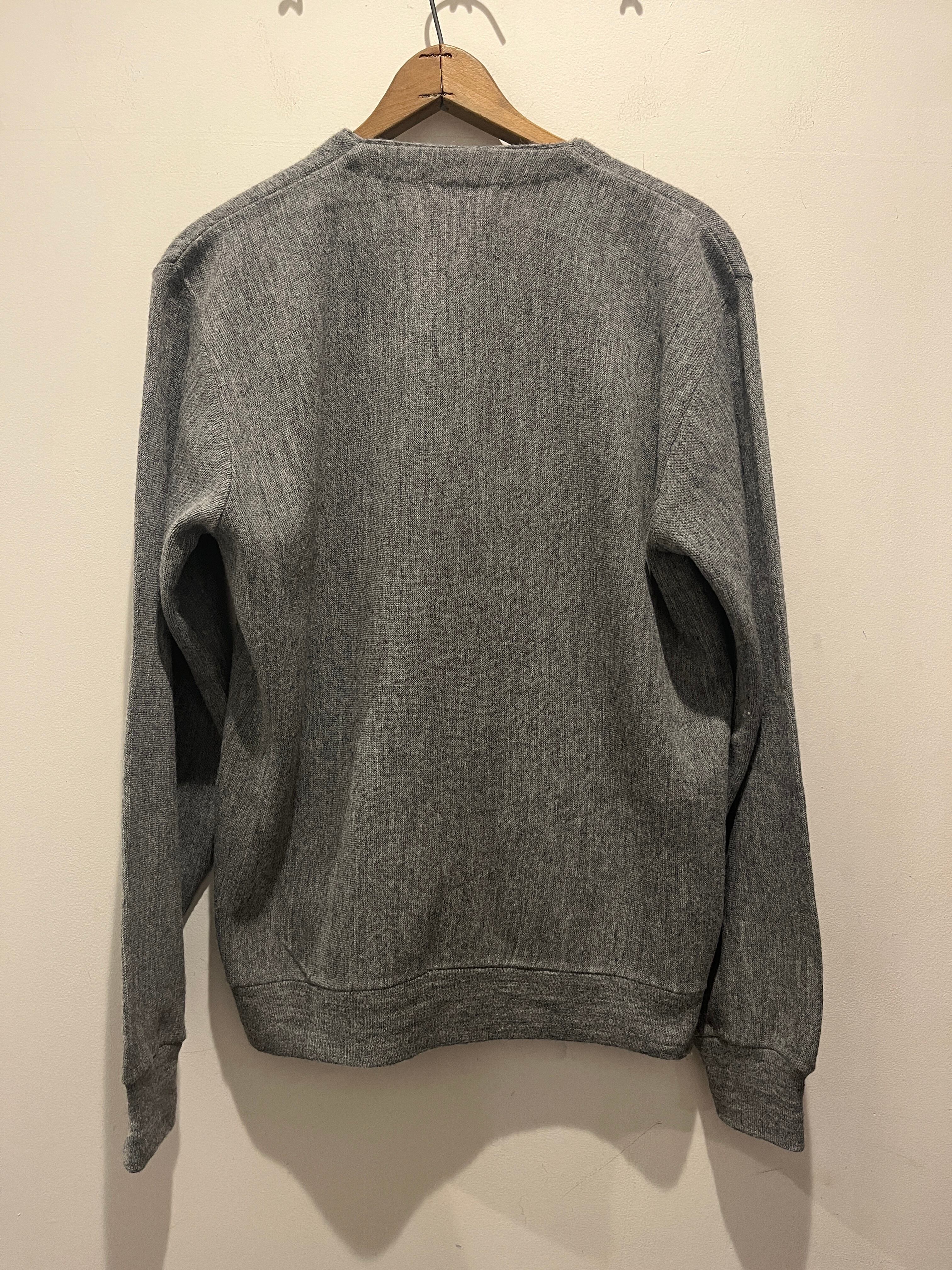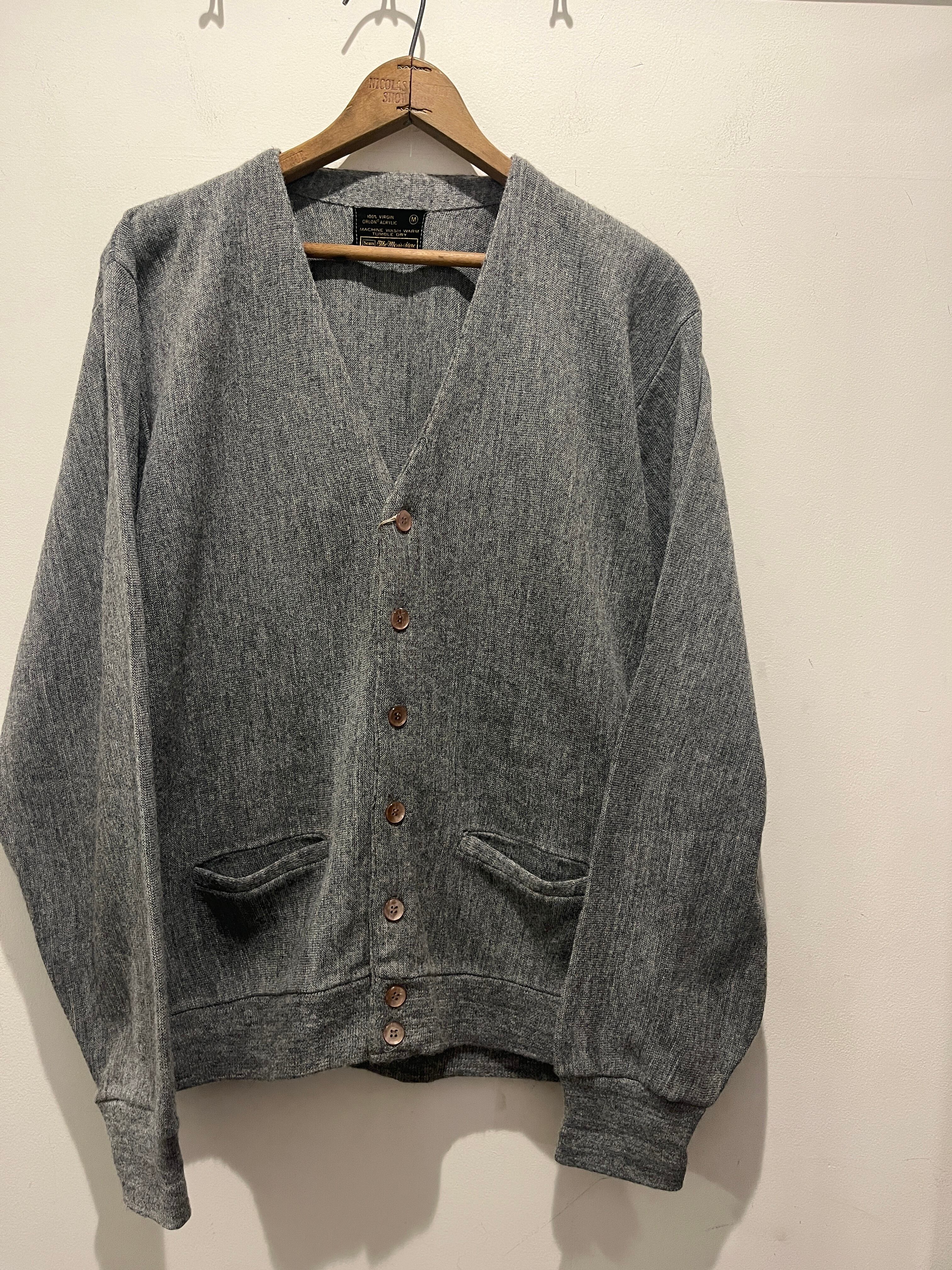 70年代シアーズのアクリルカーディガンです。グレーベースにブラックもミックスで入るとても良い色味です。ポケット付きで、毛足は無いですがモヘアカーディガンにも似ています。カーディガンはインナーとしてもメインでもサラッと着用できてオールシーズン使えるのが魅力的ですね。コンディションも良くユニセックスでオススメです。