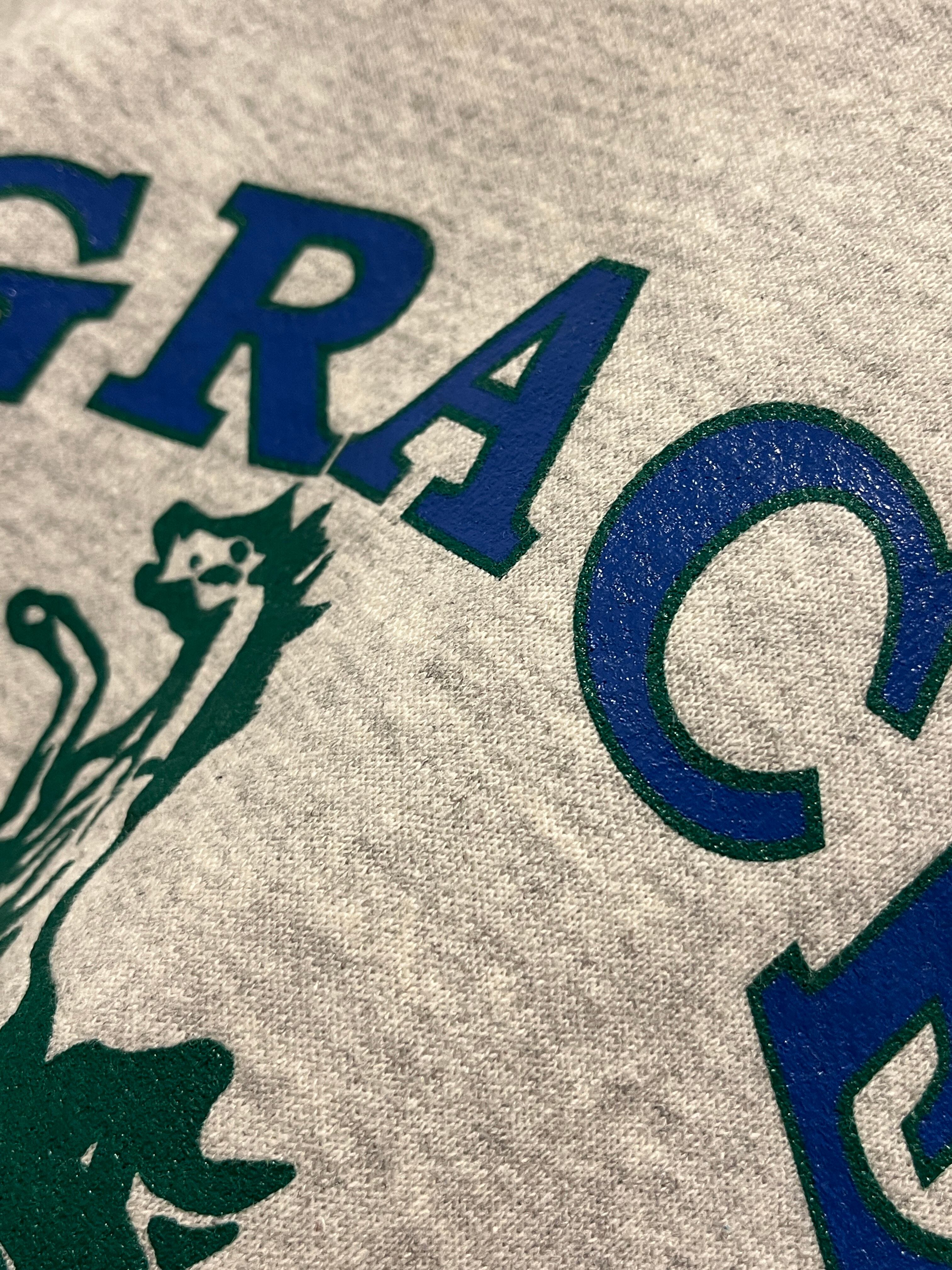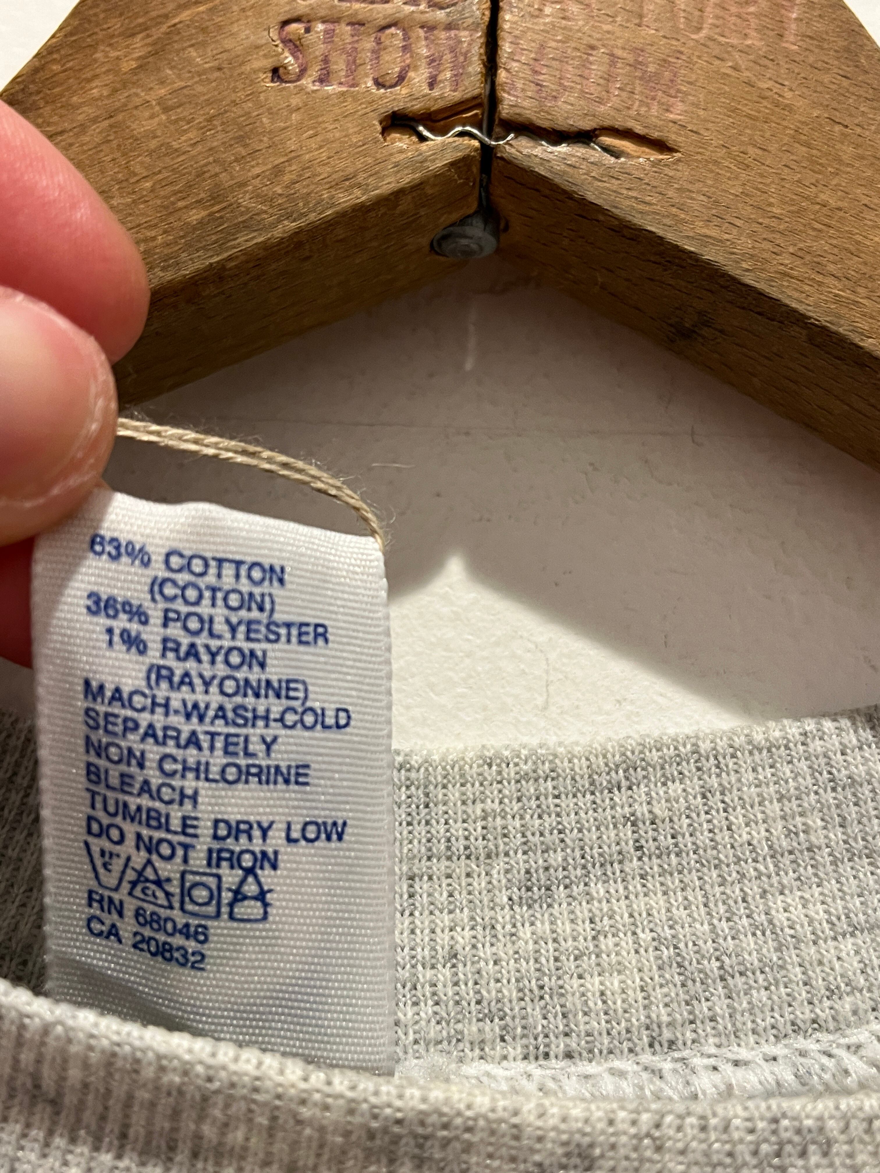 90年代アメリカ製ディスカスのプリントスウェットです。グレーボディに馬を含むカレッジプリントが可愛いデザインです。プリントのカラーがディスカスのタグと一緒のブルー×グリーンの配色になっているのも良いですね。ラグランスリーブで着用もしやすくコンディションも良いのでユニセックスでオススメなスウェットです。