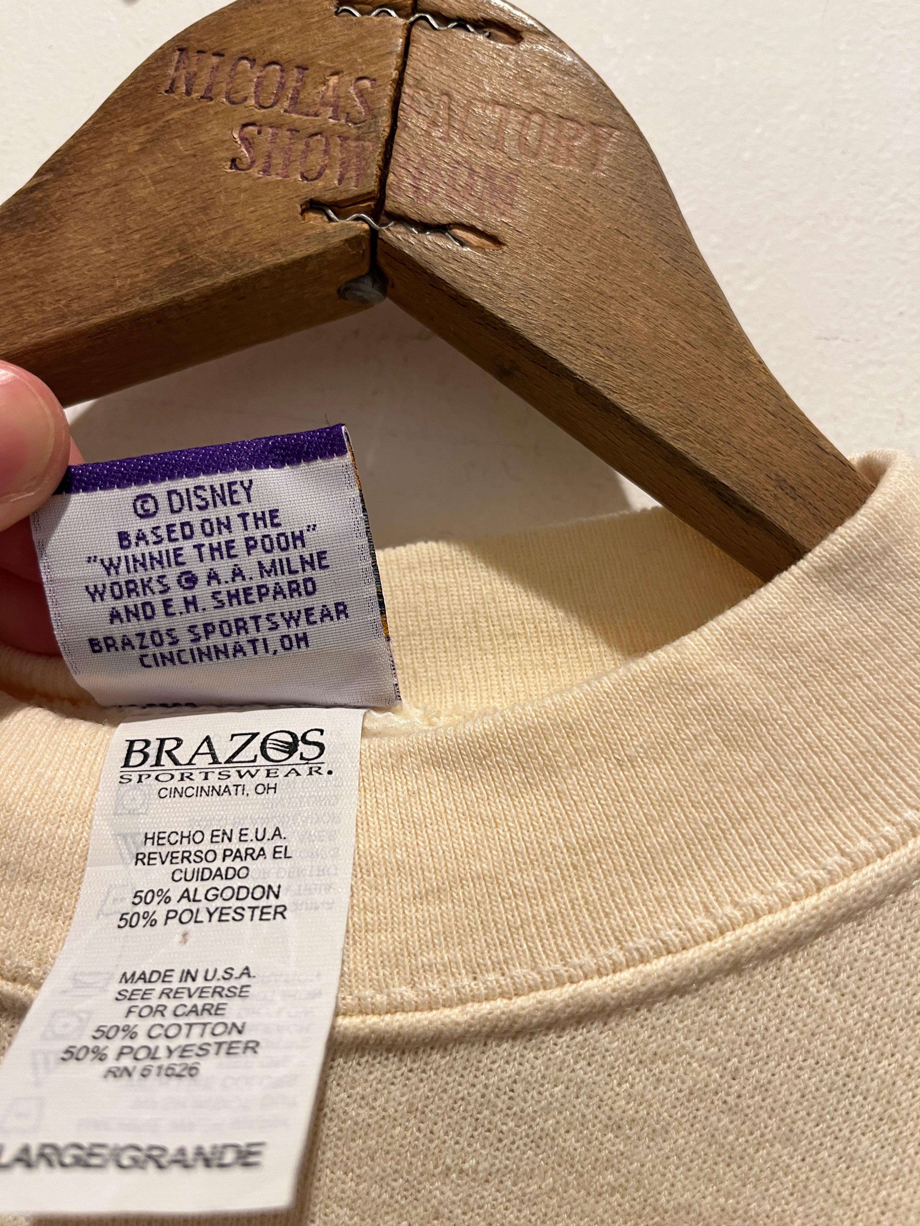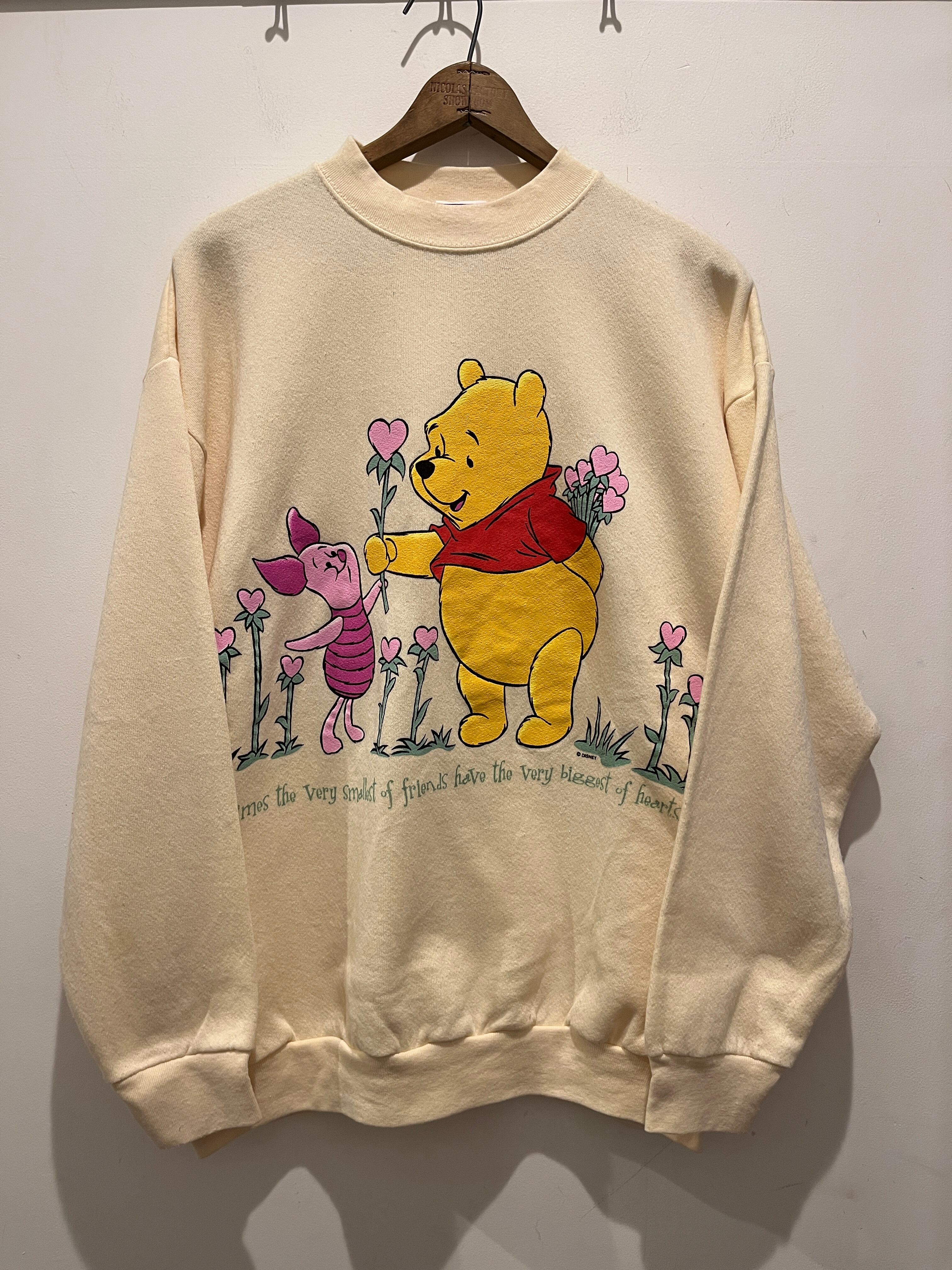 90年代アメリカ製のクマのプーさんスウェットです。淡いレモンイエローボディにプーさんとピグレットがデザインされている可愛い1着です。コピーライト入りでしっかりアメリカ製なのもポイントですね。ゆったりめなサイズ感でコンディションも良くユニセックスでオススメなスウェットです。