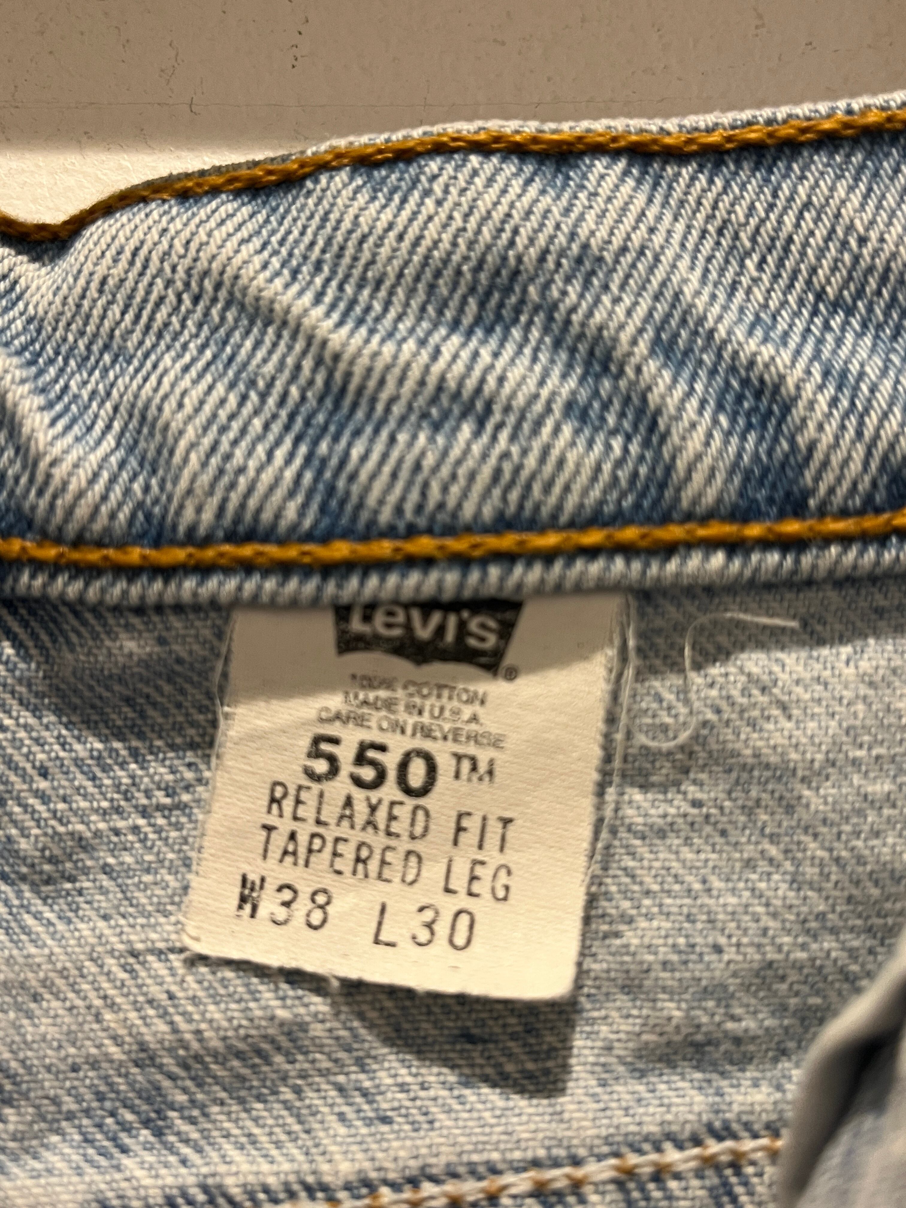 90年代アメリカ製リーバイスの550デニムパンツです。太腿ゆったりで程良いテーパードしているシルエットが人気の550品番。96年2月製造の物でスレキに140YEARSのプリントが入るアメリカ製の個体です。アイスブルーでウエストを絞って履いていただくとルーズなシルエットで履いていただけるオススメな1本です。