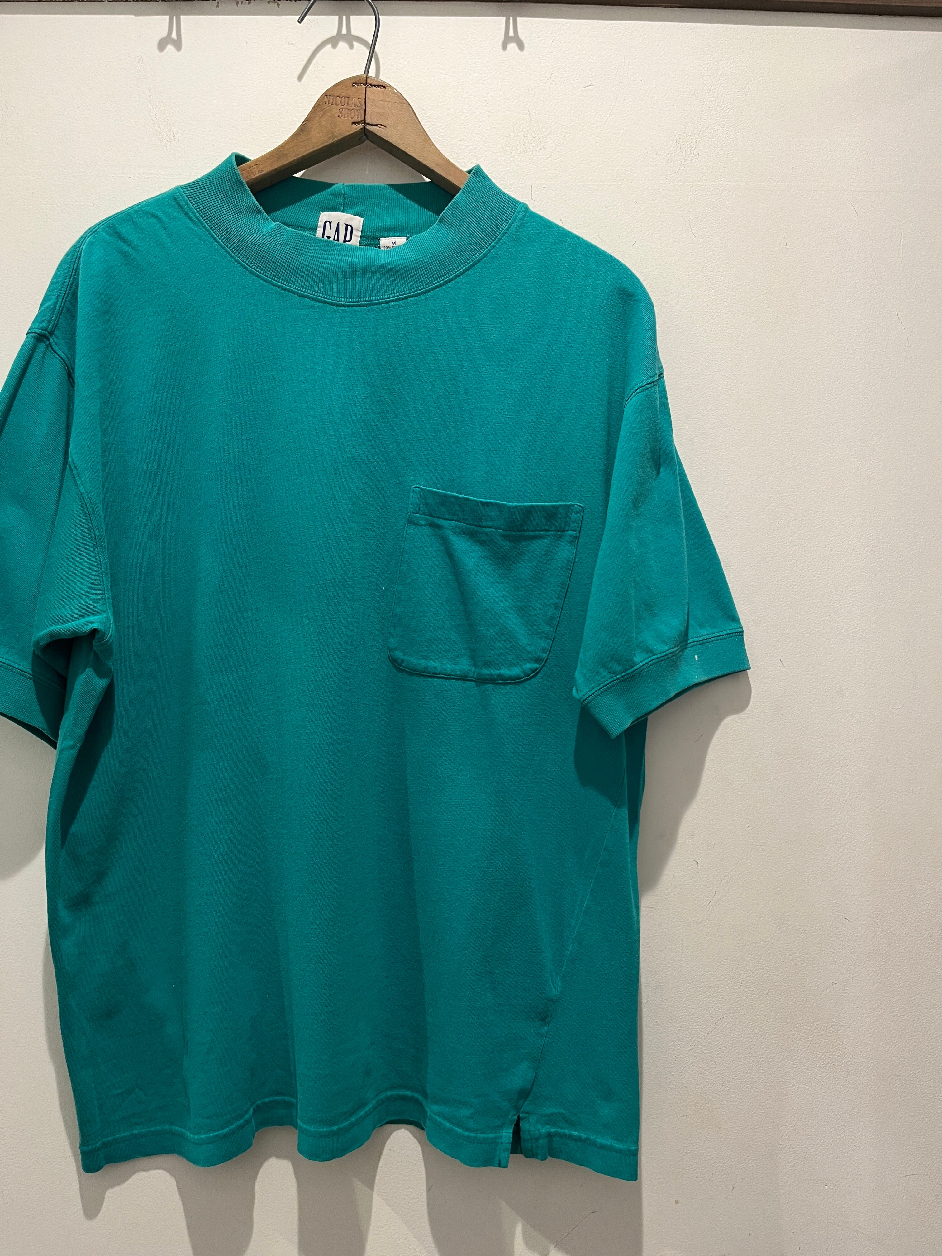80年代〜90年代オールドギャップのポケットTシャツです。綺麗なグリーンボディに大きめのポケットがアクセントになっている1着です。モックネックで袖にリブが付いていたり、裾にスリットが入っていたりとカットソーにも近い雰囲気ですね。メンズMサイズなのでユニセックスでオススメなTシャツです。