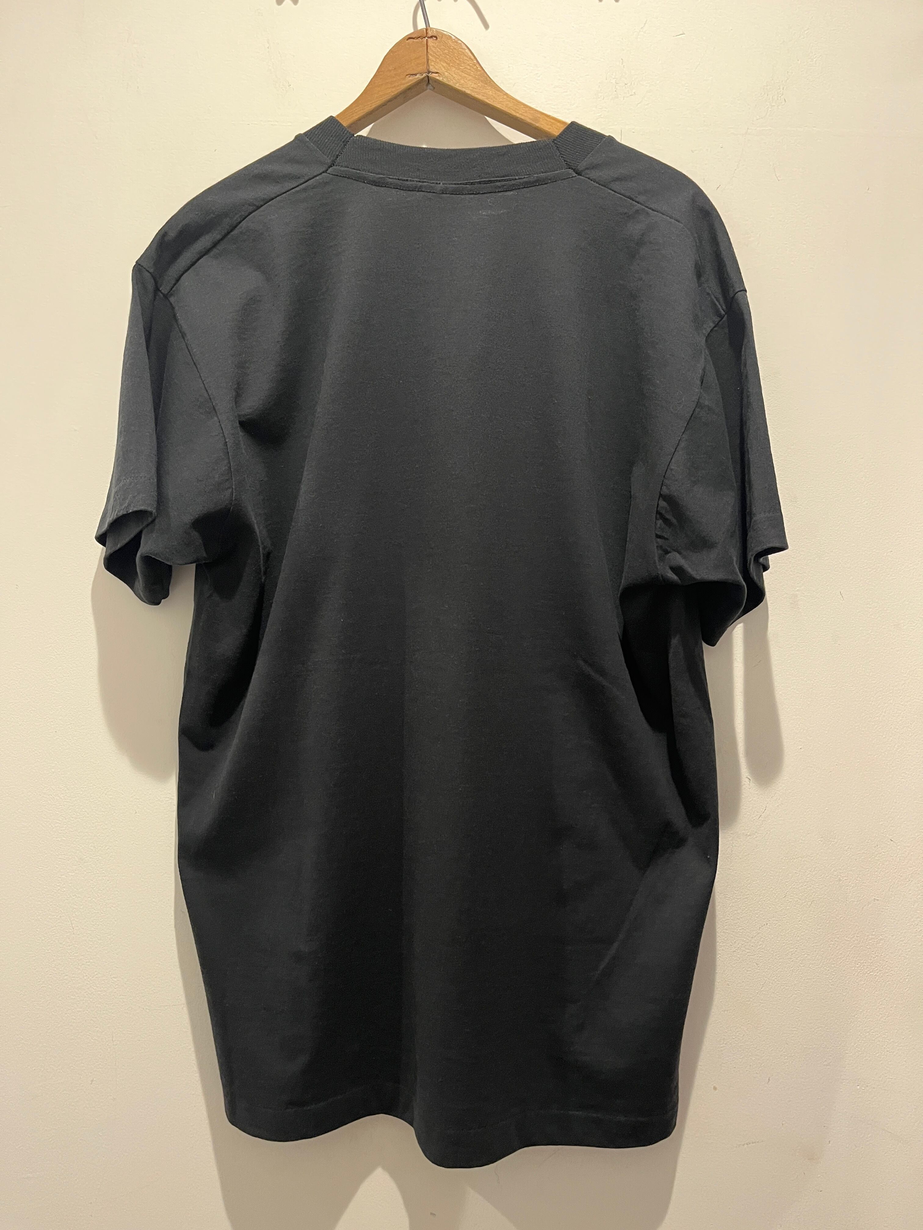 90年代アメリカ製のアートデザインTシャツです。ブラックボディにゴールドの箔プリントでデザインが入る珍しい1着となります。ネックレスが「サンフランシスコ」となっているのも洒落てますね。袖、裾ともにシングルステッチとなります。プリントとデザイン共に珍しく、しっかりアメリカ製のTシャツとユニセックスでオススメです。