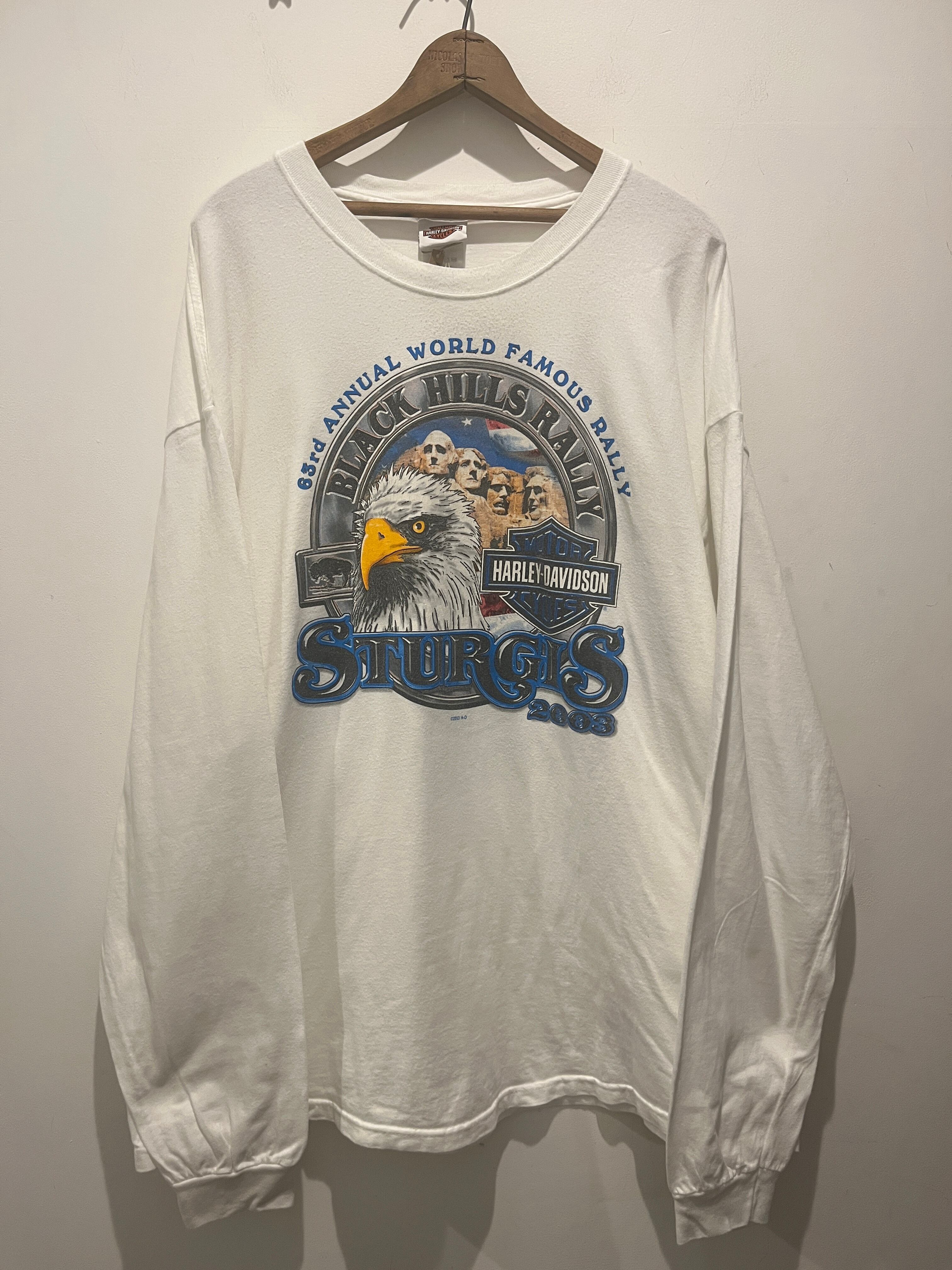 2000年代アメリカ製ハーレーダビッドソンのロングスリーブTシャツです。1903年にアメリカのウィスコンシン州ミルウォーキーで設立されたオートバイメーカー(HARLEY-DAVIDSON)通称ハーレーとしてとても有名ですね。こちらはそのハーレーのロングスリーブTシャツとなります。2XLの大き目なサイズ感で白ボディのフロント+バッグにもプリントが入ります。ヘインズのBEEFYボディを使用していて肉厚なコットン生地でシミなど無く綺麗な白とオススメな1着です。