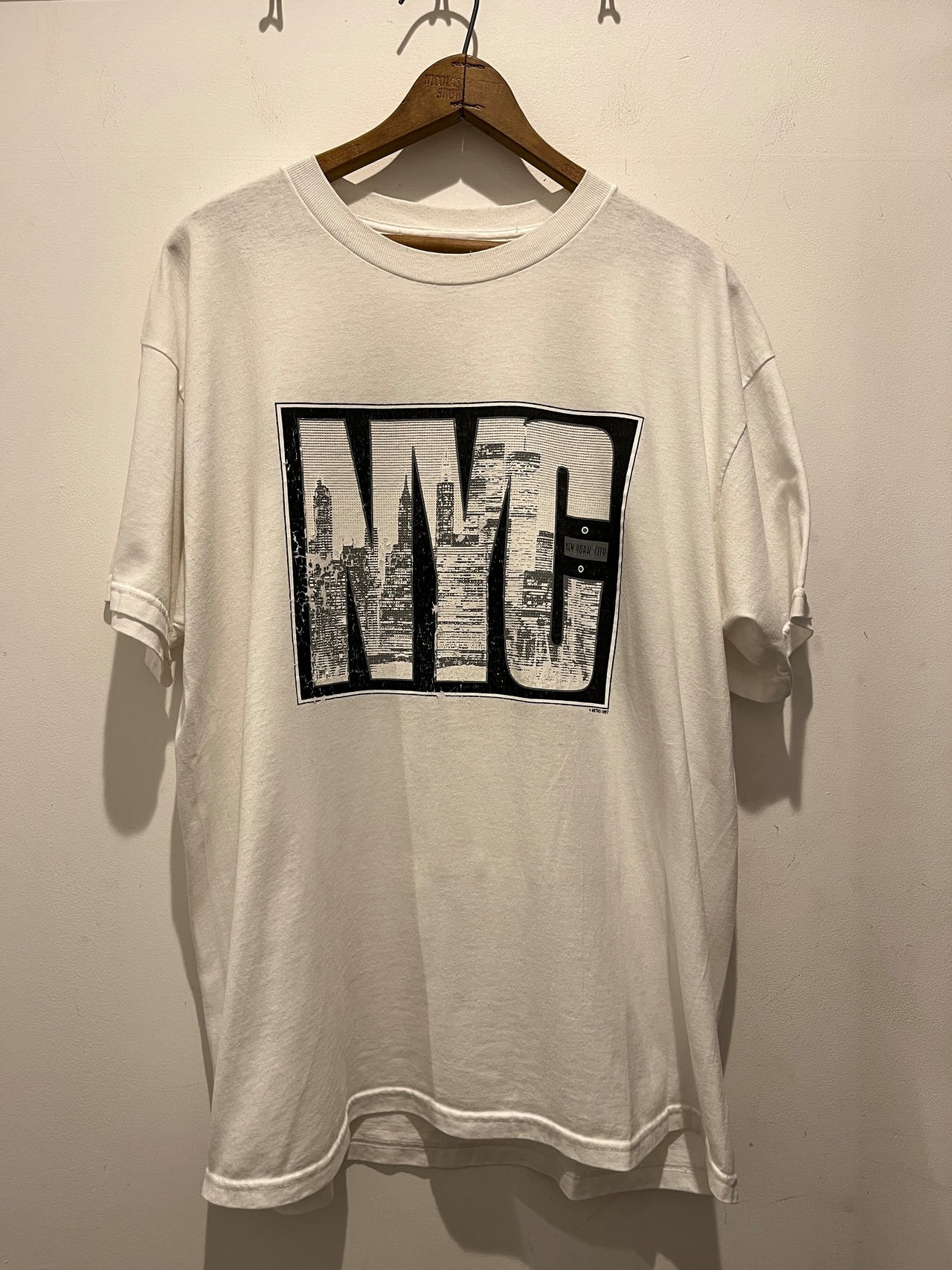 90年代NYCプリントのTシャツです。白ボディにNYCのプリントがカッコ良い1着です。プリントのかすれ具合もアート感と雰囲気が増して最高ですね。フルーツの2枚タグで1997年のコピーライトが入ります。袖、裾ともにダブルステッチとなります。白ボディでサイズもXLとオススメなTシャツです。