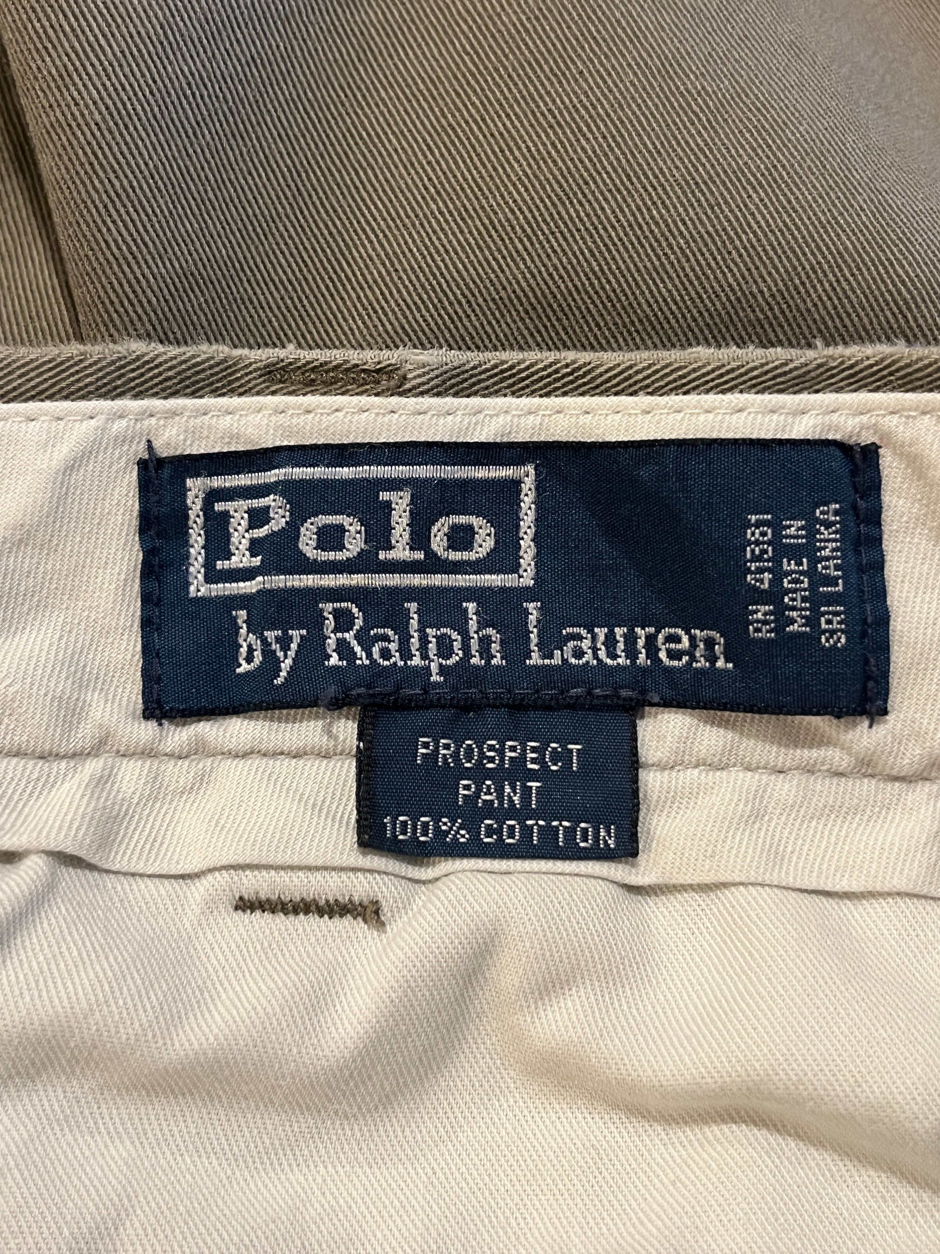 ラルフローレンのチノパンツです。ラルフチノはベージュ・ネイビーが多いなか、こちらは珍しいカーキカラーとなります。太めのシルエットでコットン100%とガシガシ履いていただける1本です。中々無いカーキ色で34×30とレングスも短めで良いサイズ感とオススメな1本です。
