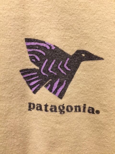 カラーはライトイエローです。90年代のパタゴニアのTシャツで希少なアメリカ製の物になります。胸にワンポイントとバッグプリントもありパタゴニアらしい山や生き物、自然をデザインしているのが良いですね。毎年かラーリングなども変化があるのでコレクションにもオススメです。