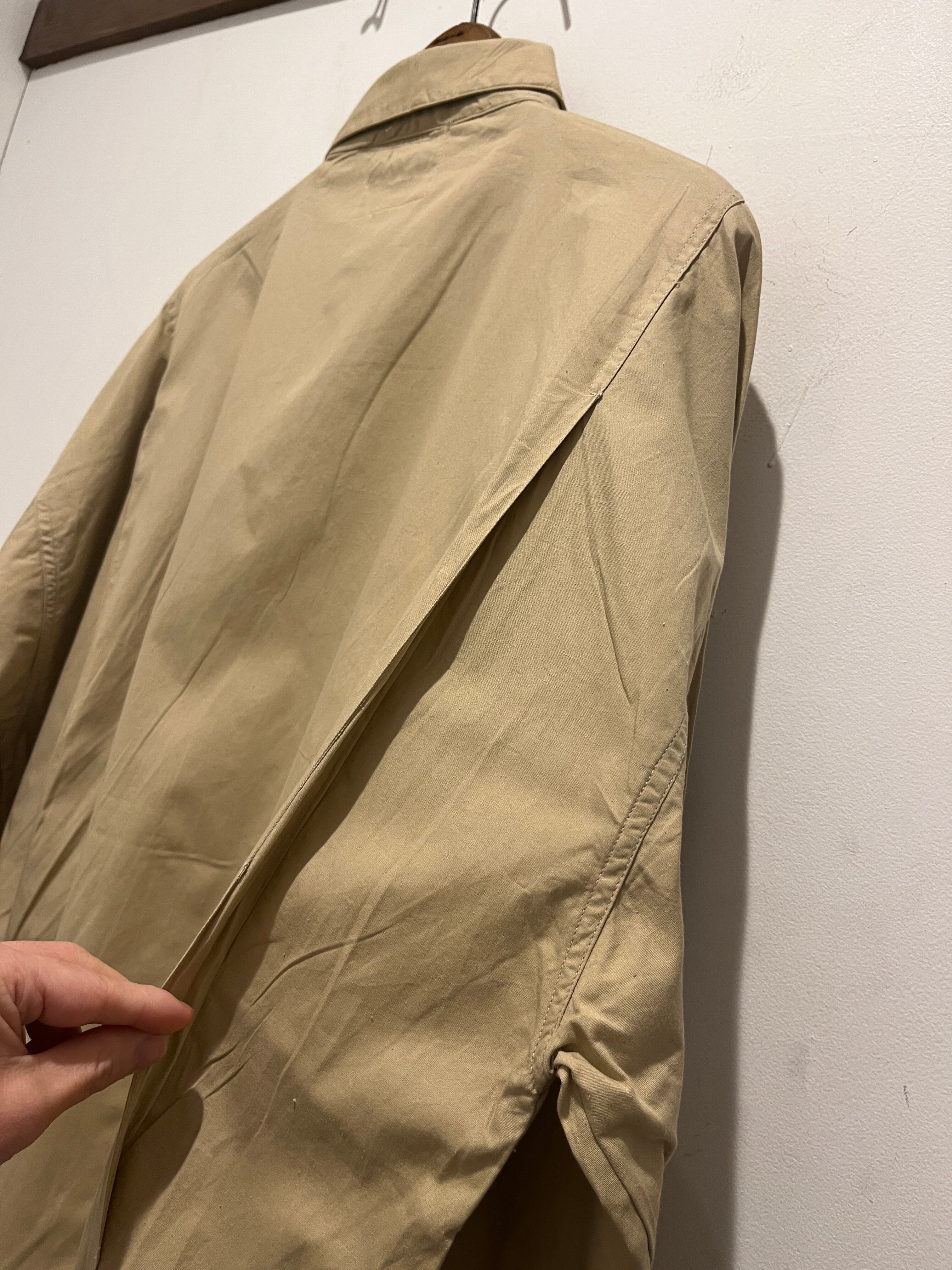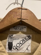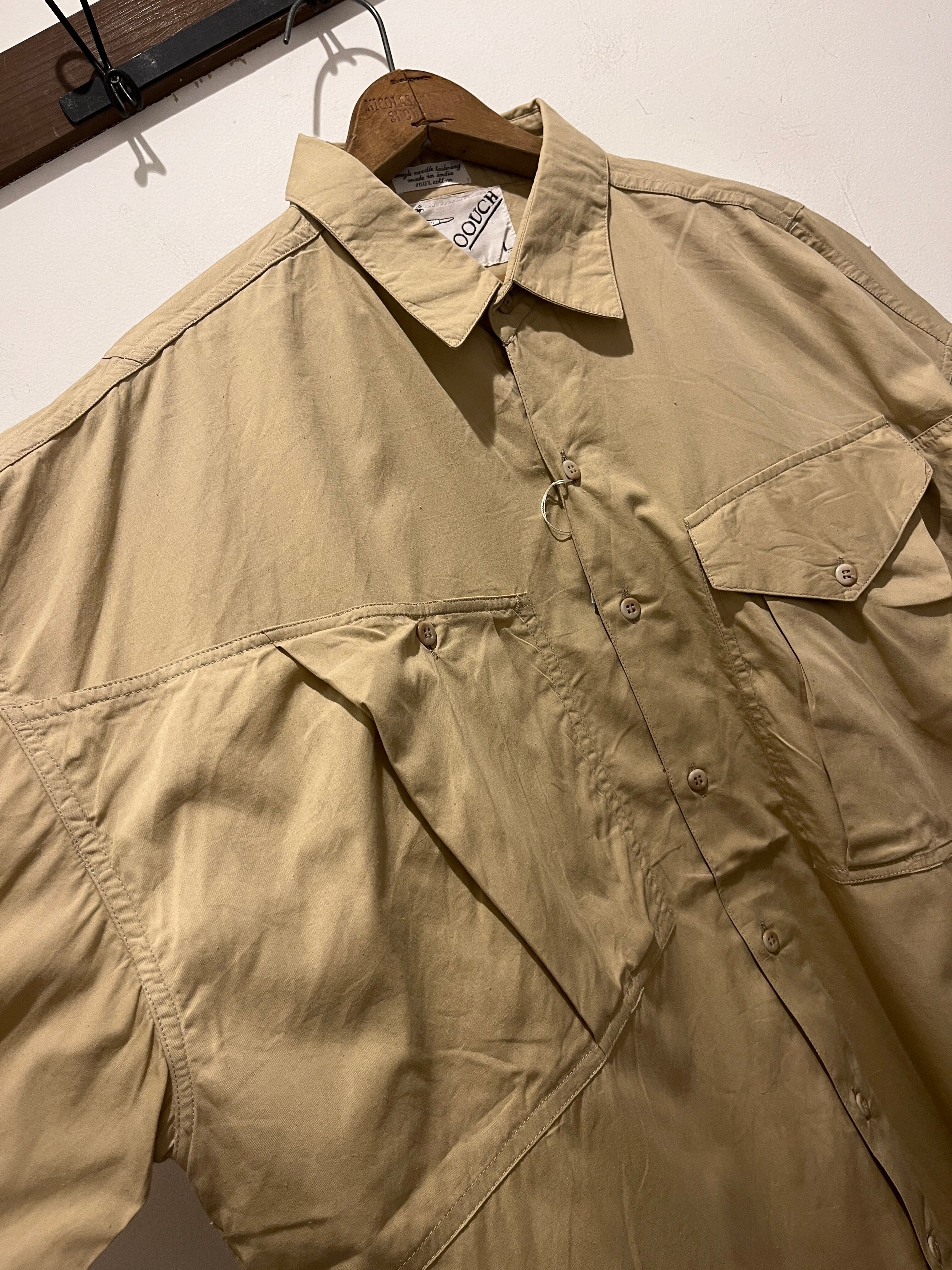 90年代グーチのデザインシャツです。イギリス人フォトグラファーとして活動していたAlan Goouchが1960年代頃にロンドンから移住してカナダで起こしたメーカーGOOUCH。こちらはベージュカラーでフロントに左右非対称の大きめなポケットがデザインされた変わり種な1着です。アクションプリーツやボタンのデザインまで細かいディテールもこだわっていますね。ポプリンのようなハリのある生地感で質も良くオススメなシャツです。