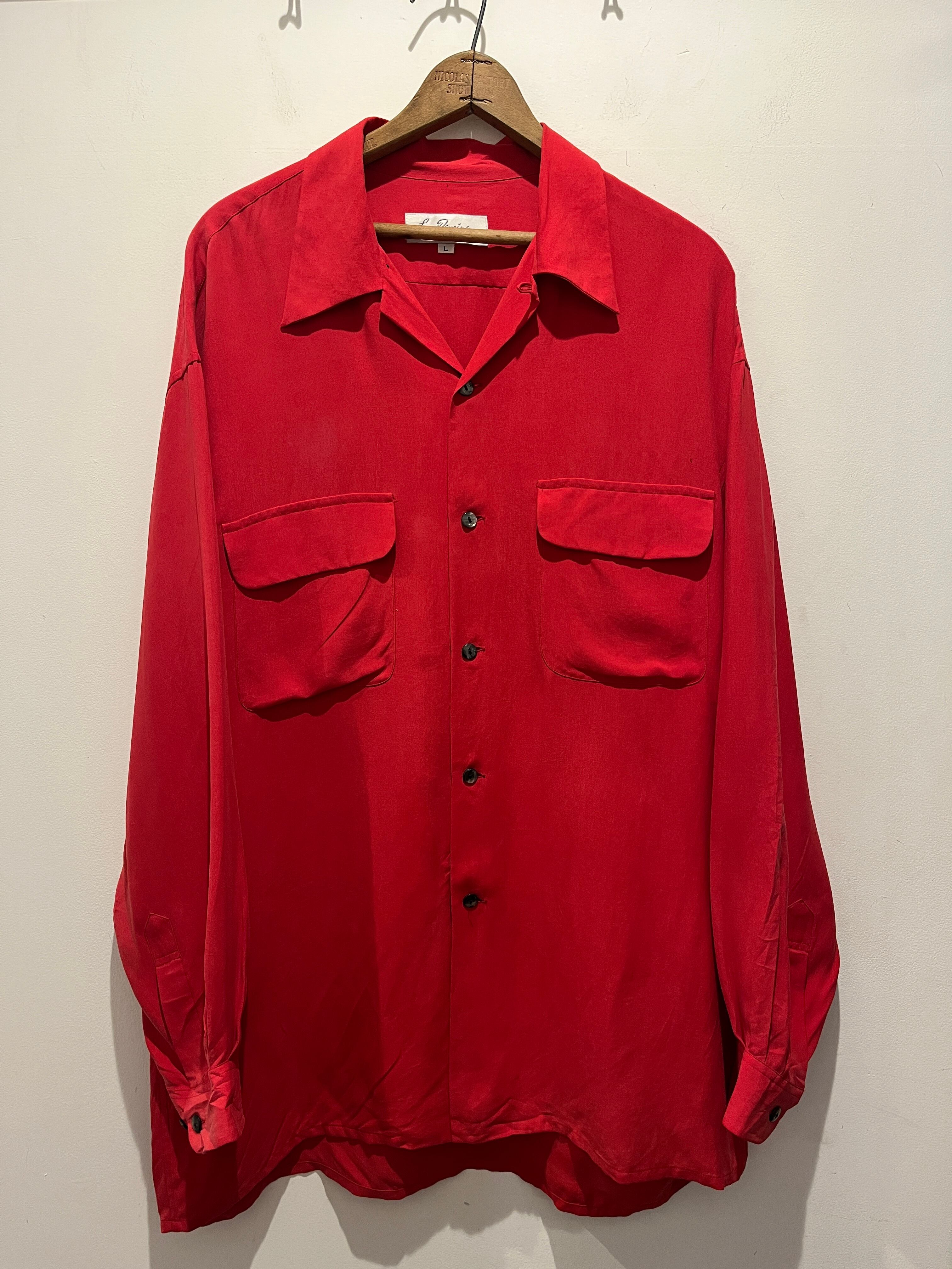 90年代のオープンカラーシルクシャツです。深みのある赤でフラップポケット付きのオープンカラーとなります。ヴィンテージレーヨンシャツの雰囲気たっぷりでシルクもレーヨンに近く少し厚みもありドレープ感もあってとてもかっこいい1着です。ヴィンテージでも中々見つからない大きめなサイズ感で質も良くオススメです。