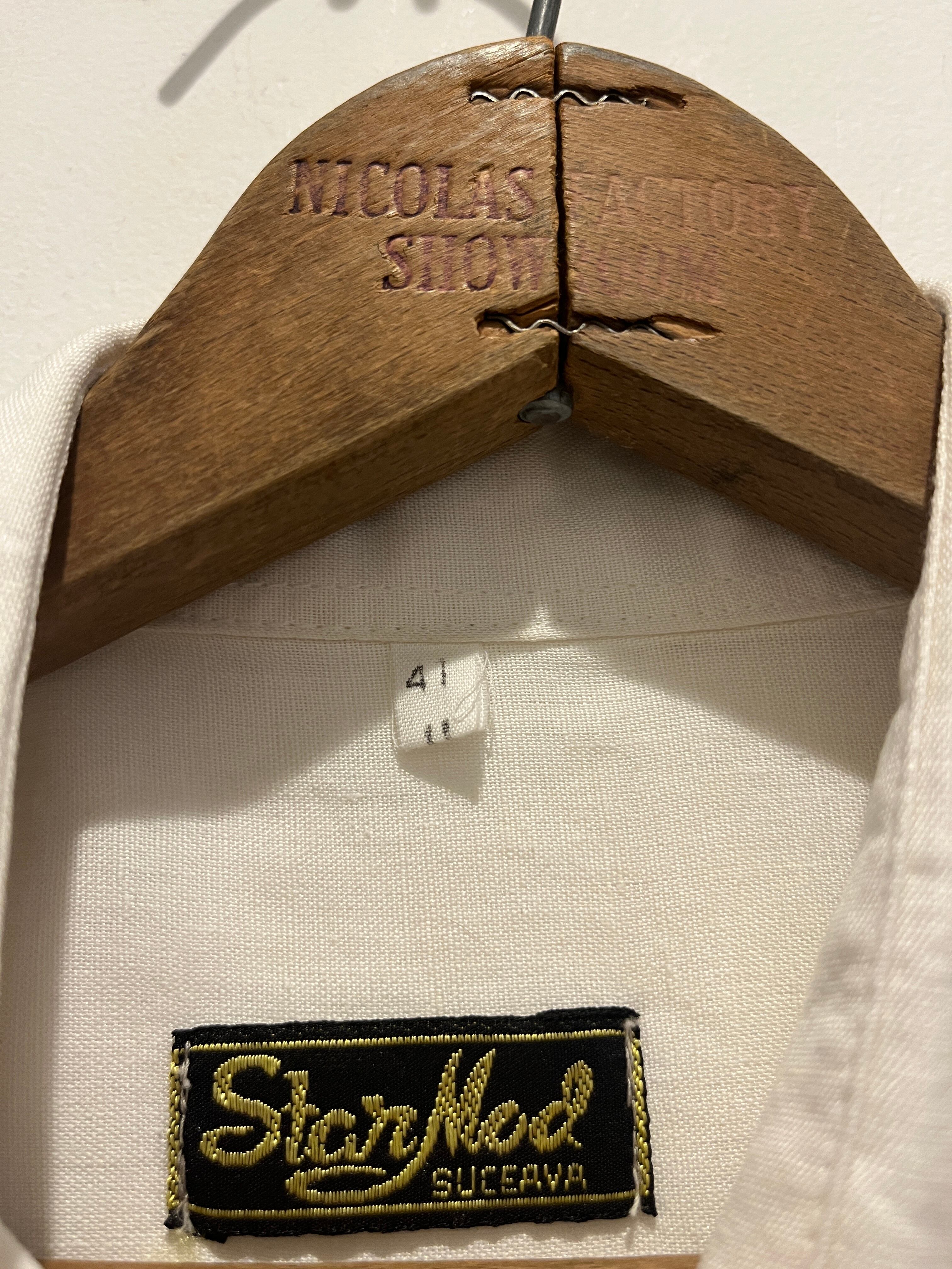 70年代〜80年代ユーロのデザイン白シャツです。ルーマニア製の物でプルオーバーの形となります。胸の刺繍や襟の形、ボタンの付き方などデザインもお洒落な1着です。袖が長めでガーゼの様な涼しい生地感も最高です。コンディションも良くユニセックスでオススメなアイテムです。