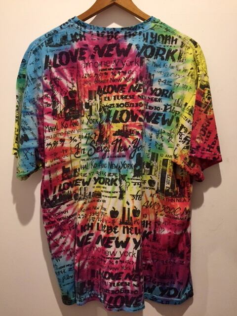 タイダイカラーベースです。タイダイカラーのTシャツは良く見ますがこちらは更に総柄のデザインがあり「I LOVE NEW YORK」の文字が世界の言葉で書いており自由の女神やニューヨークの町並みが描かれているオシャレな1着です。フェスなんかにも良いTシャツですね。
