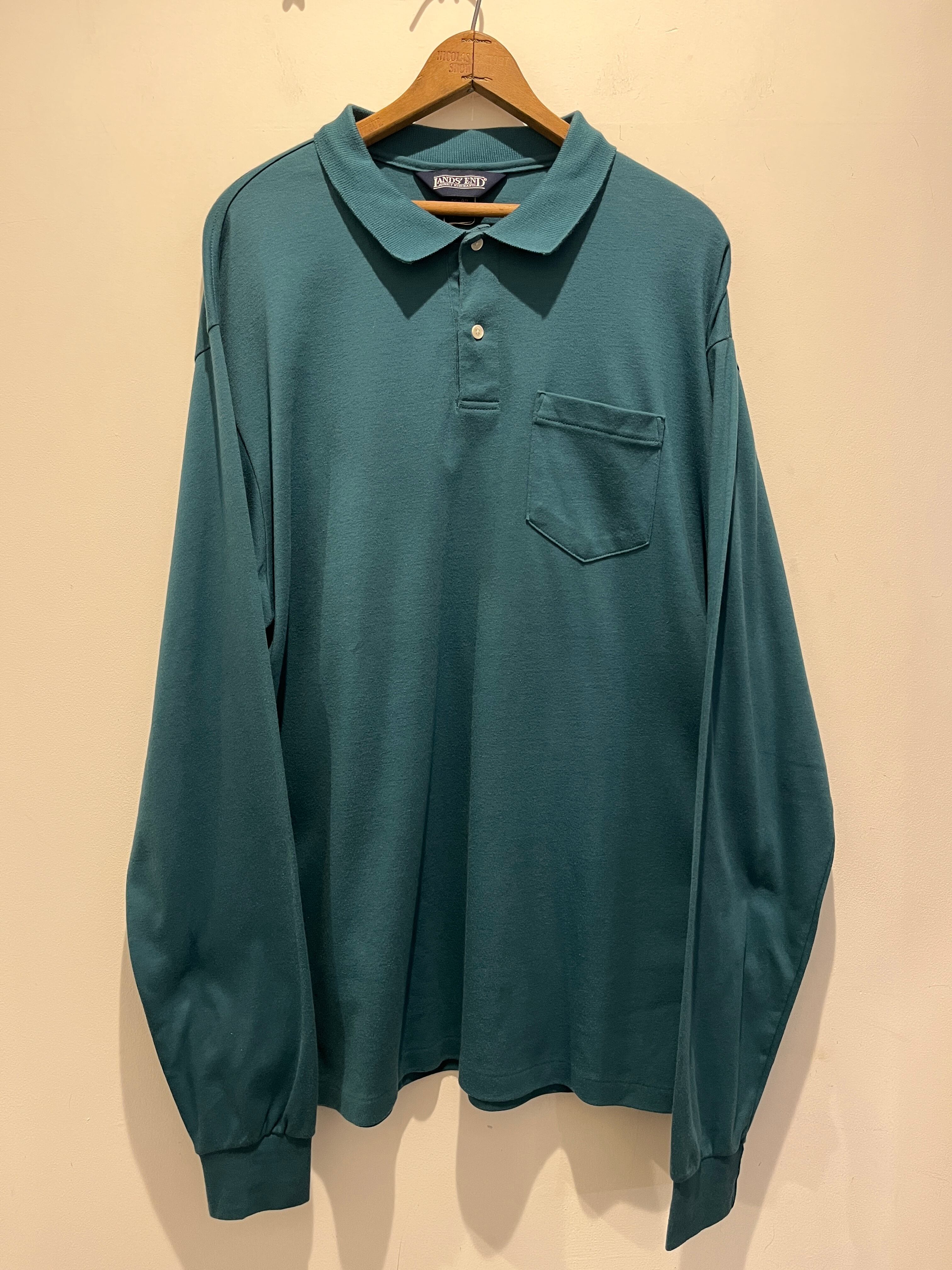 90年代アメリカ製ランズエンドのロングスリーブポロシャツです。グリーンとブルーを混ぜたような良いカラーとなっています。1994年製造の物でしっかりアメリカ製なのも嬉しいポイントですね。ゆったり着用出来るサイズ感でタックインしてスッキリ着用するのもオススメです。