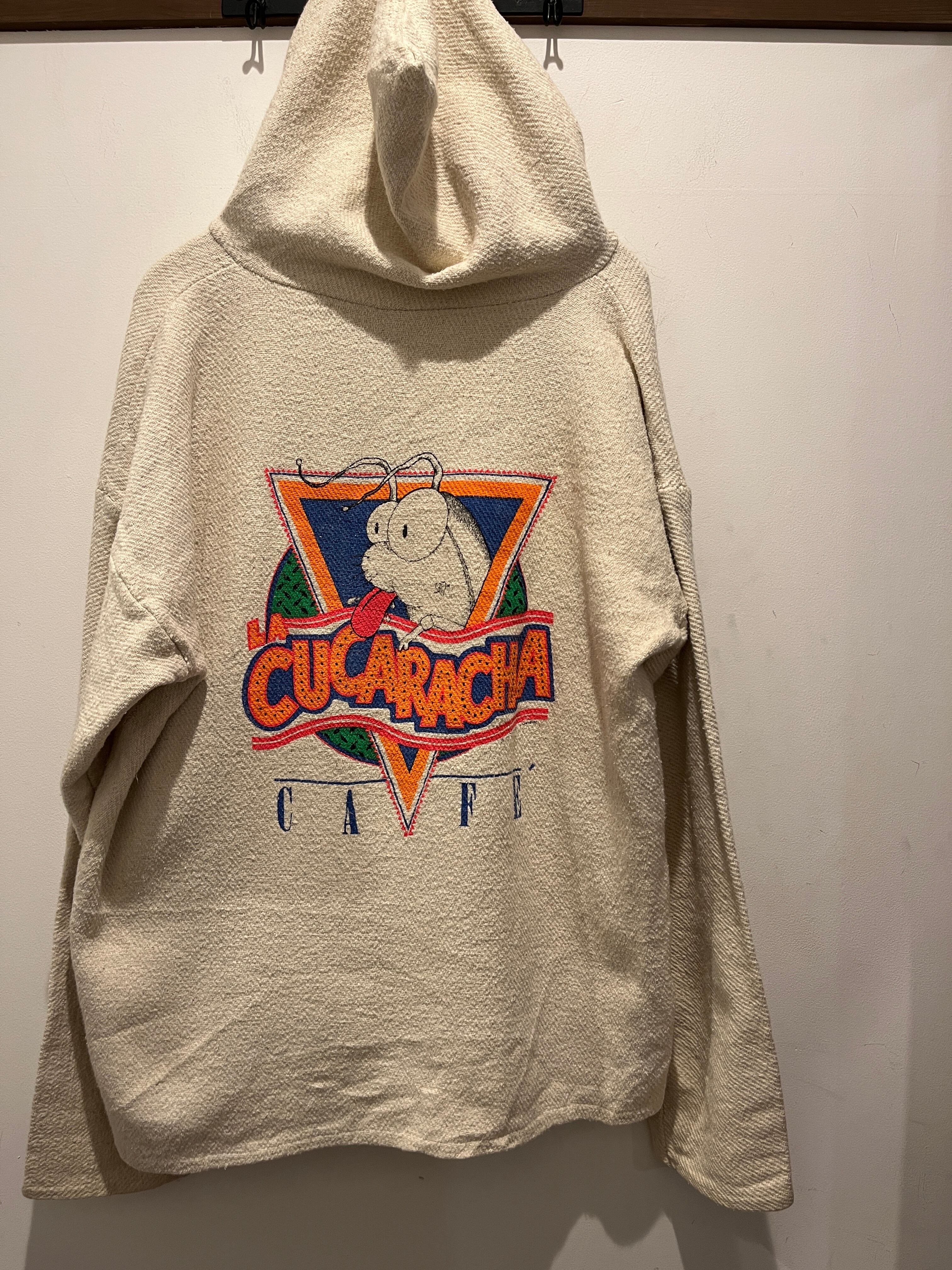 90年代のメキシカンパーカーです。ホワイトカラーでコットン100%のしっかりとメキシコ製のアイテムとなります。ホワイトベースのメキパが出てきてもコロナビールやハードロックカフェの物が多い印象ですね。こちらはユーモアのあるゴキブリプリントと珍しい1点となります。コピーライトが薄くなっておりますがコンディションも良くゆったり目なサイズ感とオススメです。