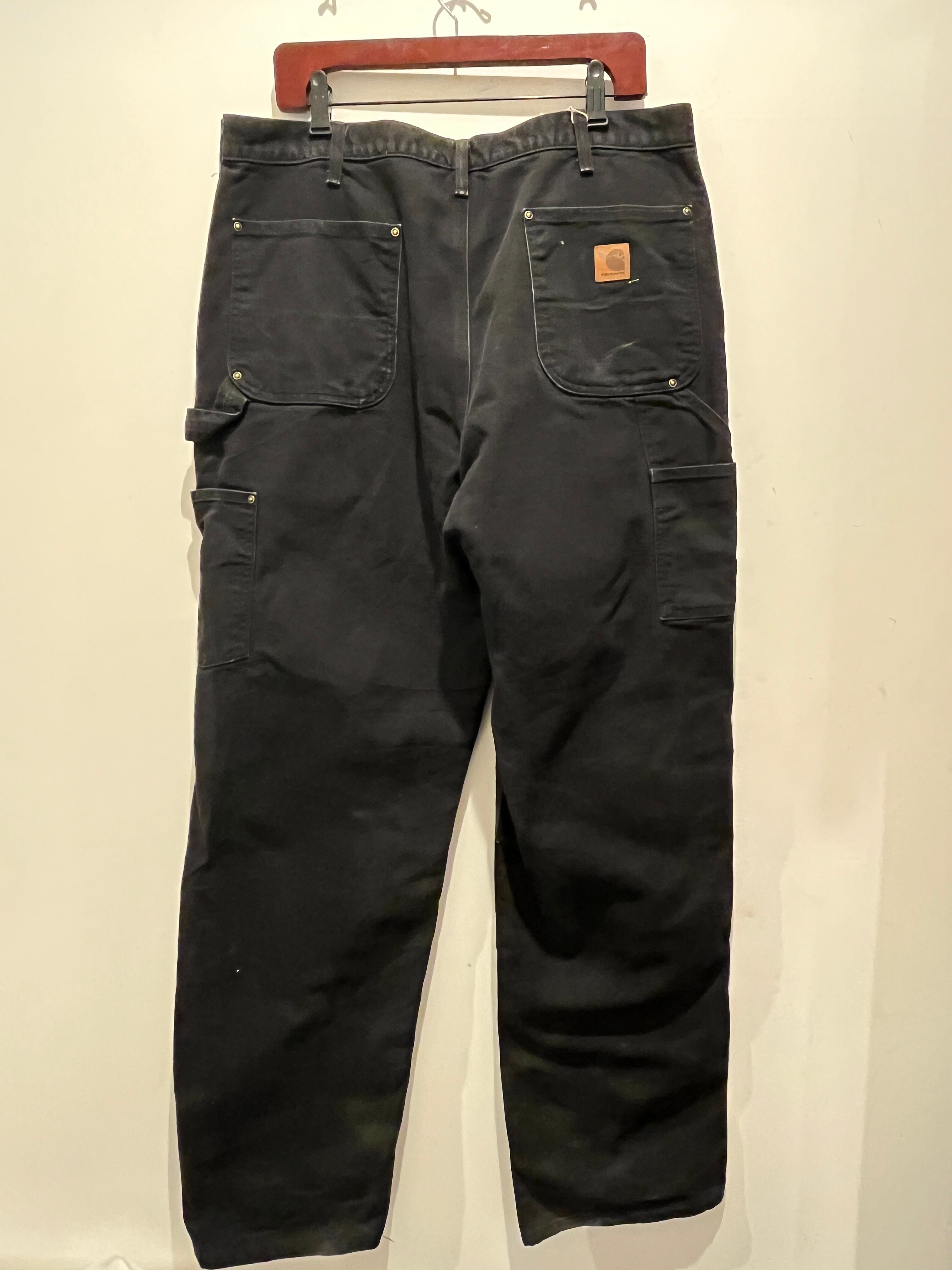カーハートのダブルニーペインターパンツです。ブラックカラーでジッパーはYKKを使用しています。ダック地にダブルニーと無骨で、当時履いていた人の擦れやペンキ飛びがリアルワーカーでとてもかっこいい1本です。ウエスト少し大きめですがベルトで絞って履いていただくと太めのシルエットも演出できオススメです。