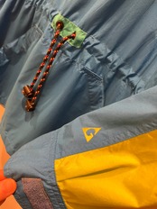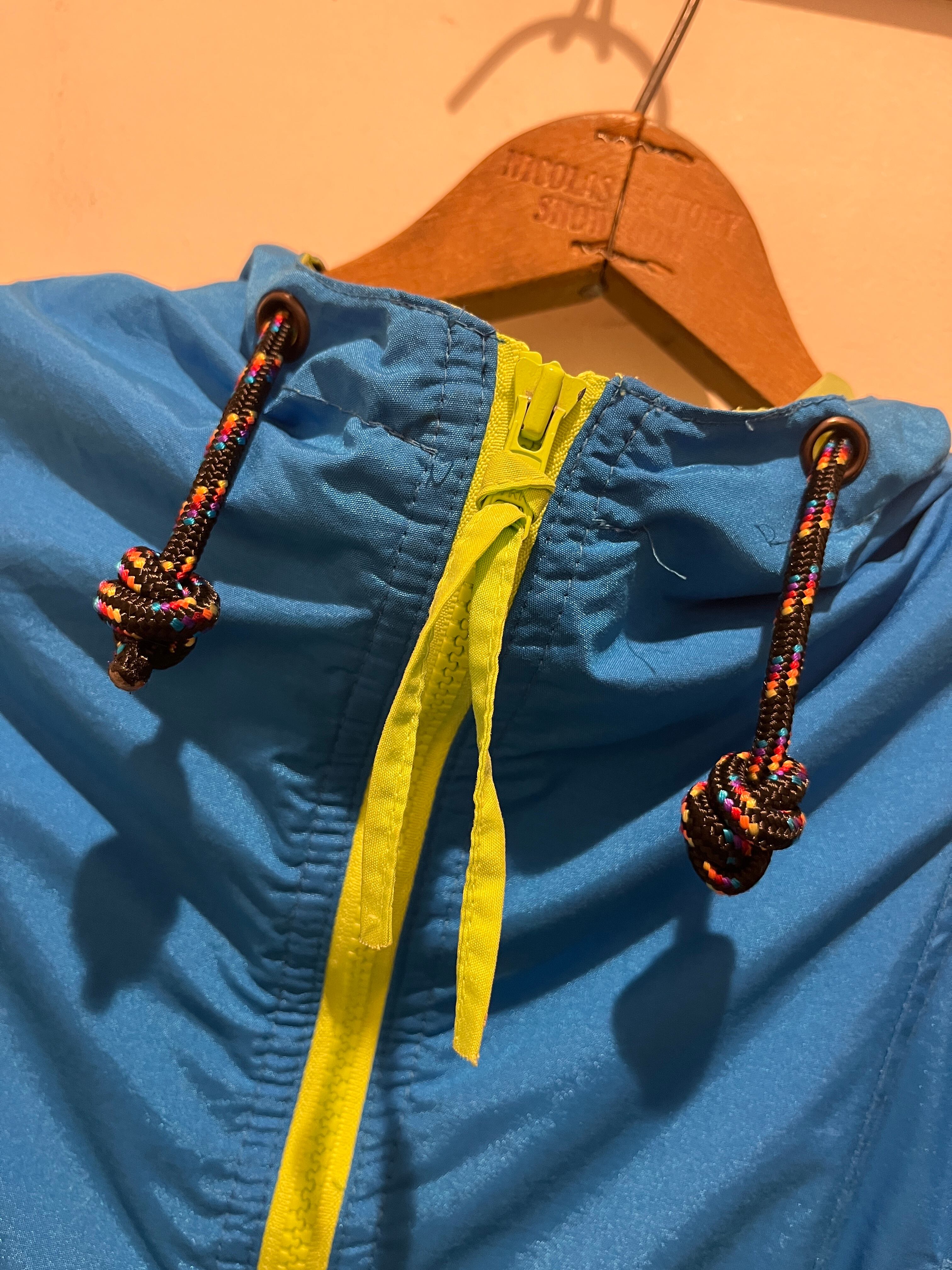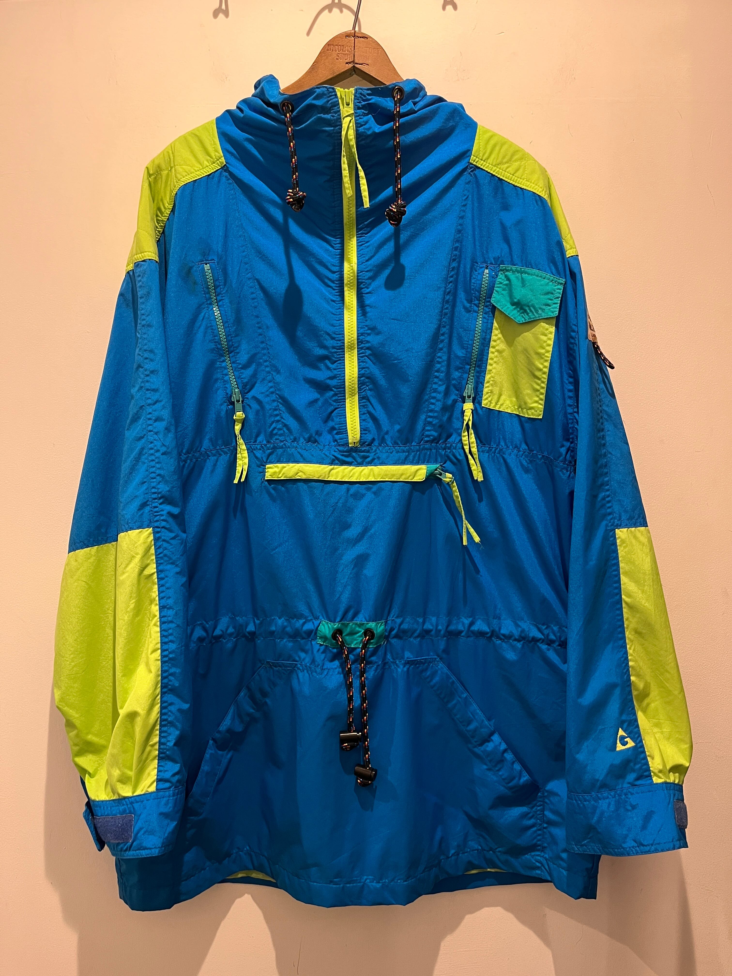 90年代ジェリーのアノラックパーカーです。ターコイズブルー×ライムグリーンの配色が珍しい1着です。またフロントの片側に付くポケットのデザインなどもアクセントになっていますね。GERRYのアイテムは面白い物も多く、こちらも個性的なアノラックパーカーで人と被りたく無い方にもオススメなアイテムです。