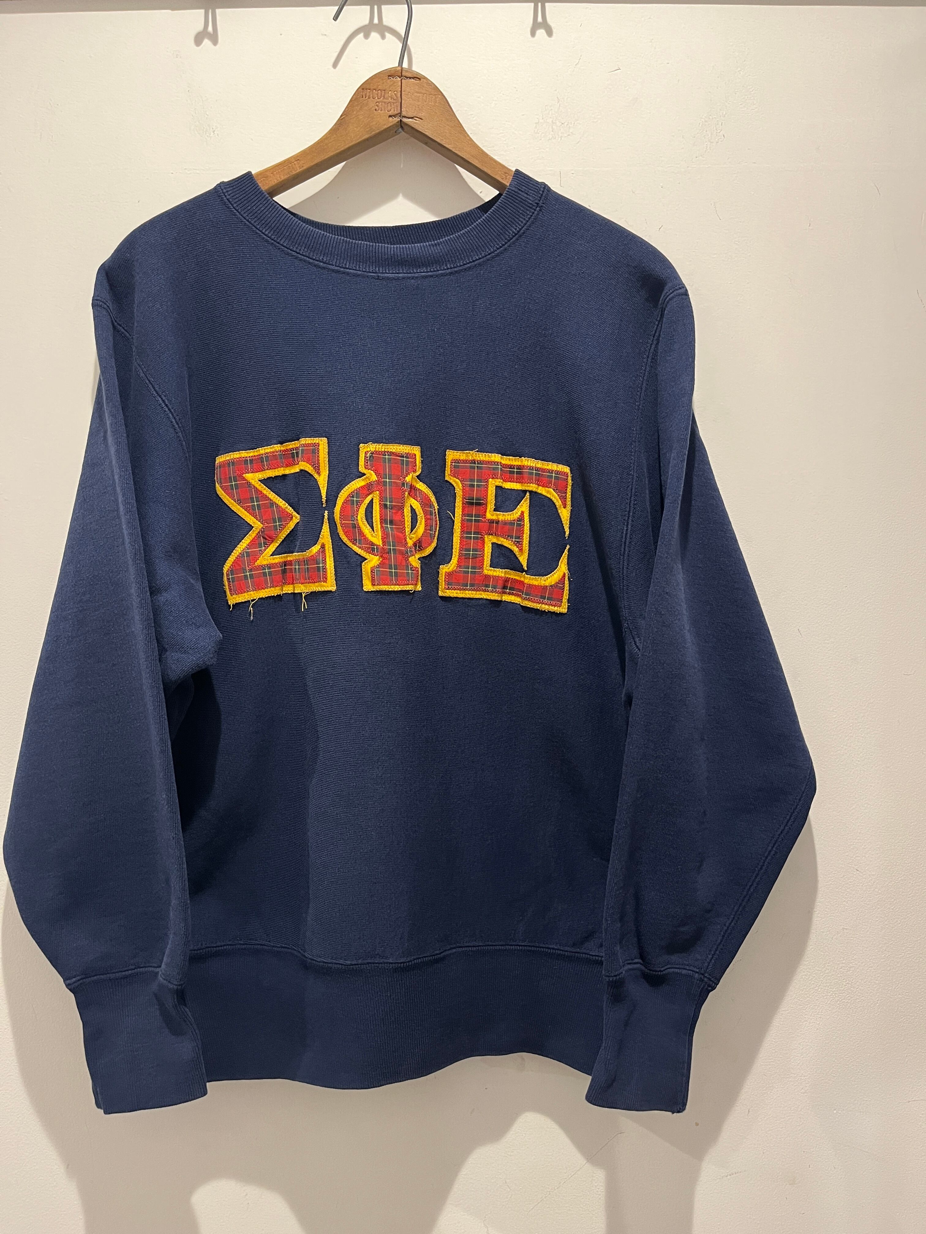 90年代アメリカ製チャンピオンのリバースウィーブです。刺繍タグが付く90年代前半の物でしっかりアメリカ製のリバースとなります。ネイビーボディにチェック柄のギリシャ文字のパッチがアクセントになっている1着です。コンディションも良くユニセックスでオススメです。