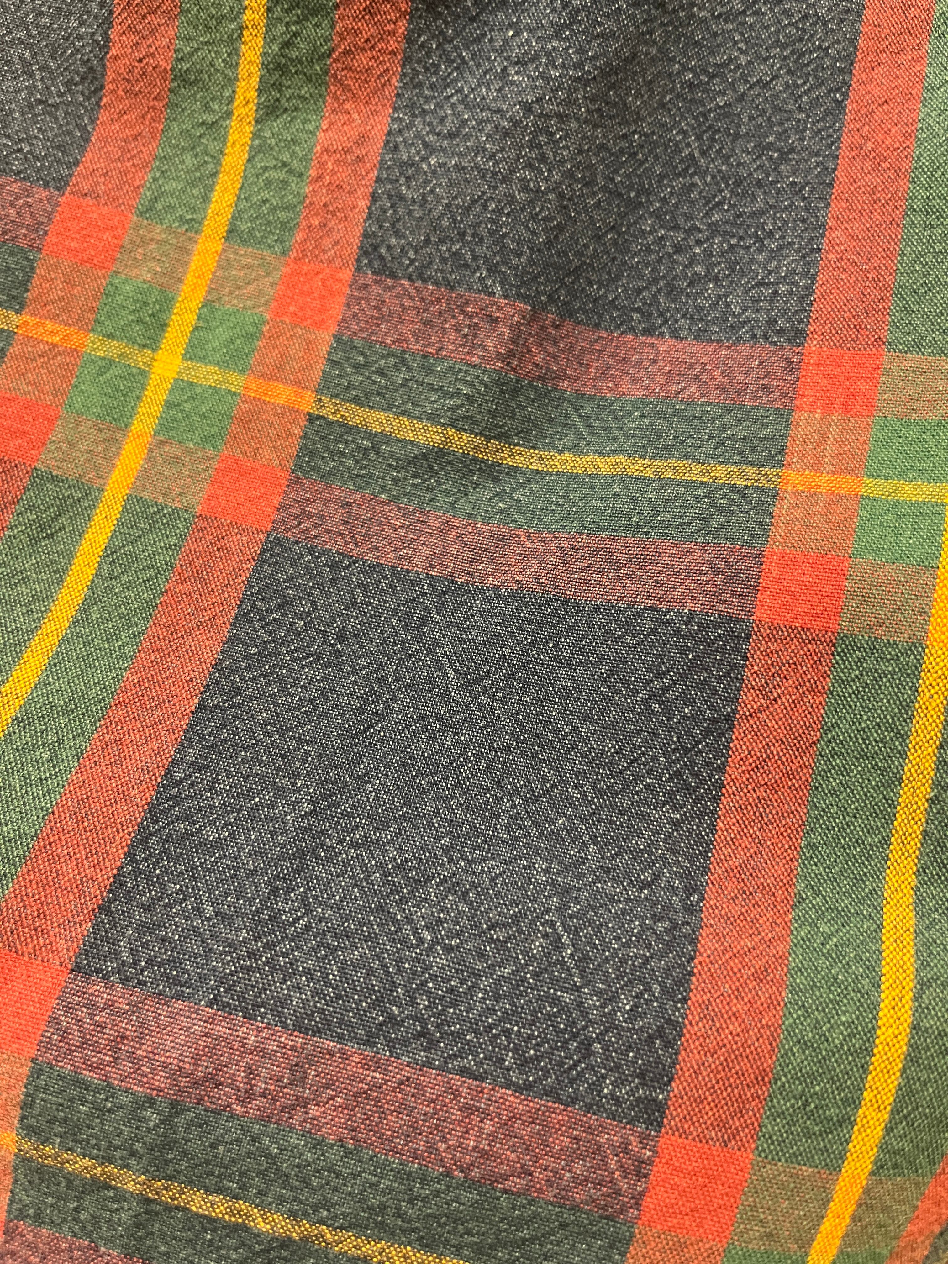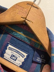 90年代アメリカ製リーのデニムシャツです。珍しいチェック柄のデニムで大きめのフラップ付きのポケットがアクセントになっています。柄合わせもしっかりしていてボタンもデニムに合わせてネイビーカラーなのがとても良いですね。着込むとアタリなども出て来て経年変化も楽しめる1着でオススメです。
