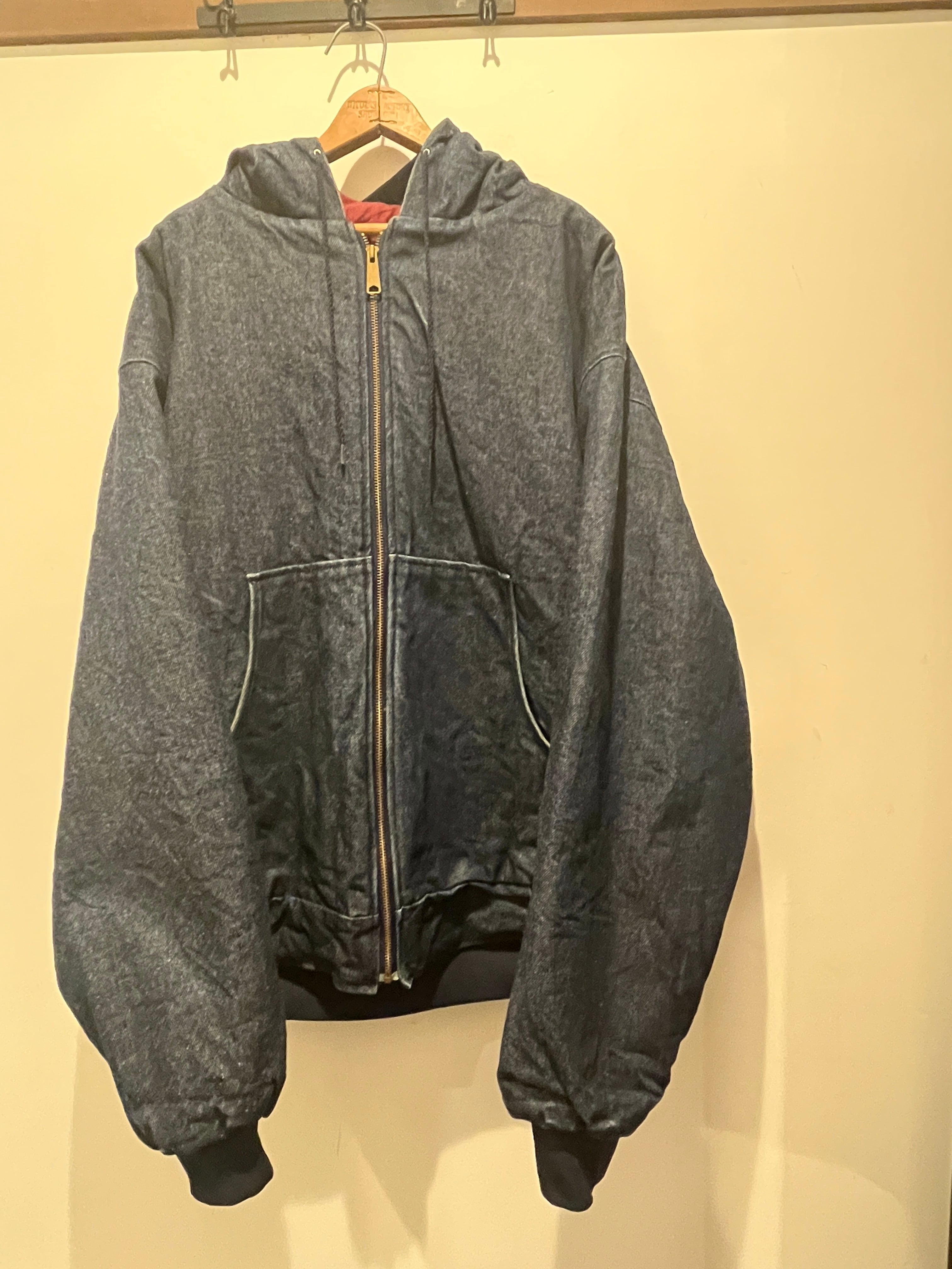 80年代〜90年代アメリカ製のデニムジャケットです。カーハートの名作アクティブジャケットに似たデニムのフードジャケットとなります。デニムの生地感も良く袖のアタリなども良い感じですね。しっかりアメリカ製でフロントにタグなども付かずシンプルで着用しやすい1着です。大きめなサイズ感でコンディションも良くオススメです。
