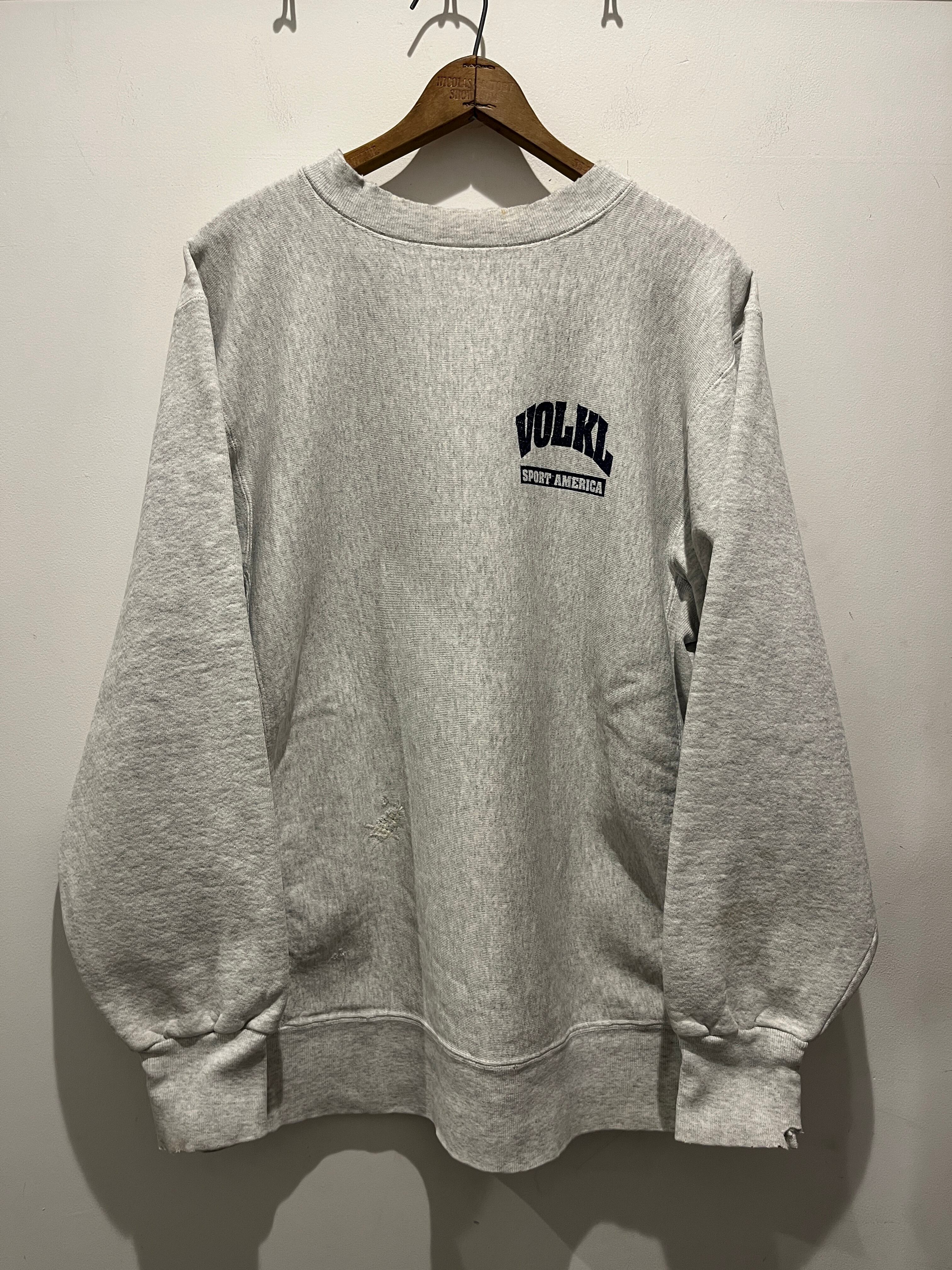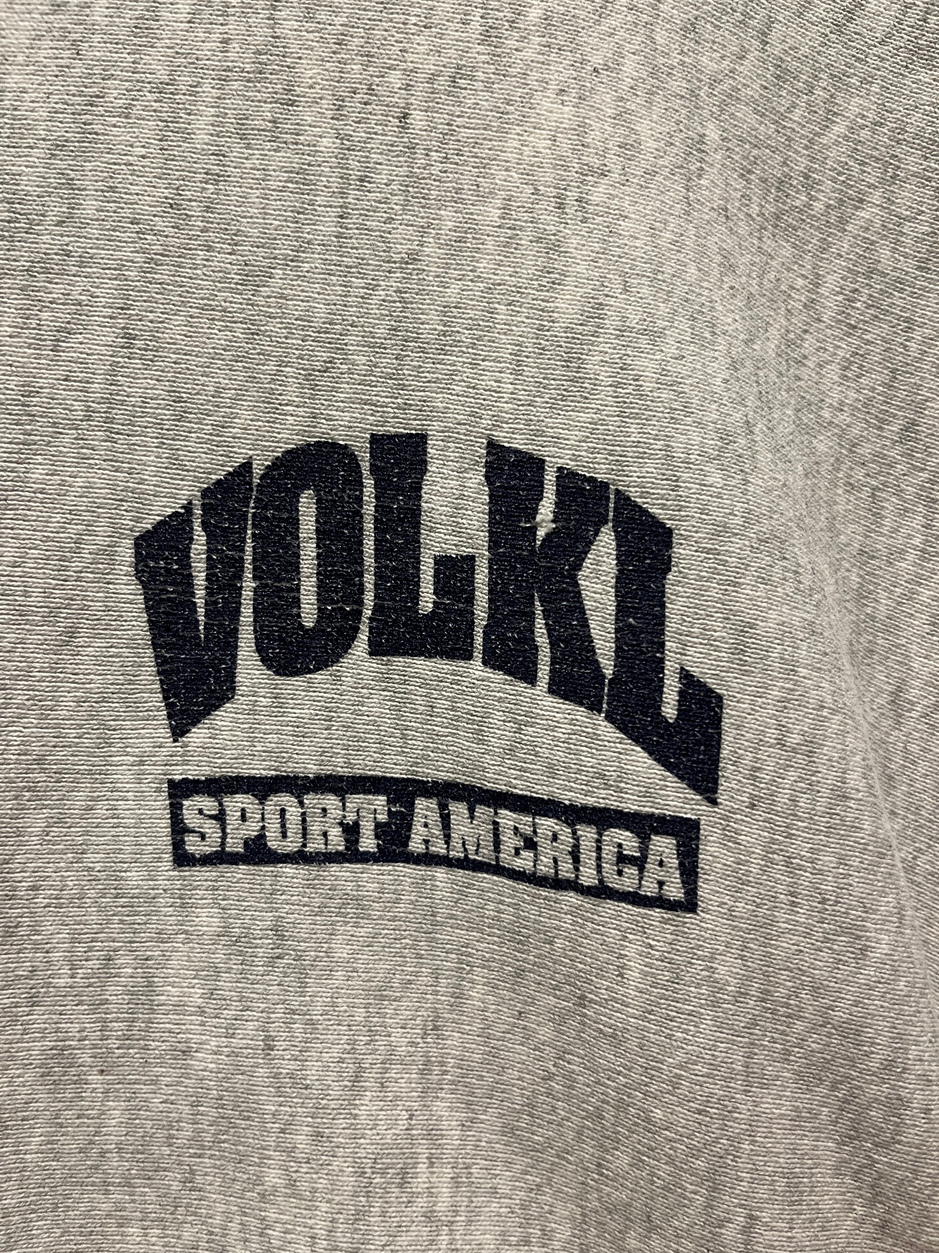 90年代アメリカ製のリバースタイプスウェットです。グレーボディに胸とバッグに大きくプリントが入り良いデザインとなっています。ドイツのフォルクルというスポーツブランドの物で、こちらはアメリカ支店で当時着用されていたアイテムと思われる1着です。チャンピオンのリバースには無いデザインがまた良いですね。ボロ系の雰囲気物でお好きな方にはオススメです。