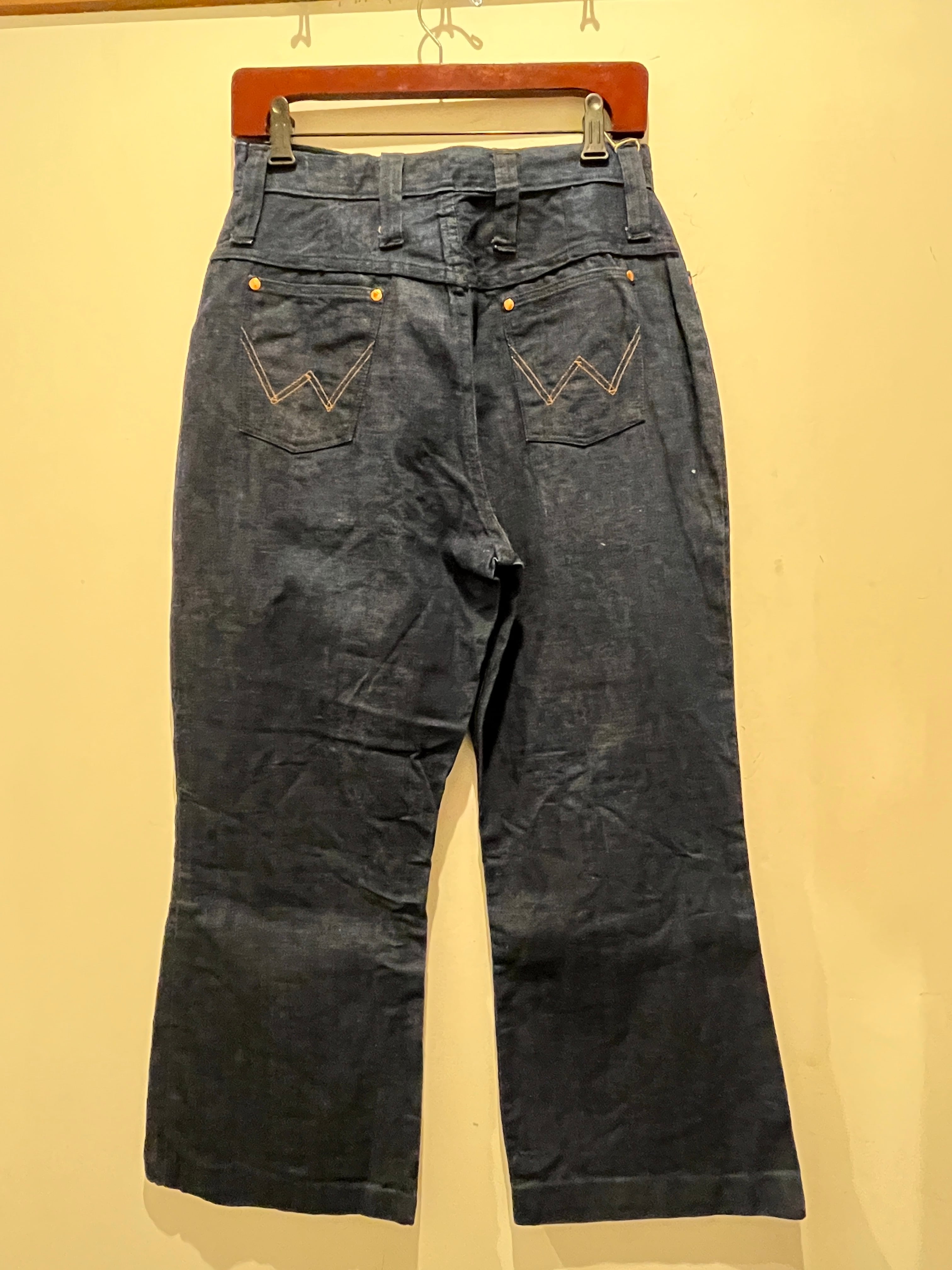70年代アメリカ製ラングラーのデニムパンツです。レディースのラングラーデニムで色が濃くとても良いコンディションの1本です。トップはスナップボタンでスコービルジッパーを使用しております。レディース物らしくお尻周りと太ももあたりがゆったり目な作りで、少しワイド目なブーツカットシルエットとなっています。50年程前のデニムパンツですがコンディションも良くオススメです。