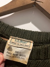 70年代イングランド製L.L.ビーンのコマンドセーター です。カラーはミリタリー カーキです。素材にはウールを使用しインナーとしての着用が考慮されている為、身体にフィットするよう伸縮性に優れた特有の編み方となっています。肩と肘には補強の為の別生地があしらわれていて機能性も抜群な1着です。袖は長めに作られていて折り曲げて調整できるようになっています。一見シンプルですがいろいろと考えられたアイテムでハイブランドのサンプルとしても使われているコマンドセーター 。イングランド製L.Lビーンニットというのも嬉しいポイントでオススメです。