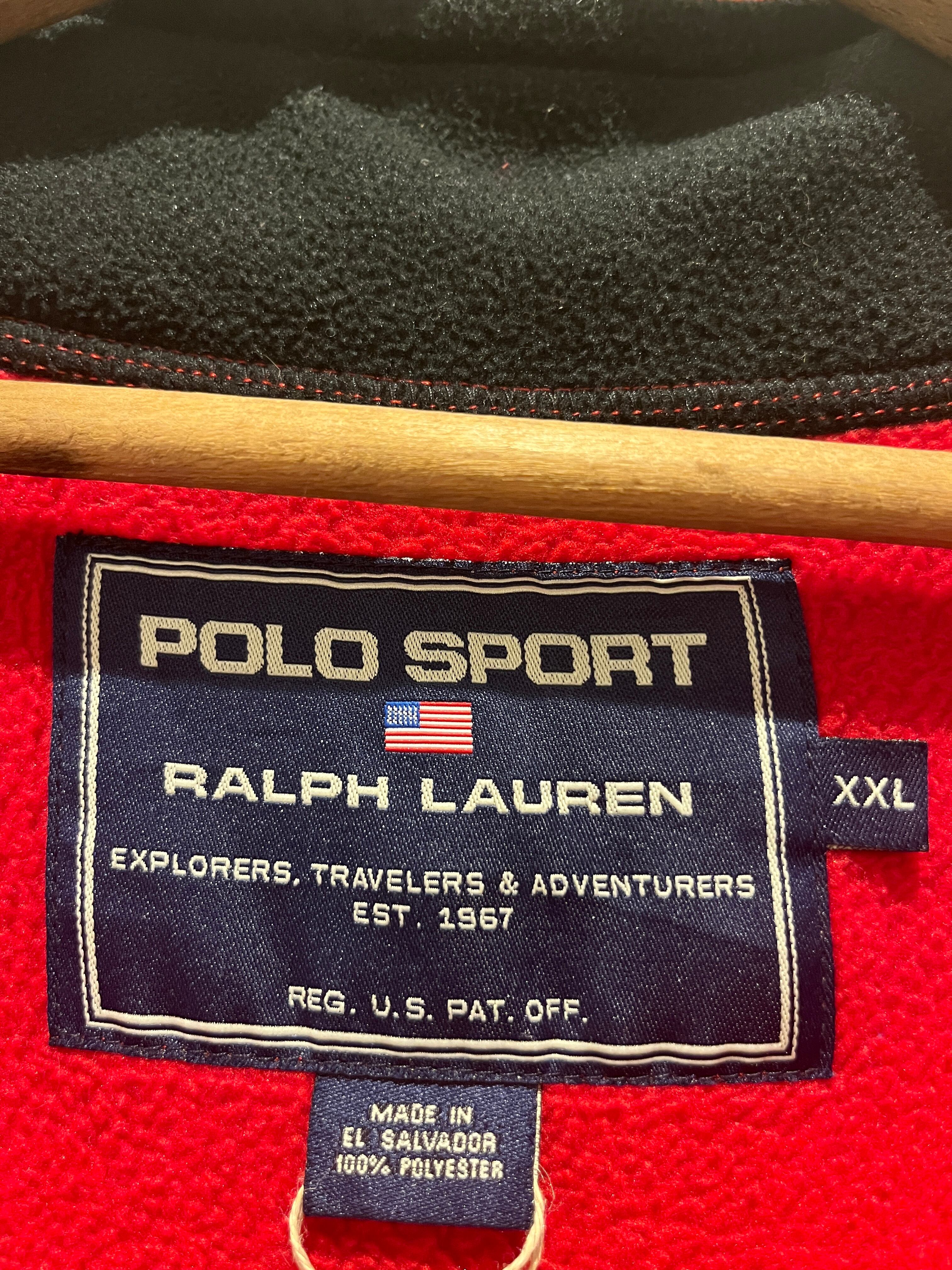 90年代ポロスポーツのフリースジャケットです。カラーは赤でフルジップ仕様となっています。またポーラテック仕様なので軽くて暖かさもあり、更に速乾性にも優れているのが良いですね。身幅たっぷりな作りで裾にドローコードも付いていて調整出来るのも嬉しいポイントですね。フリースもまだフカフカでコンディションも良くオススメな1着です。