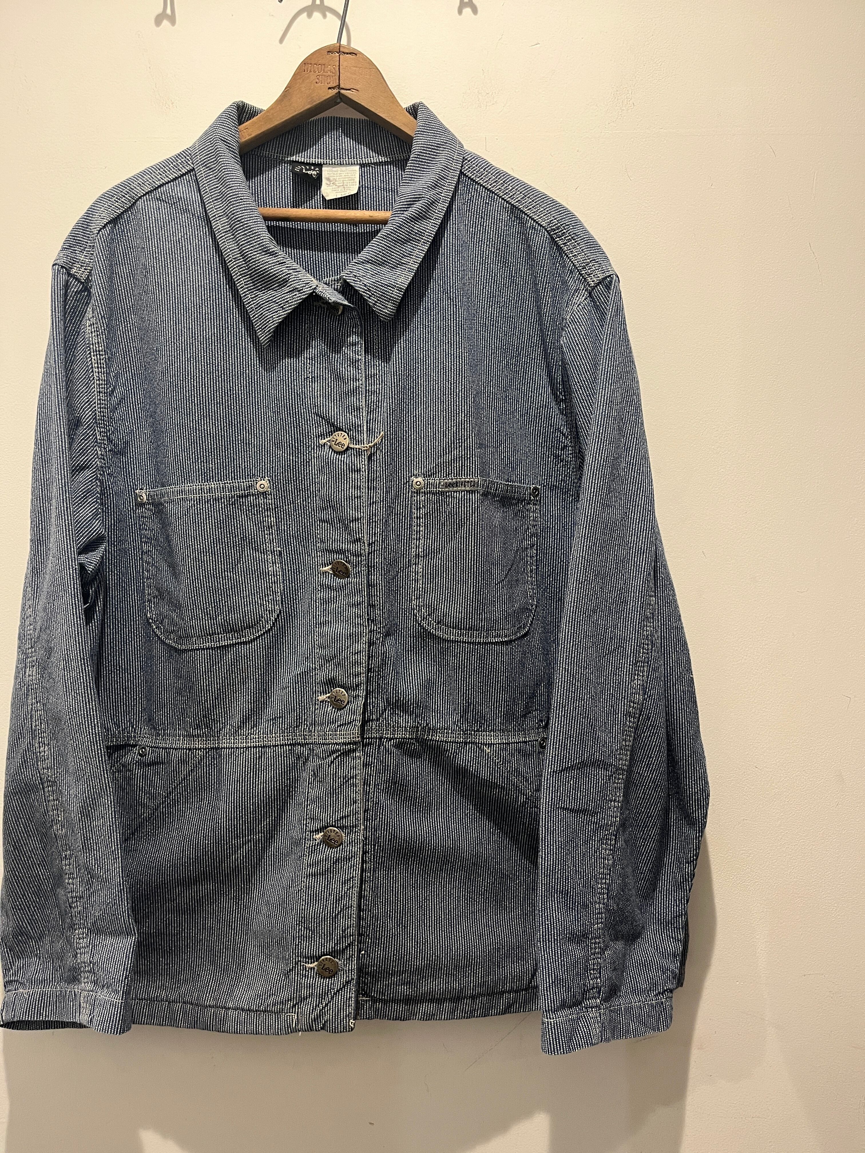 90年代アメリカ製リーのチョアジャケットです。ヒッコリーストライプのカバーオールでレディース合わせの物となります。サイズ感的にはメンズも後ろにダーツなど入っていないので問題無く着用出来ます。年代は浅いですがリベットが打ってあったりトリプルステッチだったりとワーク感もあり、しっかりとアメリカ製なのもポイントですね。コンディションも良くユニセックスでオススメな1点です。