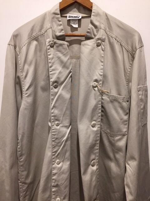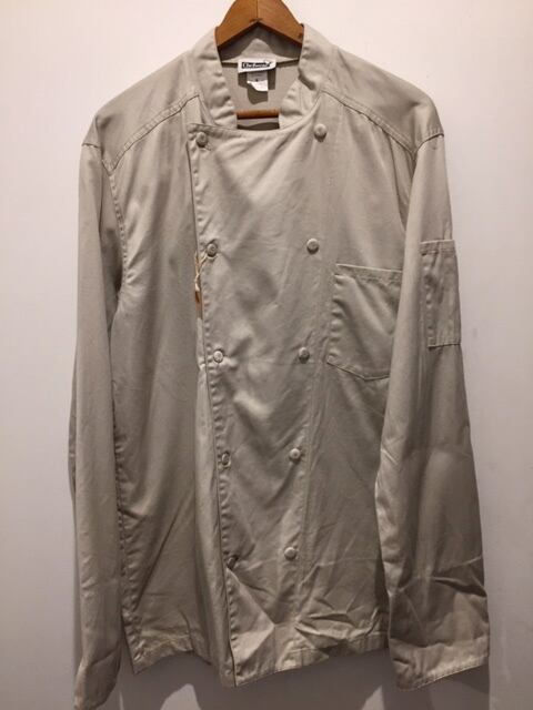 カラーはベージュです。珍しいシェフシャツで素材には100%オーガニックコットンと質も高く長く着用して頂ける1着です。生地も少し厚めでジャケット感覚でいけボタンを裏に付けるとナポレオンジャケットの様にも出来ます。なかなか見つからないのでオススメです。