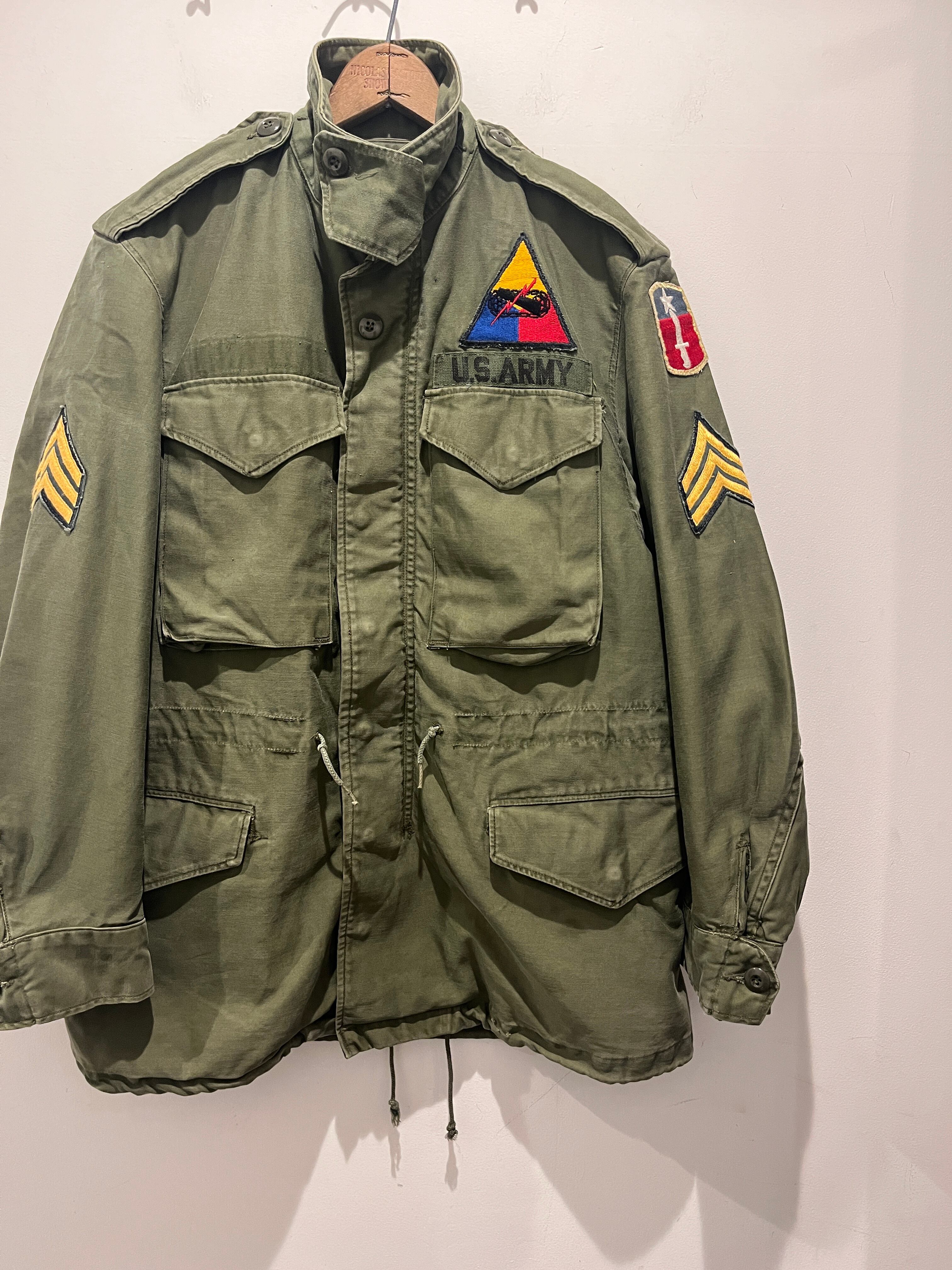50年代〜60年代アメリカ軍のMー1951フィールドジャケットです。1951年からMー65が登場するまで軍で採用された50年代を代表するUS ARMYのフィールドジャケット。こちらはコンマーのアルミジップにストームフラップ、ネームタグは外されていますが豪華なワッペンも付きます。ミルスペックは欠損していますが実寸でSMALL-SHORT位の良いサイズ感でダメージ等も少なくオススメなアイテムです。