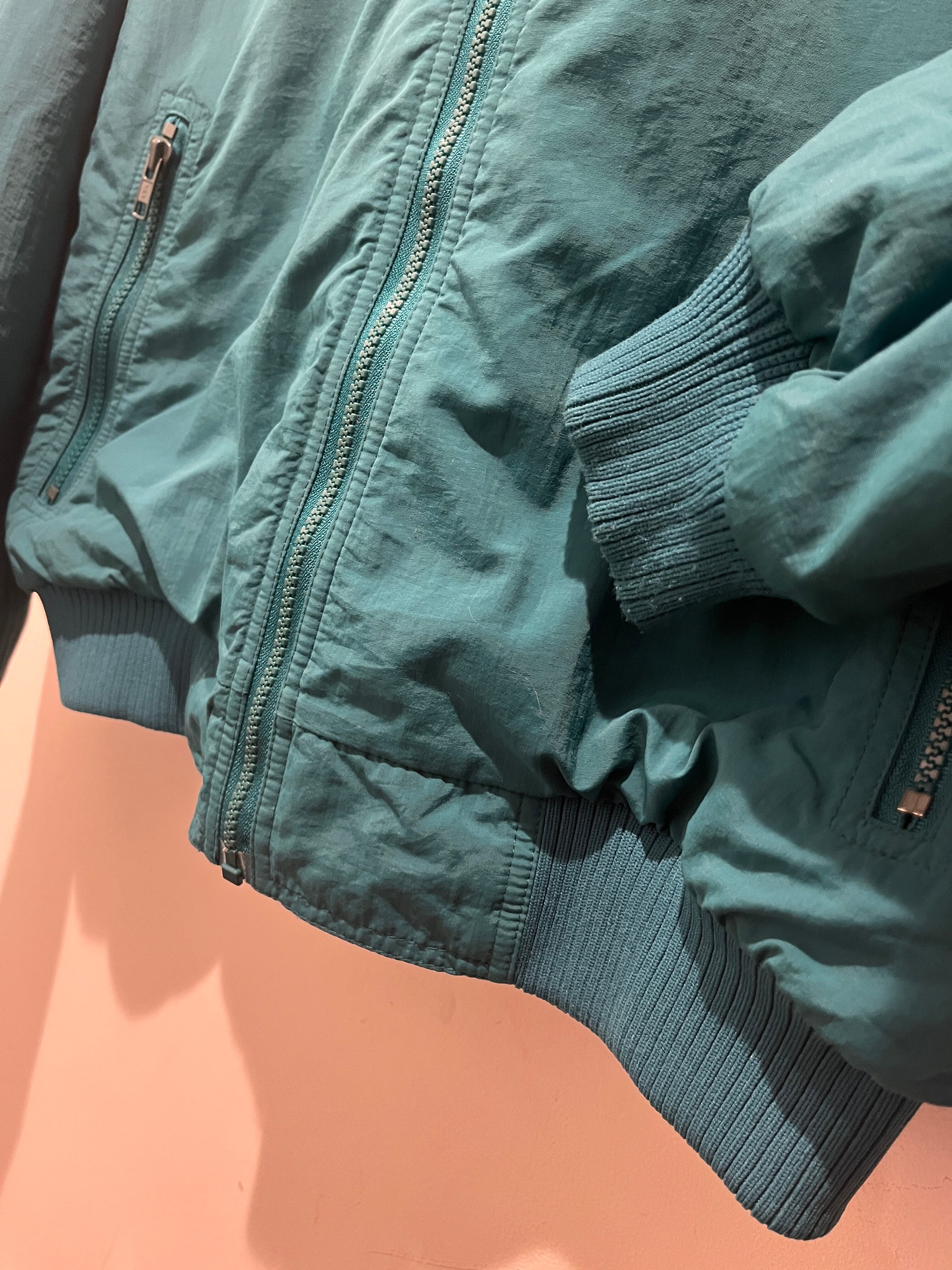 90年代アメリカ製エディーバウアーのナイロンジャケットです。グリーンカラーに胸の刺繍がブラックと配色も良くカッコイイ1着です。裏地がフリース仕様でWIND foilと風も防ぎ、温かさもあるのが最高ですね。身幅広めで着丈も短いシルエットとユニセックスでオススメなアウターです。