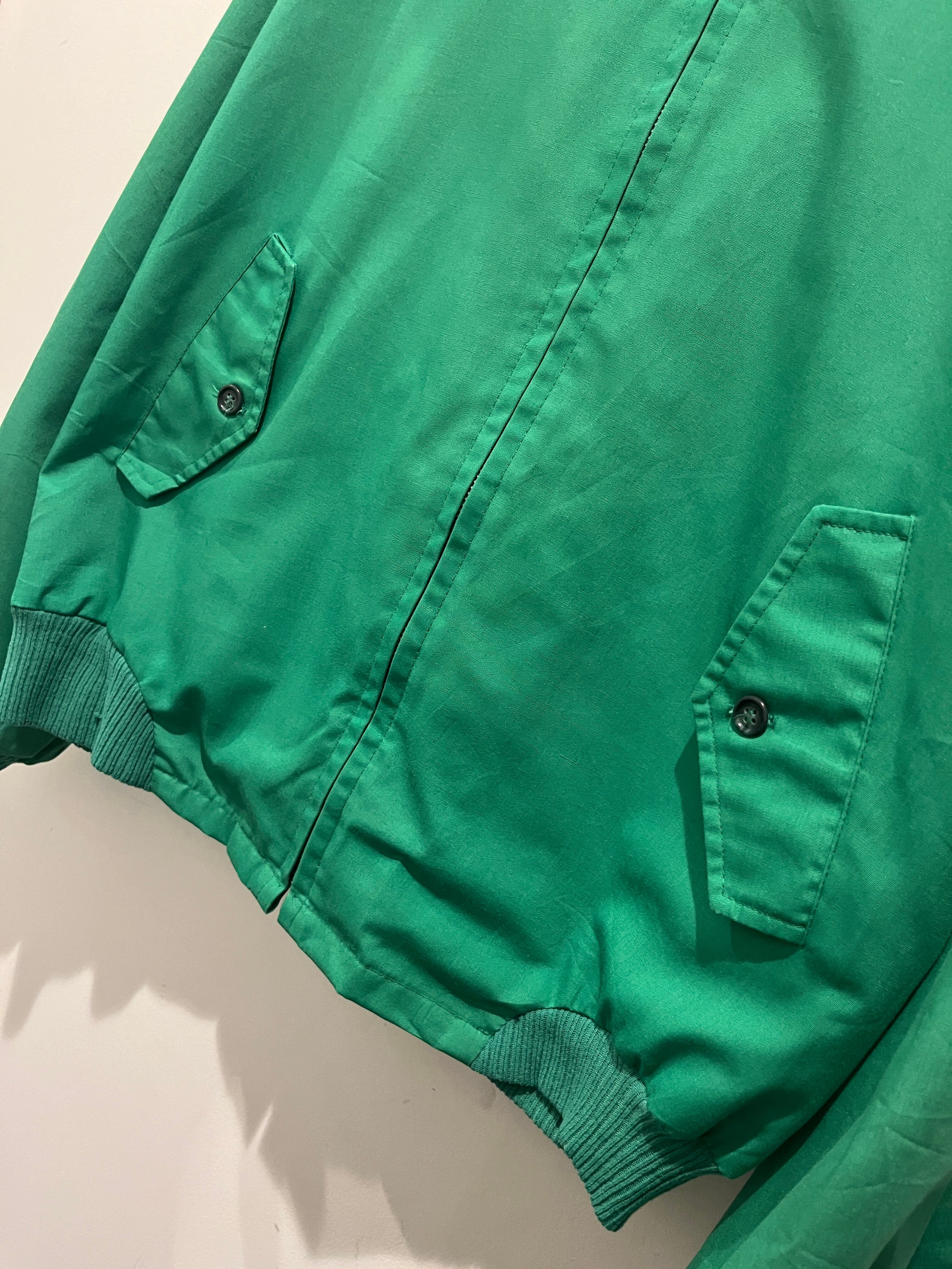 70年代SirJacのハリントンジャケットです。ベージュカラーなネイビーカラーが多い印象ですがこちらは珍しいグリーンカラーのハリントンジャケットとなります。裏地のナイロンもグリーンで統一されているのもポイントです。サイズも大きめな46で着丈短めの身幅がゆったりなシルエットもとても良いですね。ラグランスリーブで肩の落ち感もあり着用しやすくオススメです。