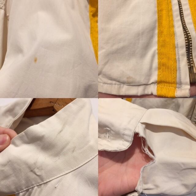 画像の通り左袖口に裂け、しみ、薄汚れ箇所がございますが着用には特に問題無い感じです。Vintegae商品としてはまだ良いコンディションです。