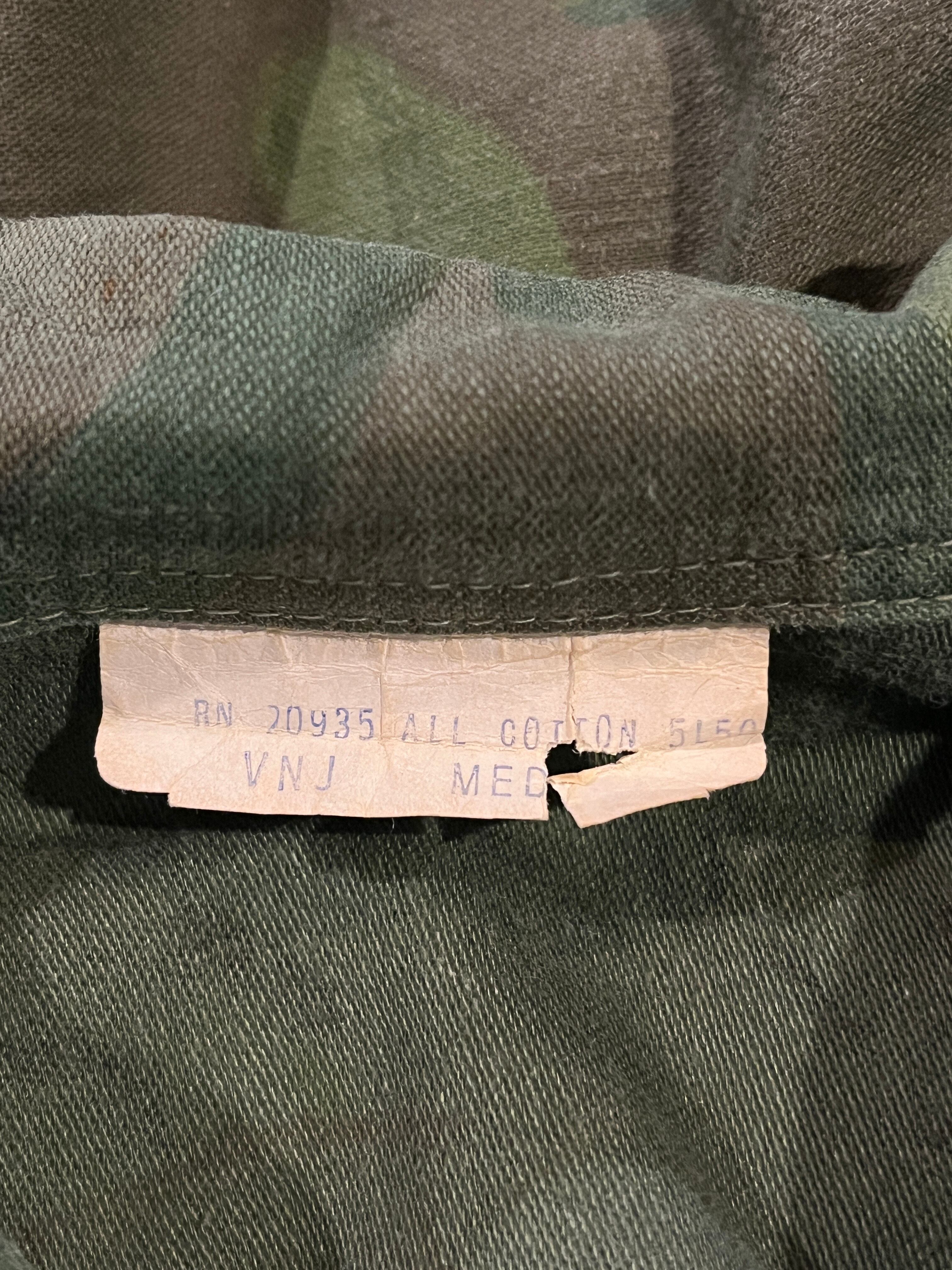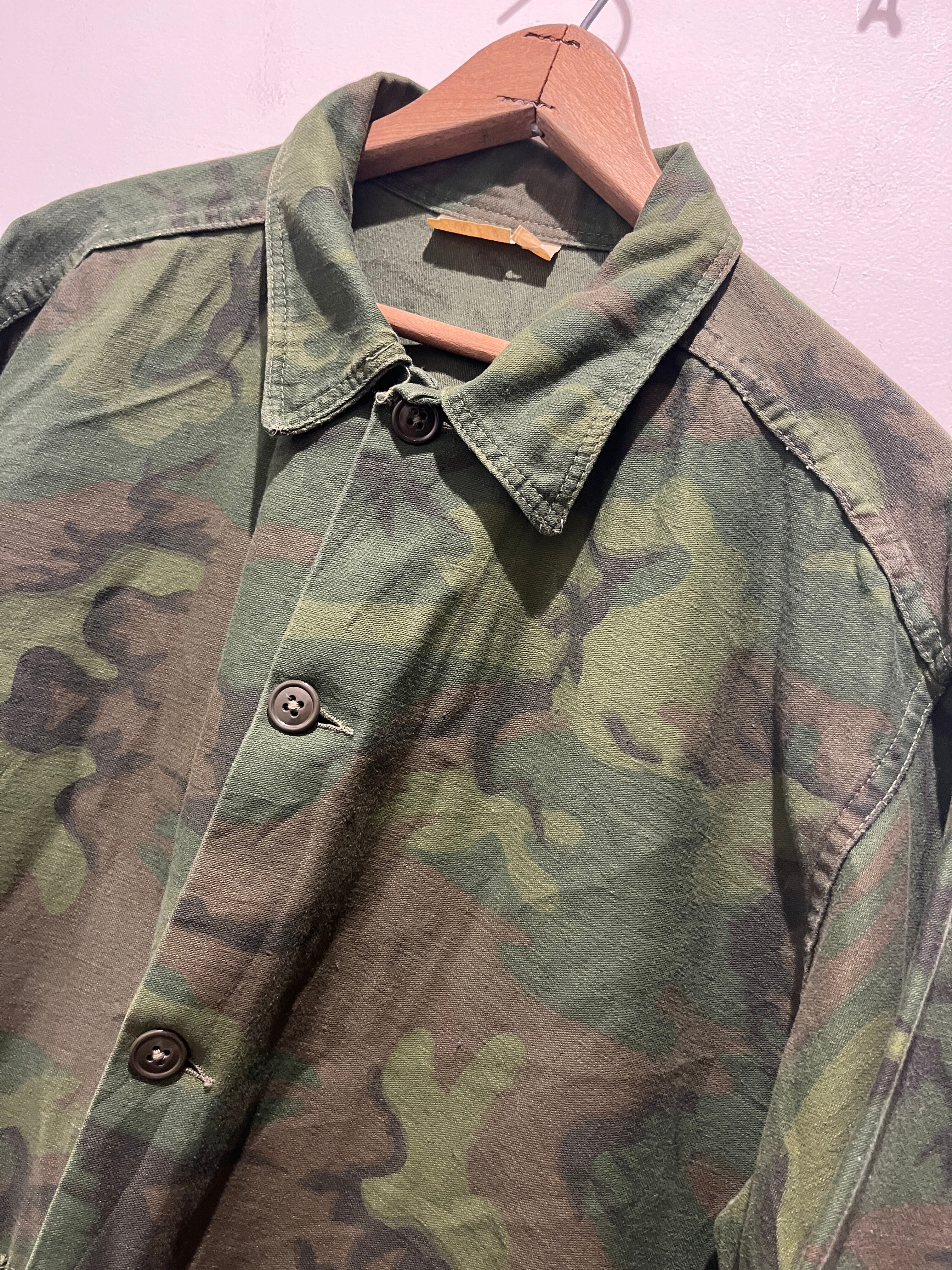 60年代シビリアンリーフのジャケットです。ベトナム戦争時に軍事顧問団や特殊部隊が物資不足を補うためにアメリカ本土から生地を送ってもらって戦地で使っていたというマニアックなアイテムであるシビリアンリーフ。こちらはかろうじてタグも残っている希少なアイテムとなります。フラップ付きのカバーオールの様なデザインがファッション性も高くとても良いですね。